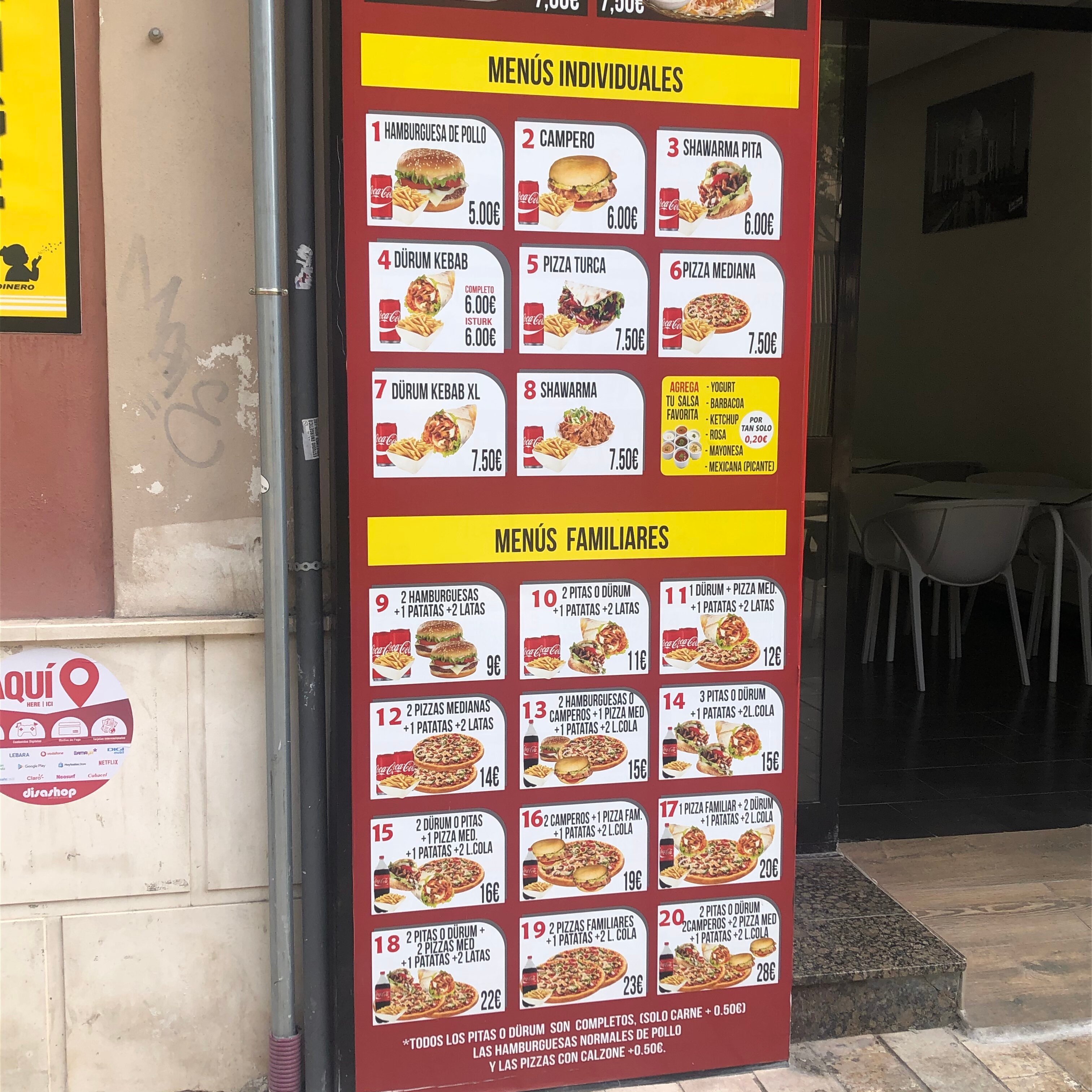 Carne de kebab, lechuga, cebolla, tomate y salsa yogurt.