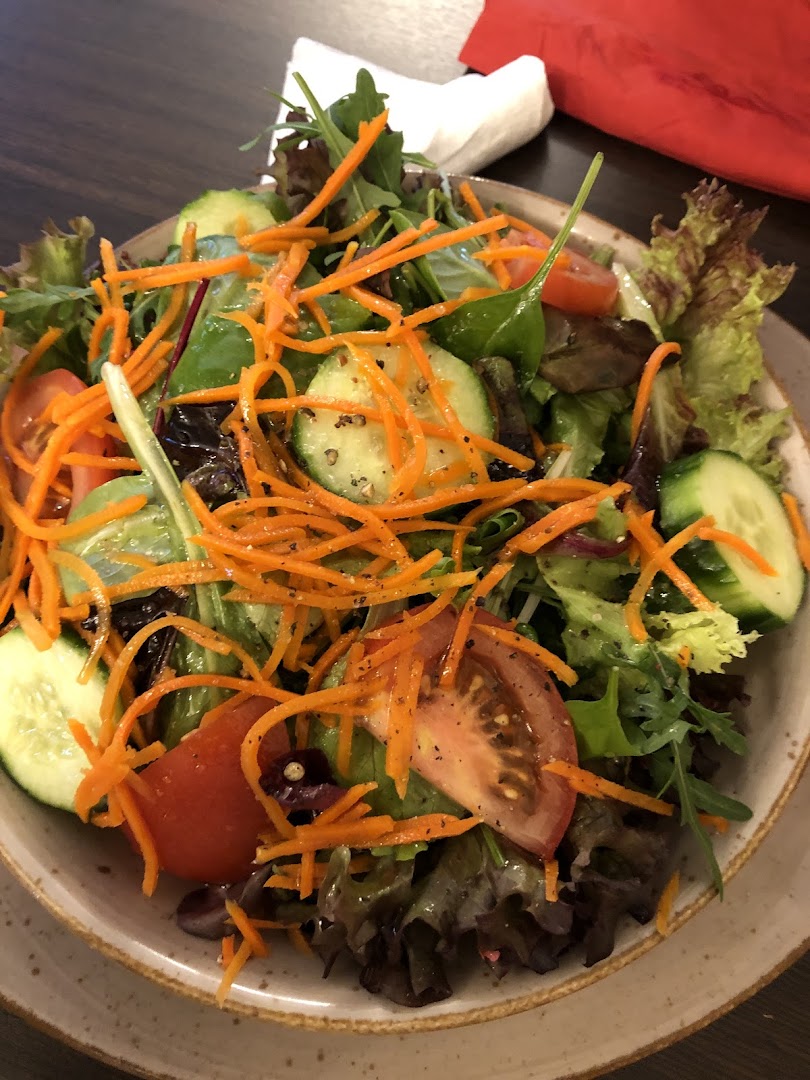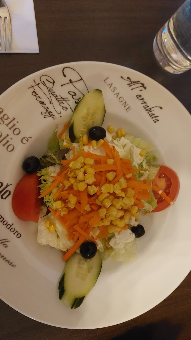Блюдо: Gemischter Salat (Vegetarisch). Описание блюда: Bunter Salat mit Tomaten, Gurken, Mais, Oliven und Karotten. Wird mit einem Dressing nach Wahl zubereitet.