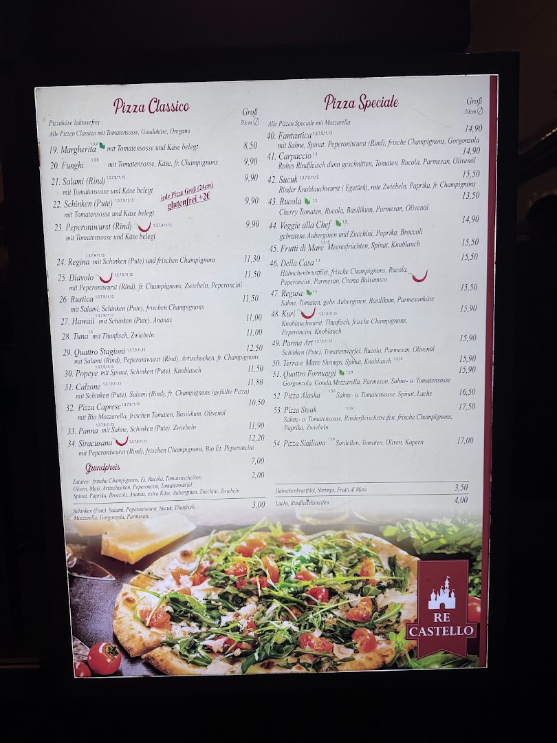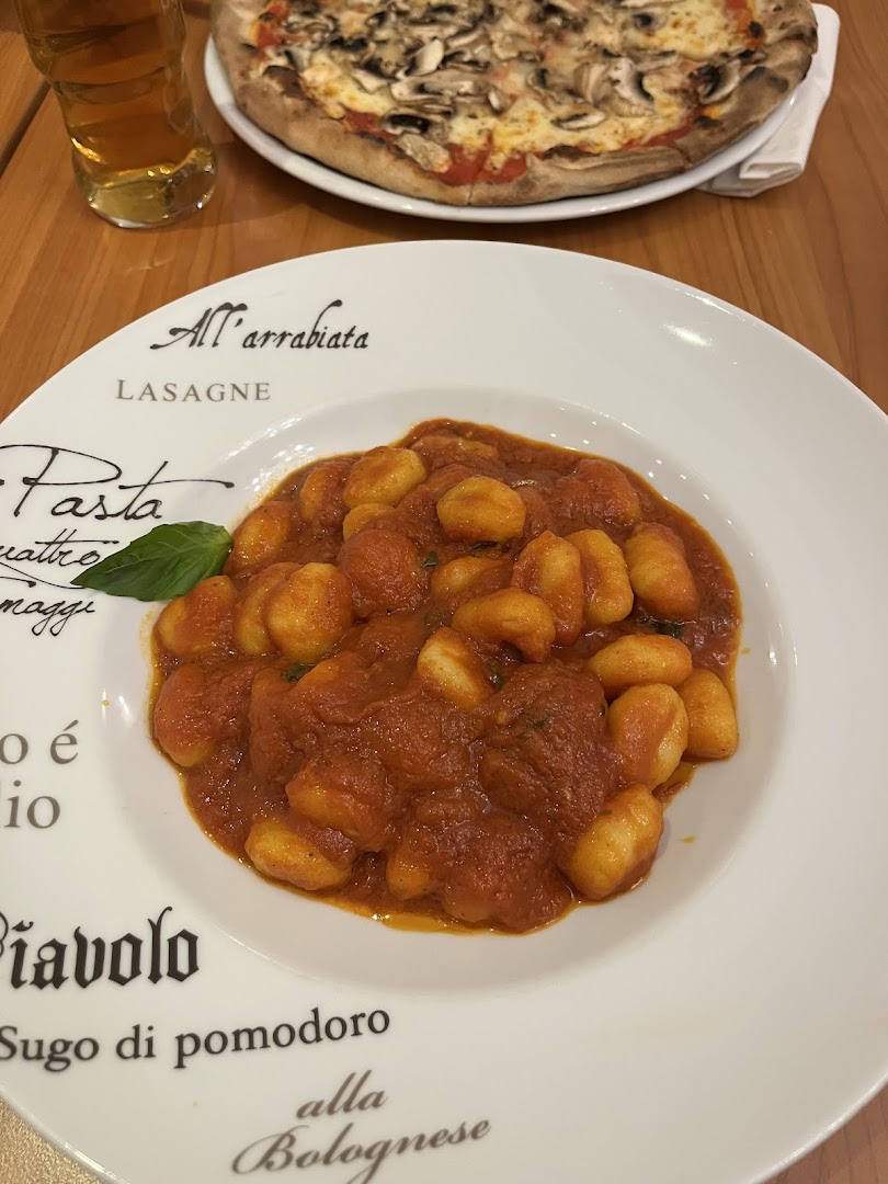 Блюдо: Pizza Diavolo (Scharf). Описание блюда: Mit Peperoniwurst, Champignons, Zwiebeln und scharfer Peperoni. Wird mit Tomatensauce, Gouda und Oregano zubereitet.