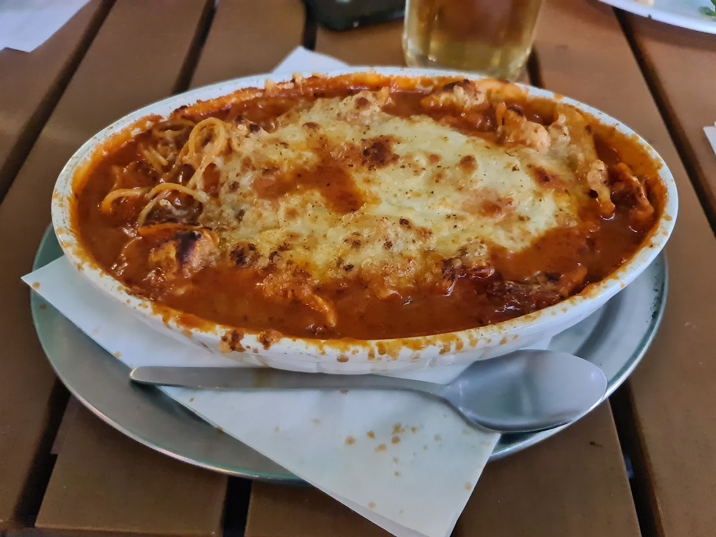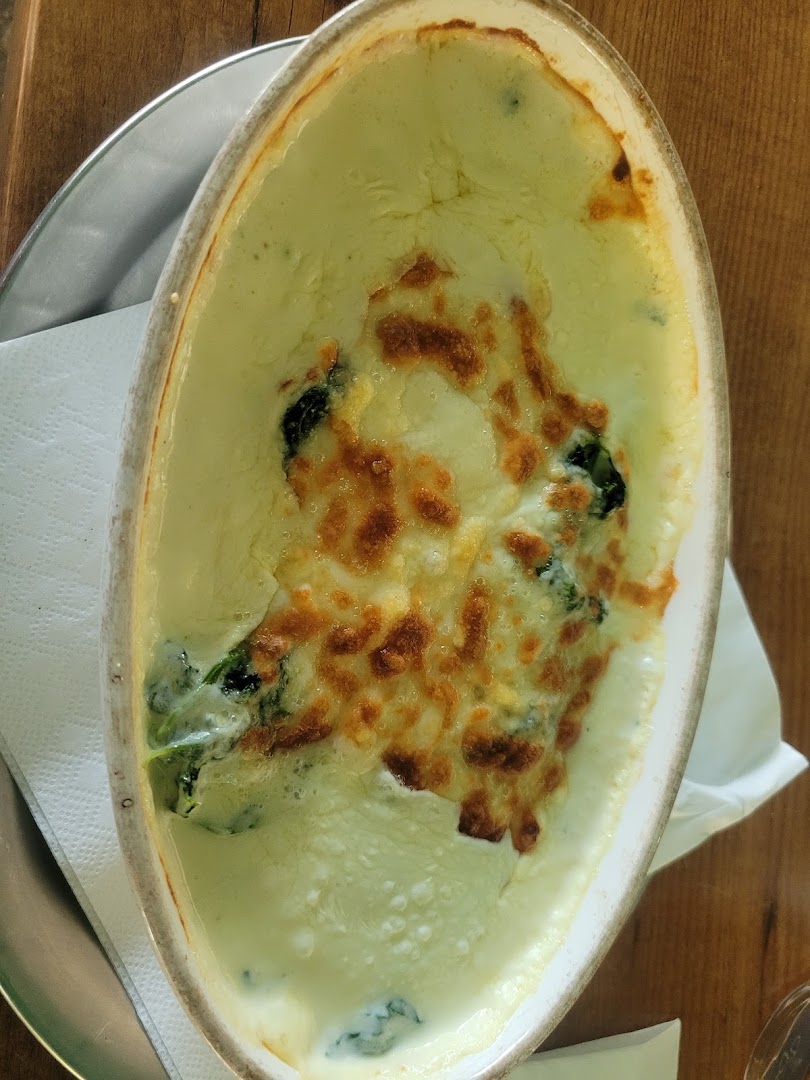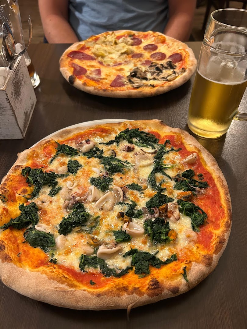 Блюдо: Pizza Fantastica. Описание блюда: Mit Sahne, Spinat, Peperoniwurst, Champignons und Gorgonzola. Wird mit Tomatensauce und Mozzarella zubereitet.
