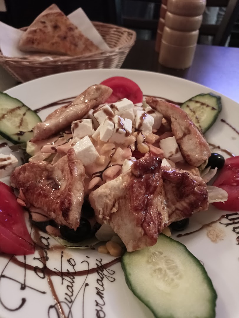 Блюдо: Pizza Quattro Formaggi (Vegetarisch). Описание блюда: Mit Gorgonzola, Gouda, Mozzarella, Feta und einer Sauce nach Wahl. Wird mit Tomatensauce und Mozzarella zubereitet.