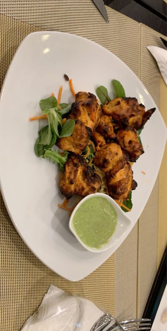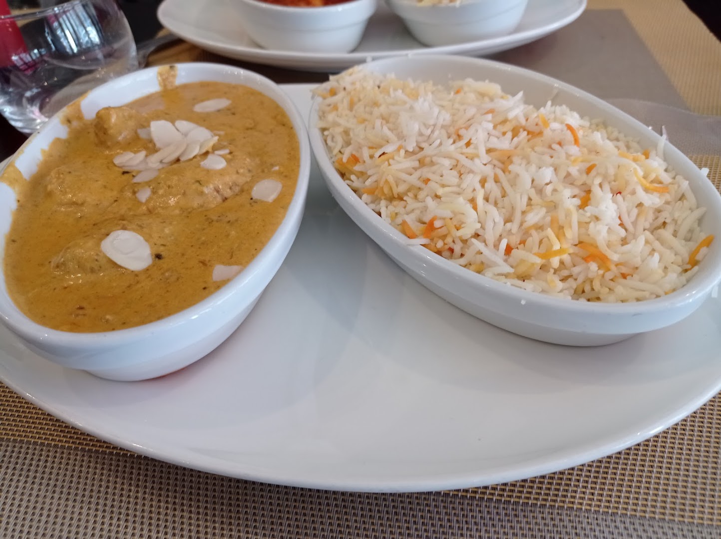 Блюдо: Poulet korma. Описание блюда: Poulet cuit dans une sauce avec poudre d'amande, noix de cajou, noix de coco et crème. Servi avec 1 accompagnement au choix.