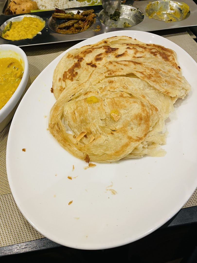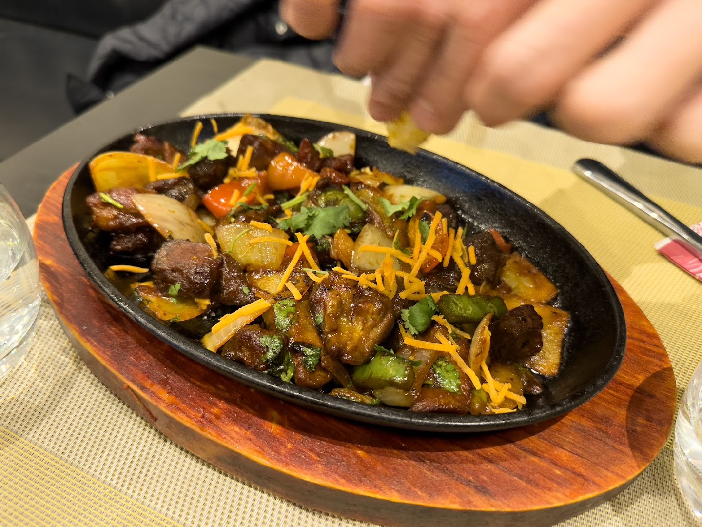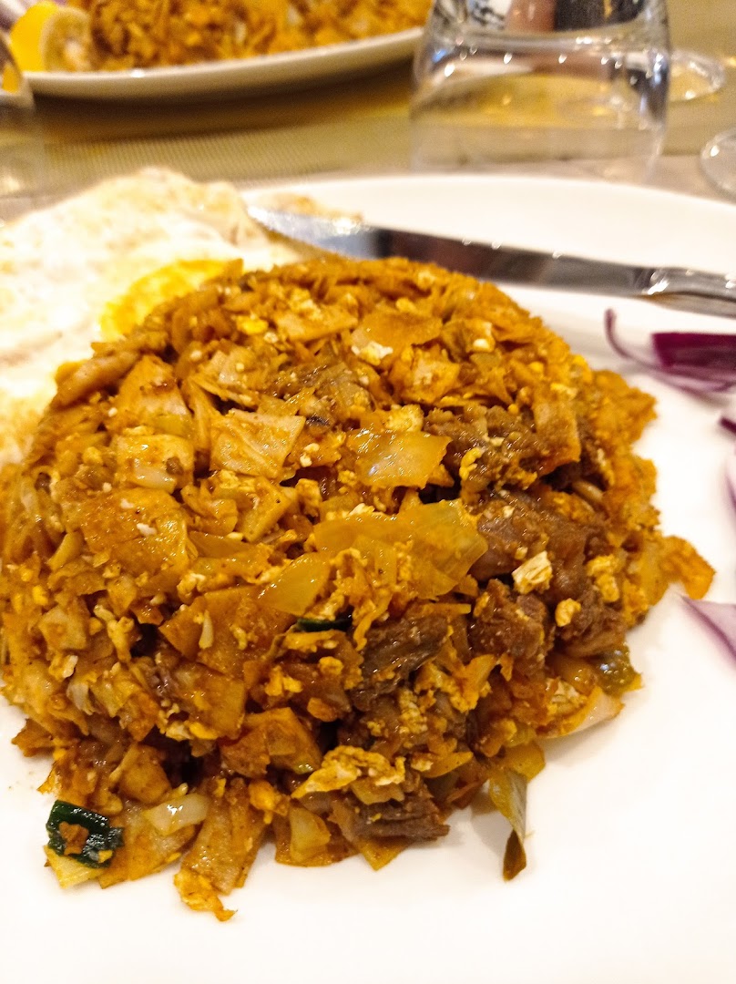 Блюдо: Kottu bœuf. Описание блюда: Curry de bœuf, pain indien en dès sauté avec des œufs brouillés, oignons, piments verts, poireaux et épices indiennes. Servi avec œuf au plat.