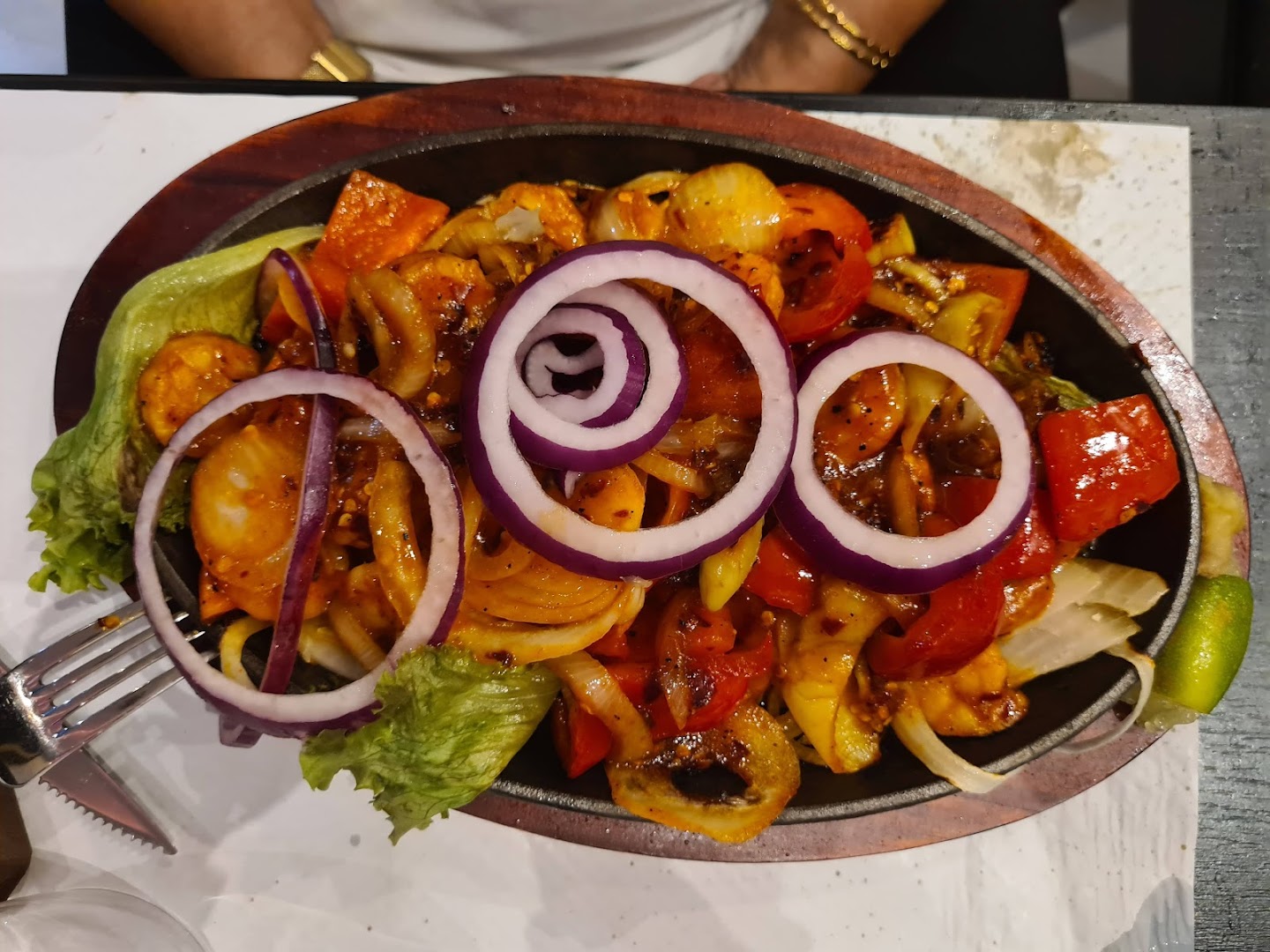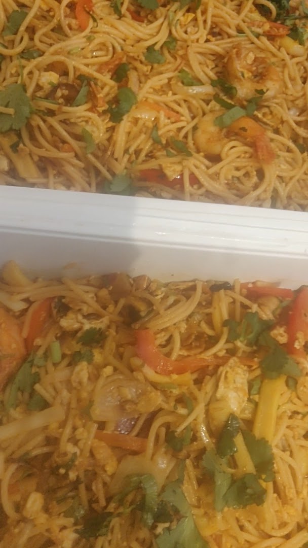 Блюдо: Nouille aux crevettes. Описание блюда: Nouille sauté à l'œuf, crevettes, poireaux, tomates, poivrons, choux blancs et sauce massala spécialité du chef.