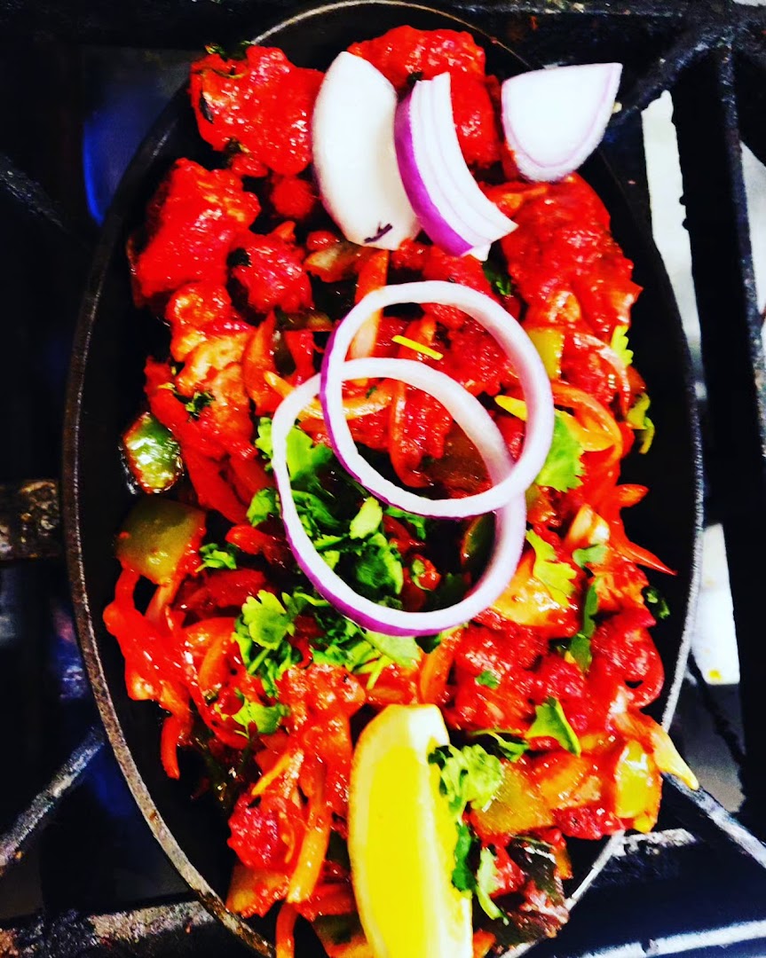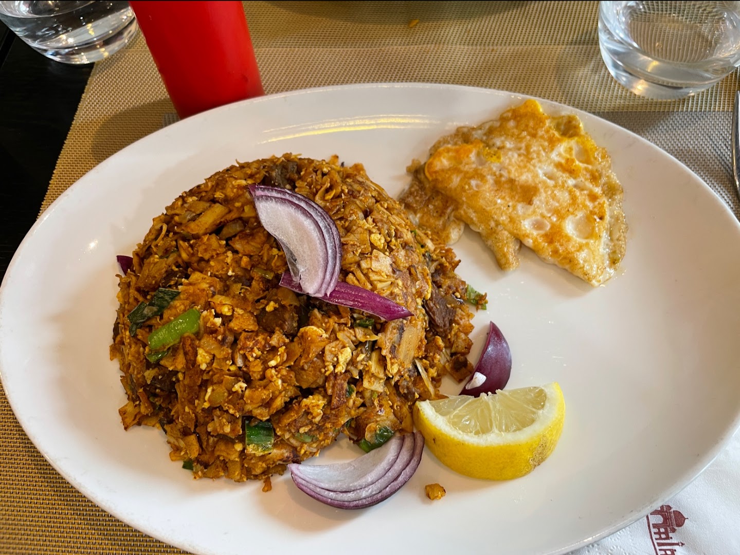 Блюдо: Kottu poulet. Описание блюда: Curry de poulet, pain indien en dès sauté avec des œufs brouillés, oignons, piments verts, poireaux et épices indiennes. Servi avec œuf au plat.