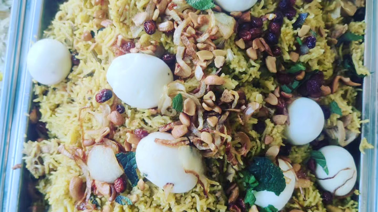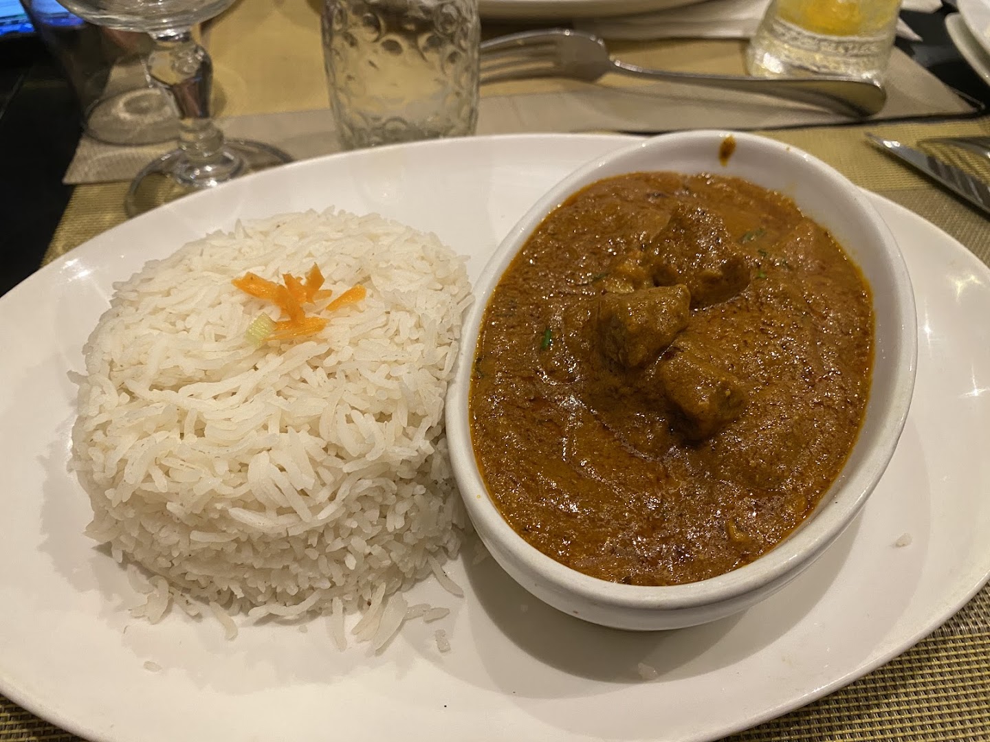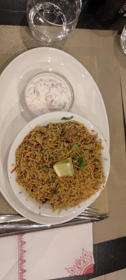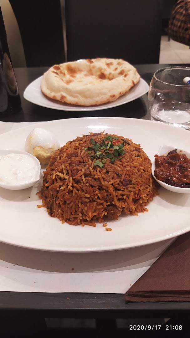 Блюдо: Biryani agneau. Описание блюда: Morceaux d'agneau mijotés avec riz parfumé, petits pois, oignons, tomates, ghee et ses épices. Servi avec raïta et œuf dur.