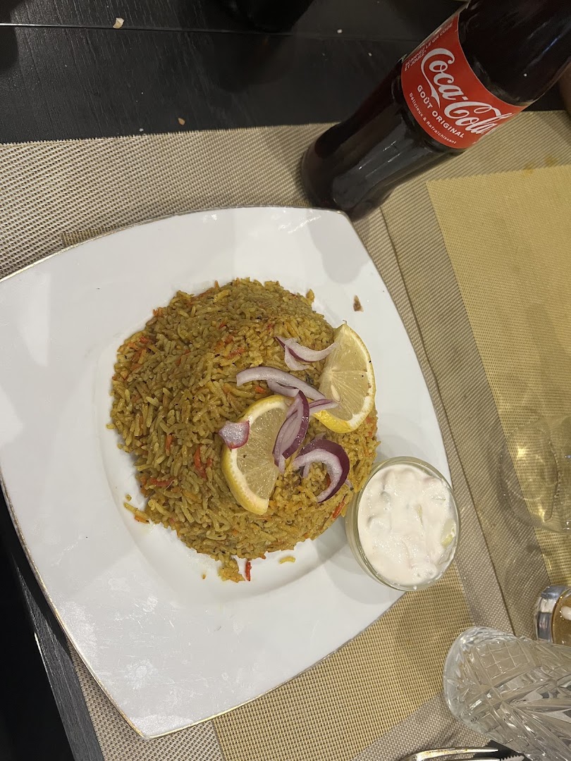 Блюдо: Biryani bœuf. Описание блюда: Morceaux de bœuf mijotés avec riz parfumé, petits pois, oignons, tomates, ghee et ses épices. Servi avec raïta et œuf dur.