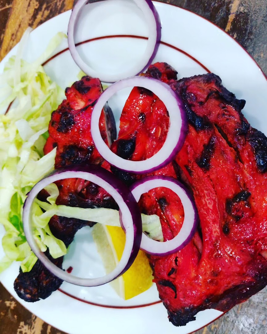 Блюдо: Biryani poulet. Описание блюда: Morceaux de poulet mijotés avec riz parfumé, petits pois, oignons, tomates, ghee et ses épices. Servi avec raïta et œuf dur.