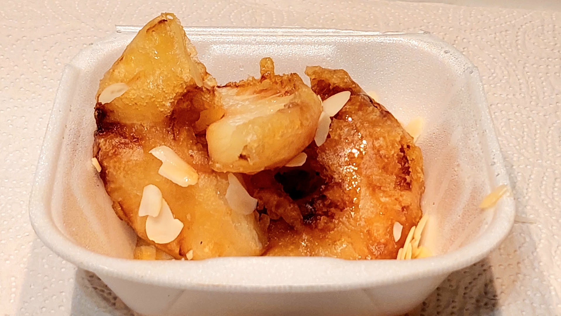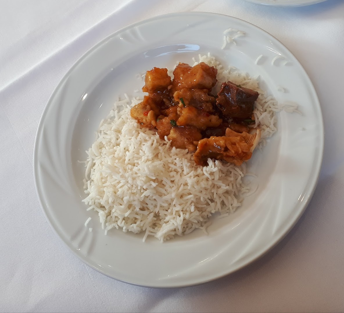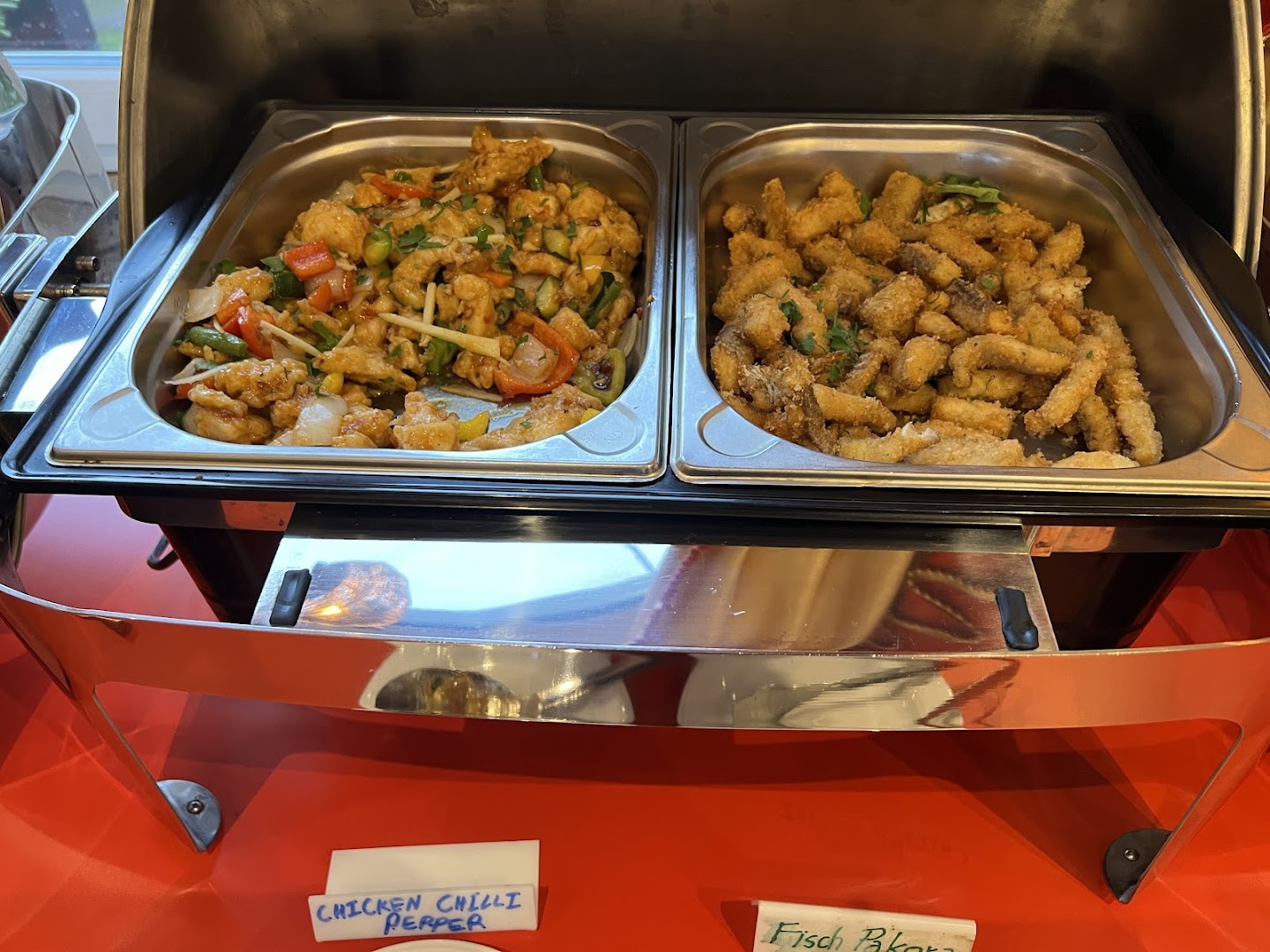 Блюдо: Punjabi Chili Chicken. Описание блюда: Panierte Hähnchenstücke mit Paprika, Zwiebeln, Ingwer, Knoblauch, Süß-Sauer-Sauce, nach nordindischer Art scharf gewürzt und in der heißen Pfanne serviert.