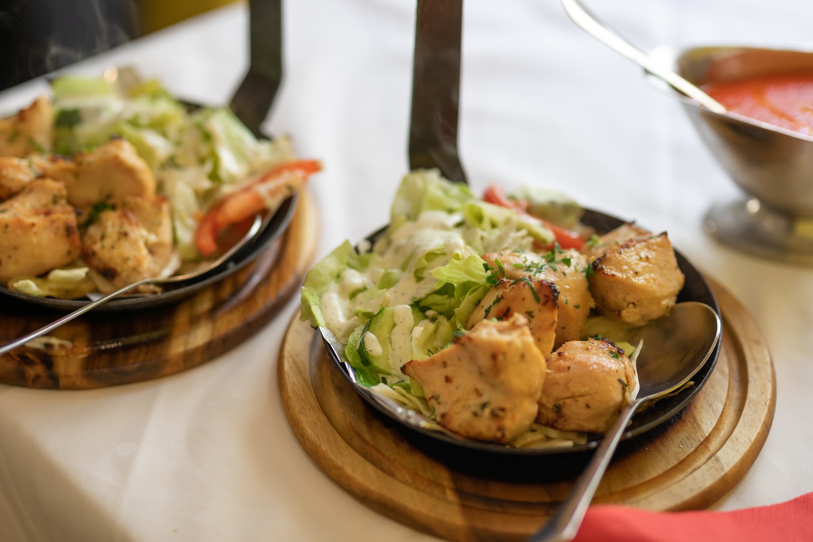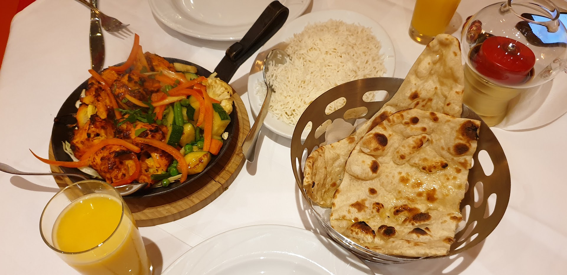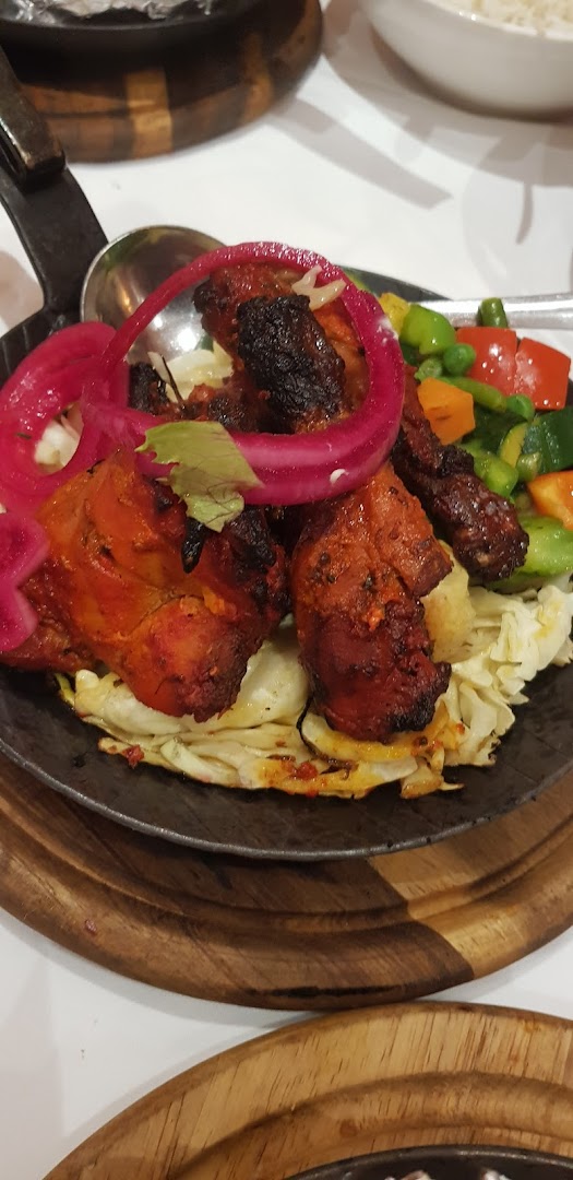 Блюдо: Tandoori Mix. Описание блюда: Zusammenstellung aus verschiedenen Tandoori-Spezialitäten mit Salatbeilage. Wird im indischen Lehmofen gegrillt und mit Naan serviert.