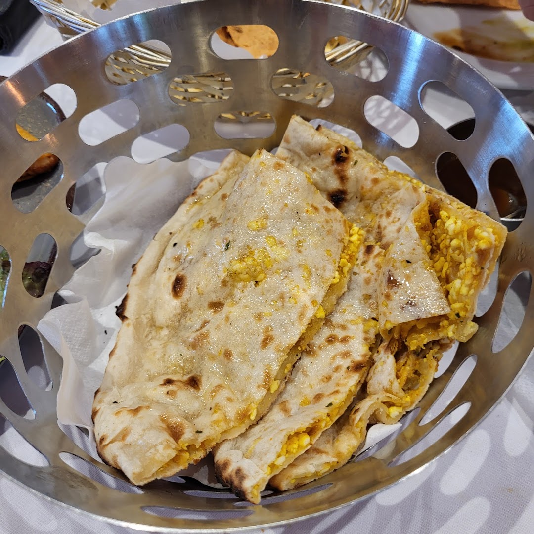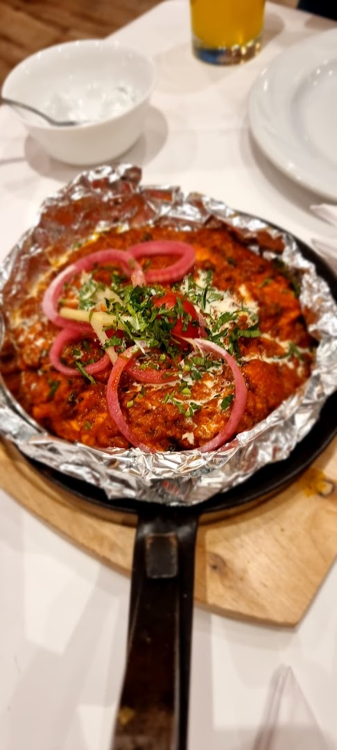 Блюдо: Kadhai Paneer. Описание блюда: Hausgemachter indischer Käse gebraten in Currysauce mit Tomaten und Zwiebeln. Wird mit Gartengemüse zubereitet und mit Safran-Basmatireis serviert.