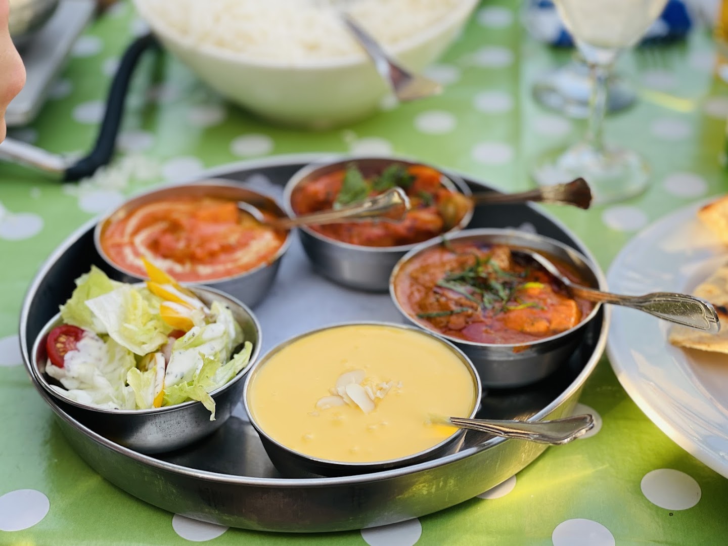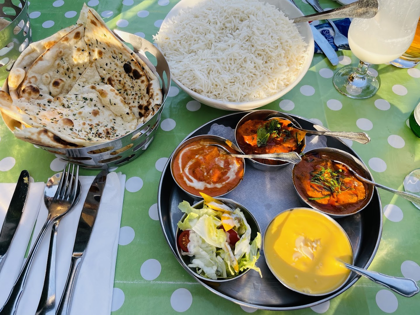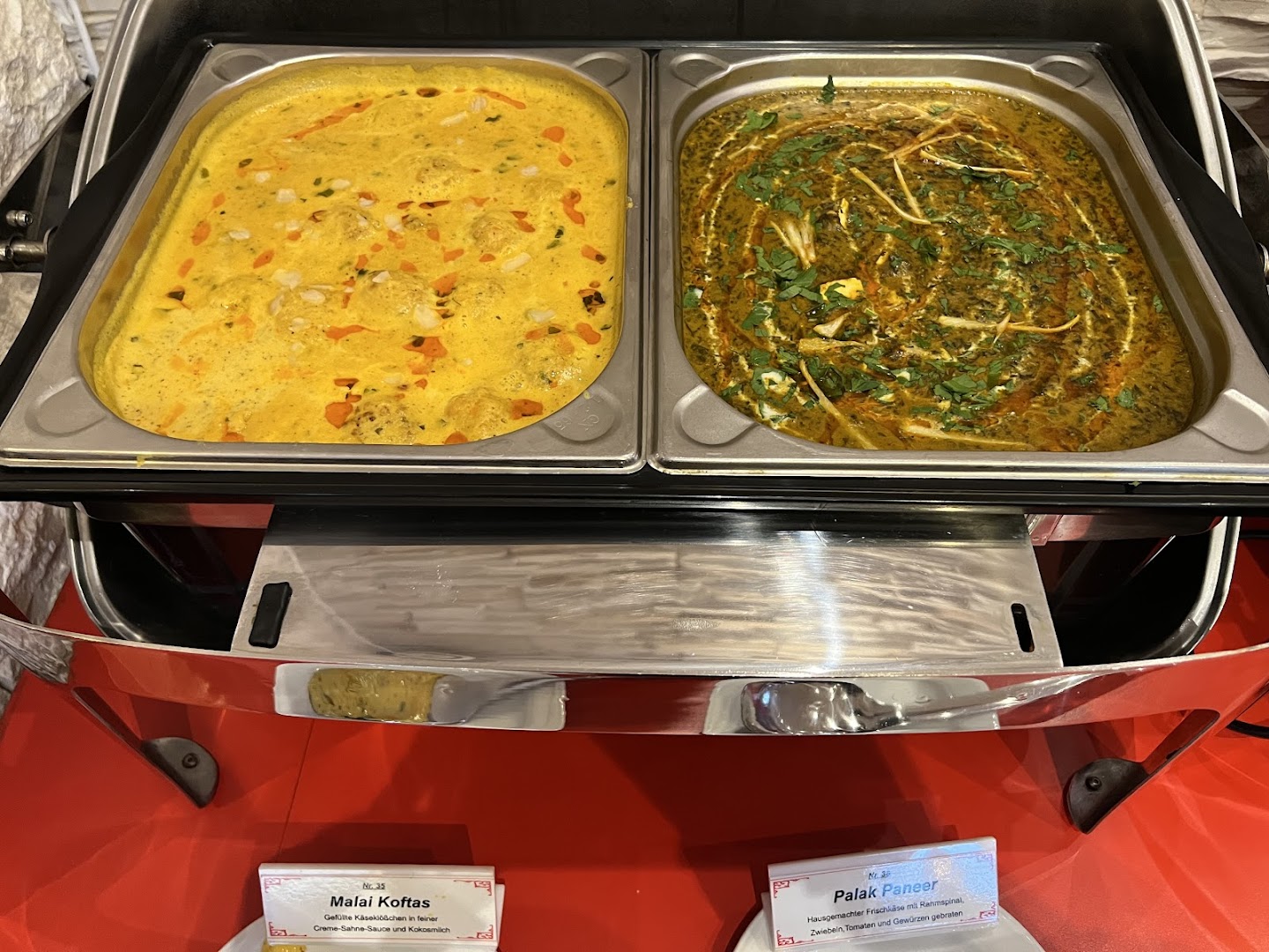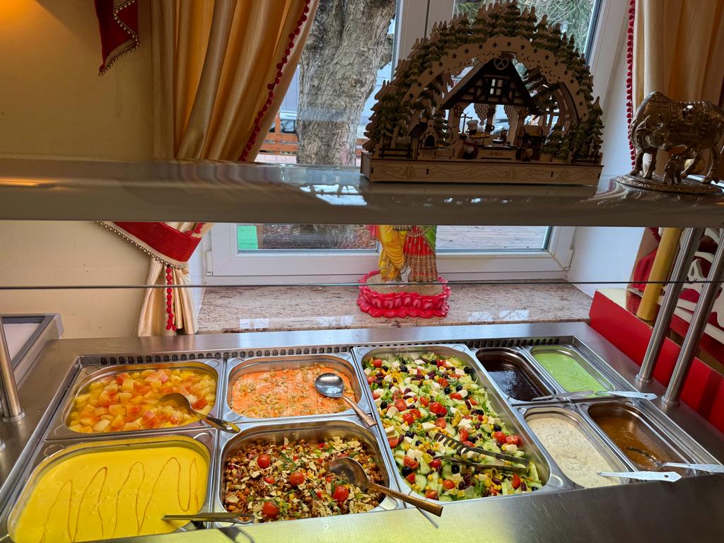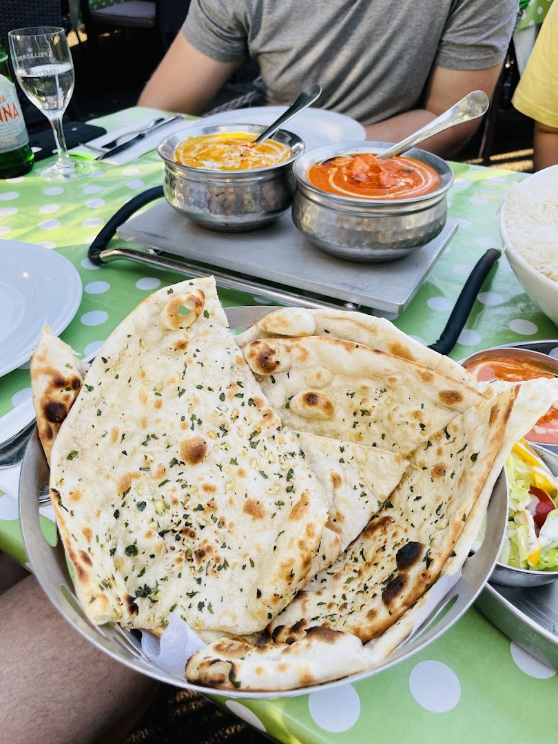 Блюдо: Palak Paneer. Описание блюда: Hausgemachter Frischkäse mit Rahmspinat, Zwiebeln, Tomaten, Joghurt und Gewürzen gebraten. Wird mit Gartengemüse zubereitet und mit Safran-Basmatireis serviert.