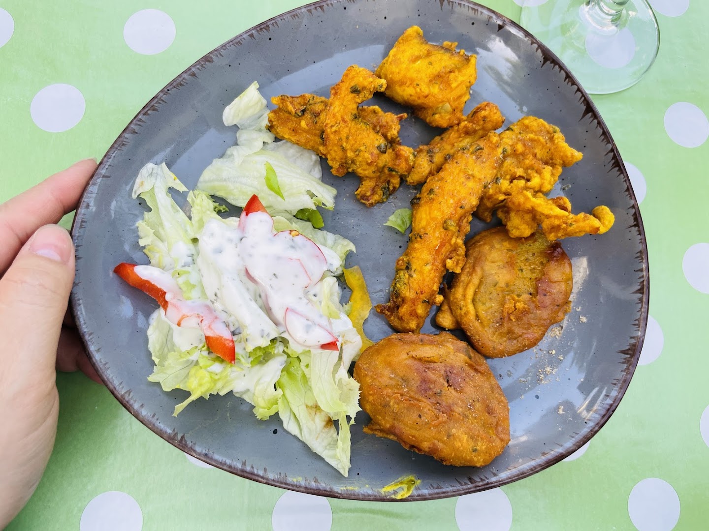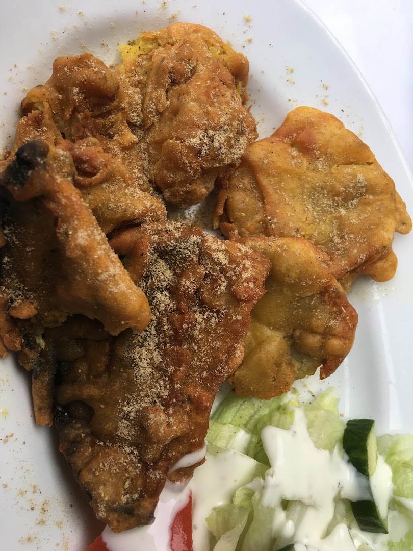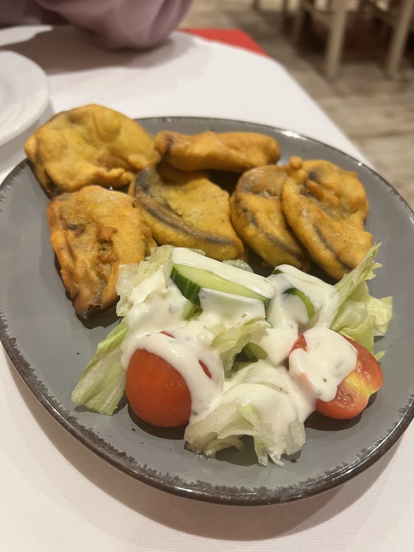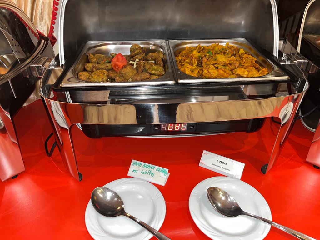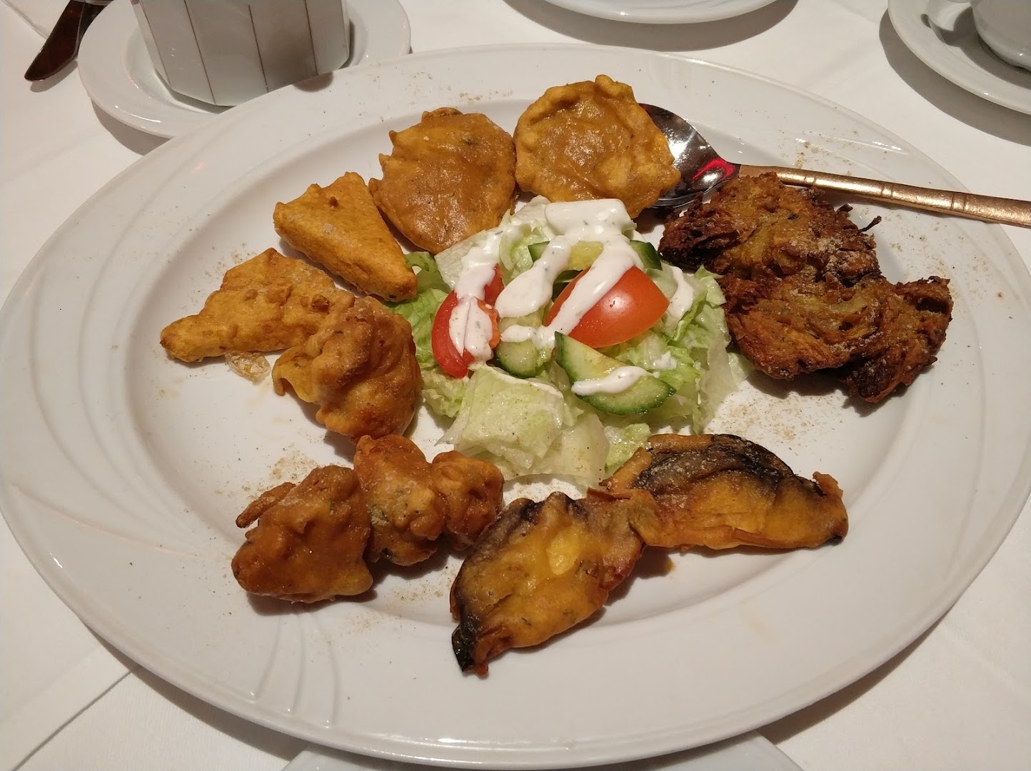 Блюдо: Gemischter Vorspeisen (für 2 Personen). Описание блюда: Mit einem Stück Onion Bhaji, in Kichererbsenmehl gebackene Zwiebelkugel, Fisch, Aubergine, Hähnchen, Kartoffel und Blumenkohl. Wird mit Mangosauce, Minzsauce und Tamarindensauce serviert.
