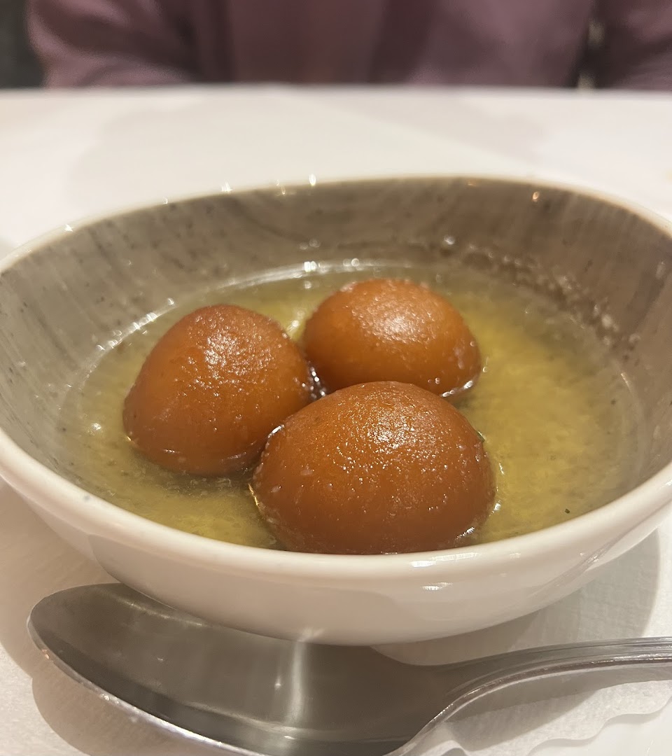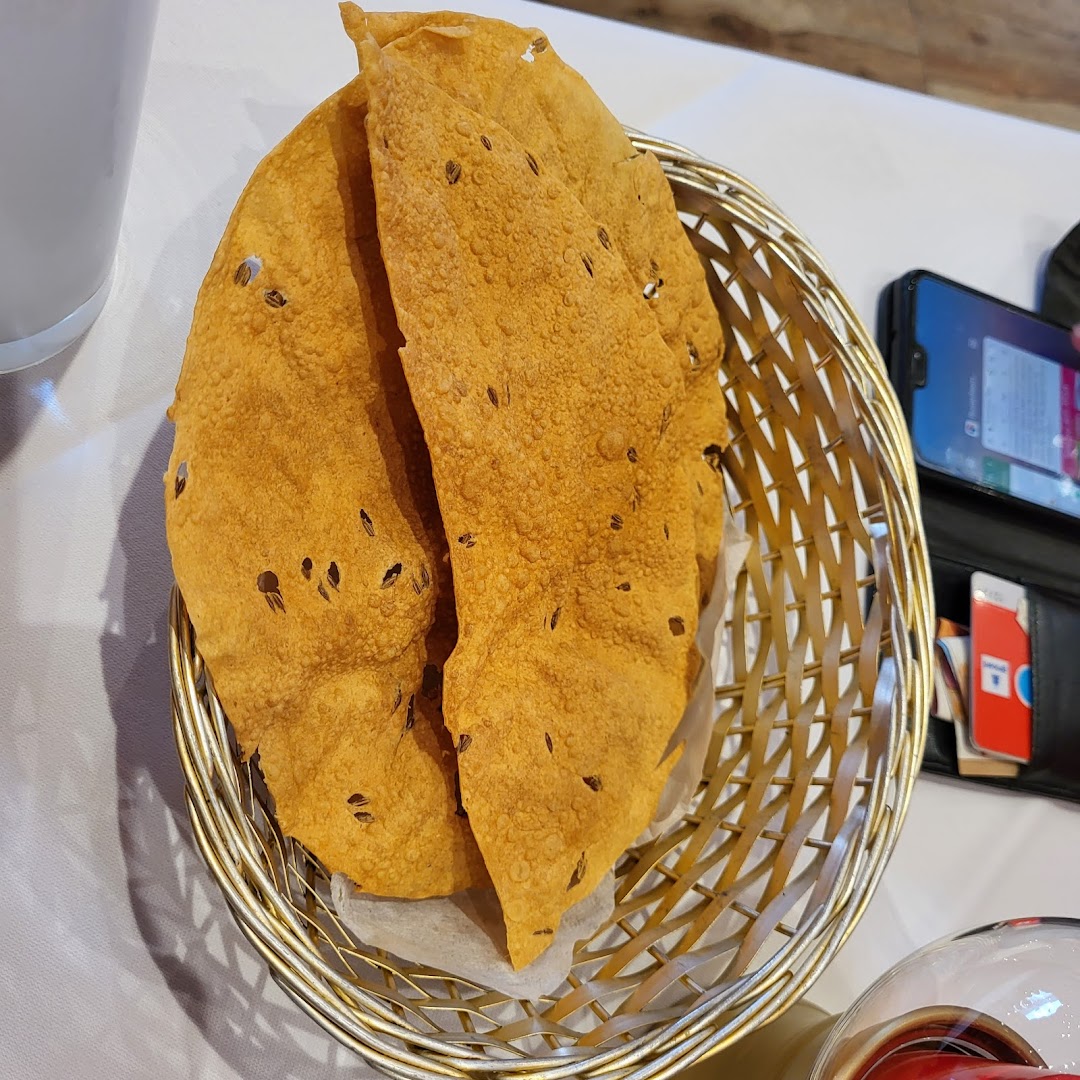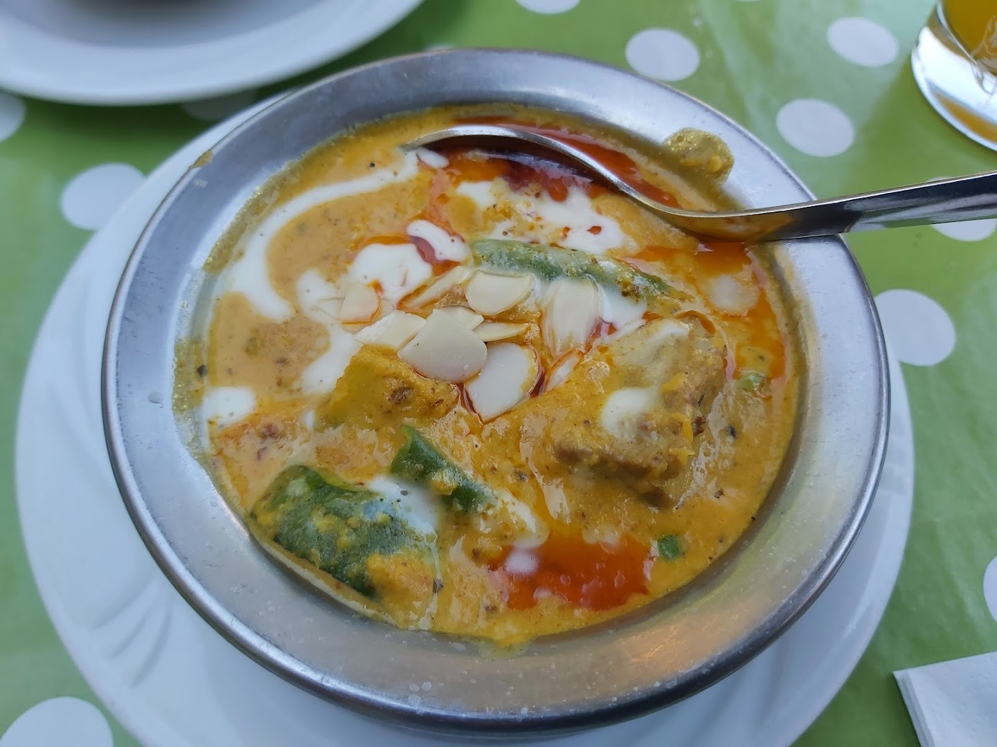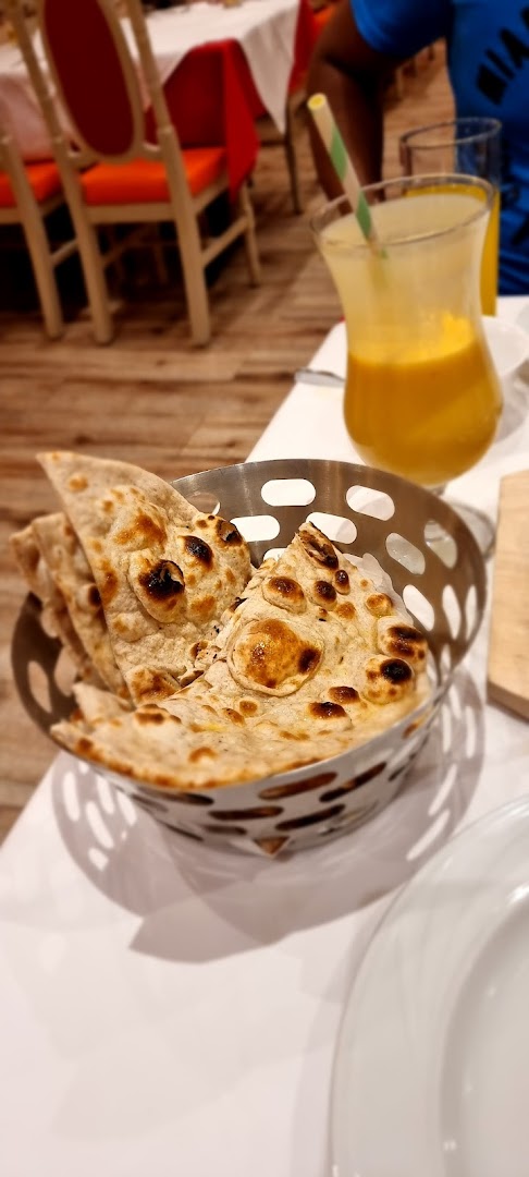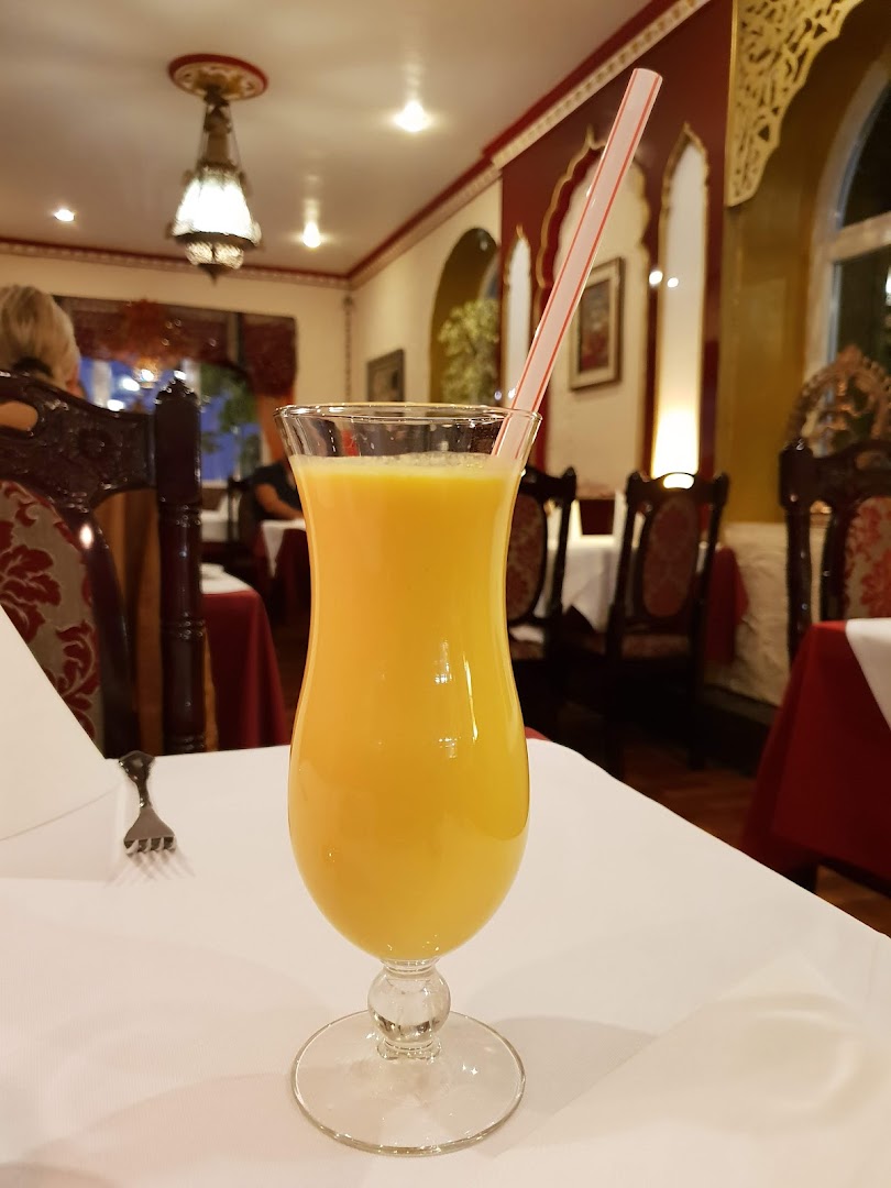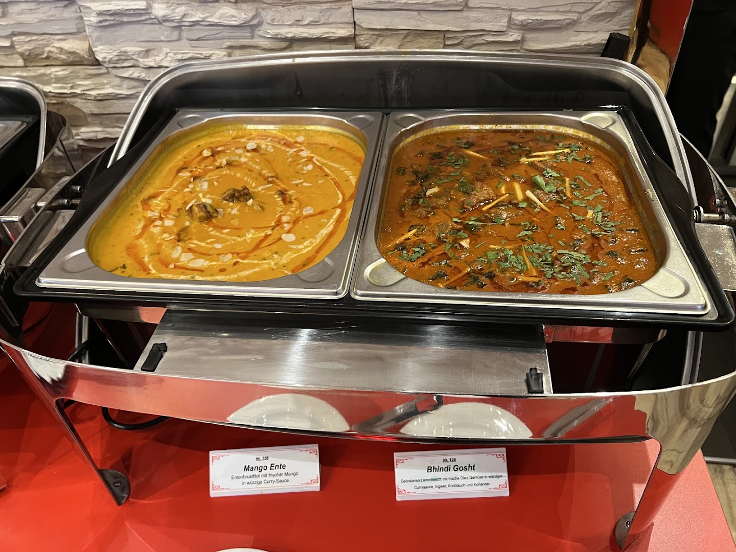 Блюдо: Mango Ente. Описание блюда: Mariniertes, gegrilltes Entenbrustfilet mit frischer Mango-Sahnesauce, würziger Currysauce, Ingwer, Knoblauch und frischem Koriander. Wird für 12 Stunden eingelegt und im Tandoor zubereitet.