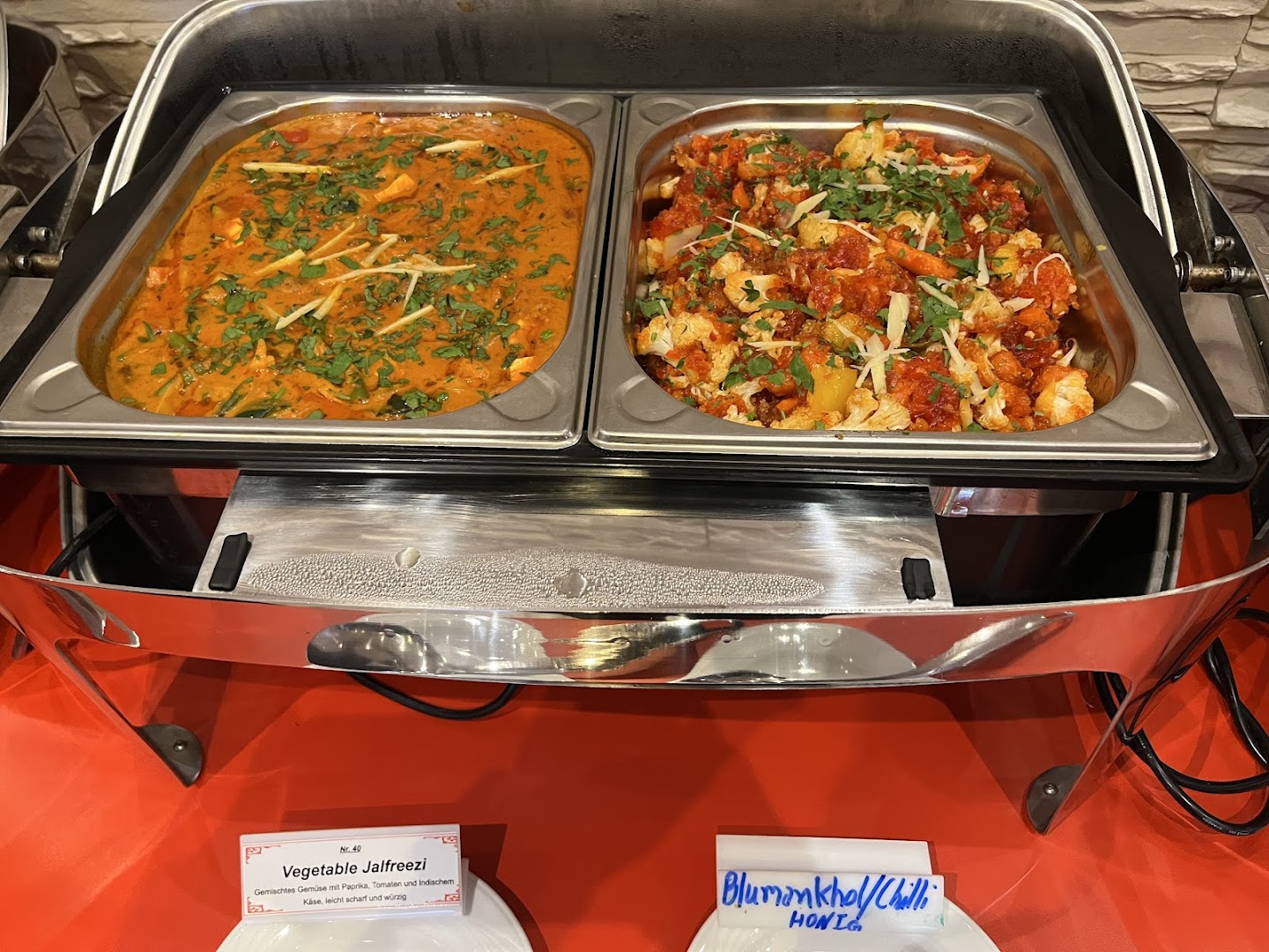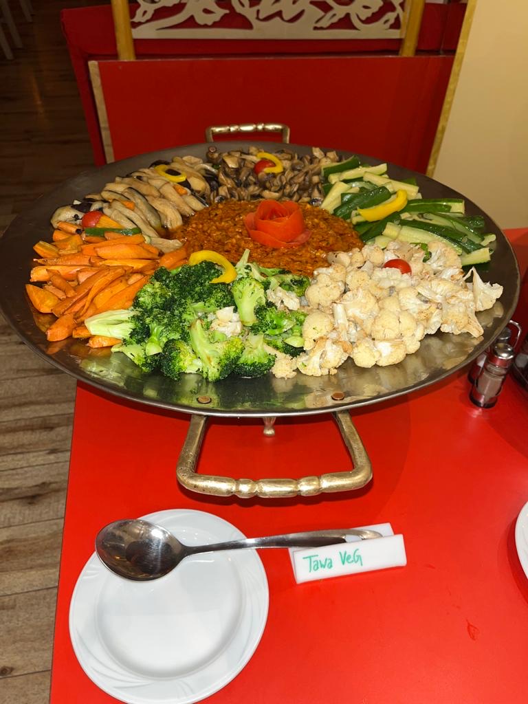 Блюдо: Vegetable Jalfrezi. Описание блюда: Gemischtes Gemüse mit Paprika, Tomaten und indischem Käse. Wird mit Gartengemüse zubereitet und mit Safran-Basmatireis serviert.