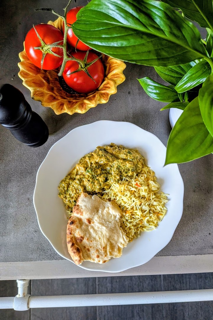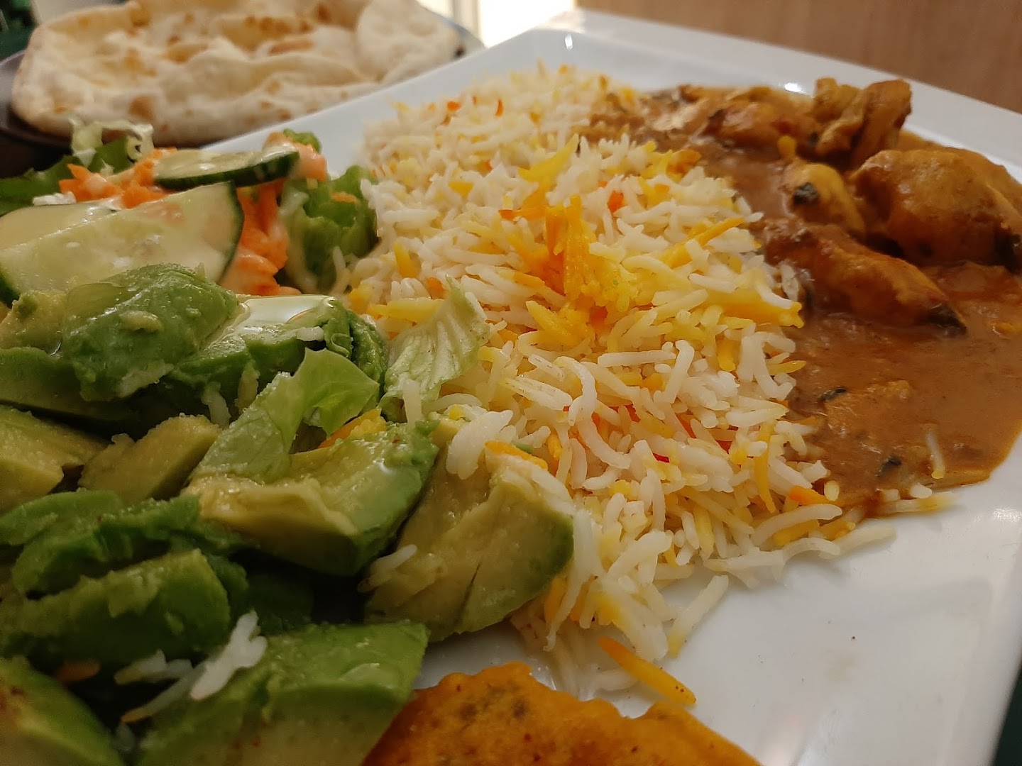 Блюдо: Biryani poulet. Описание блюда: Poulet désossé cuit avec du riz basmati, crème fraîche, safran du Cachemire, noix de coco, amandes, raisins secs, sauce au curry et coriandre.