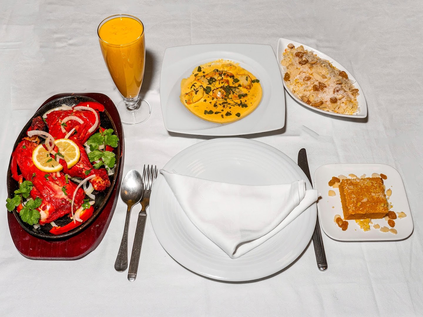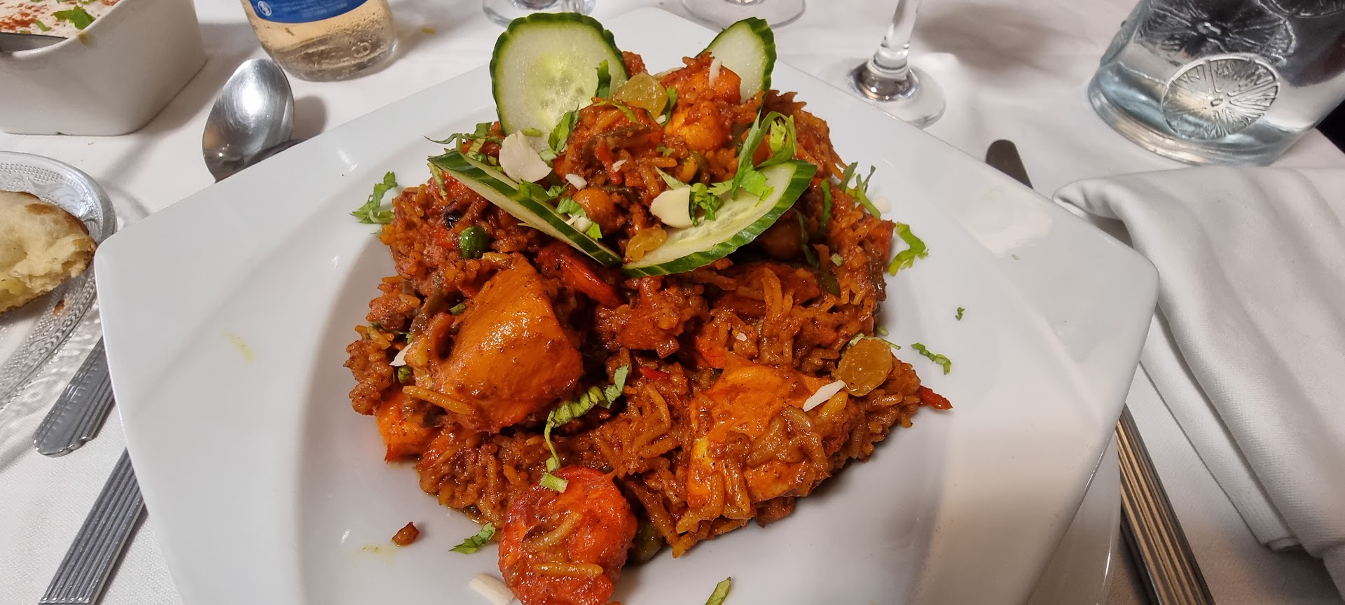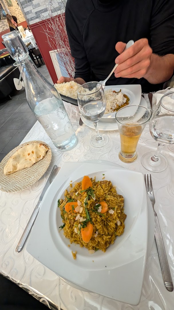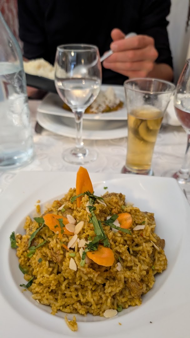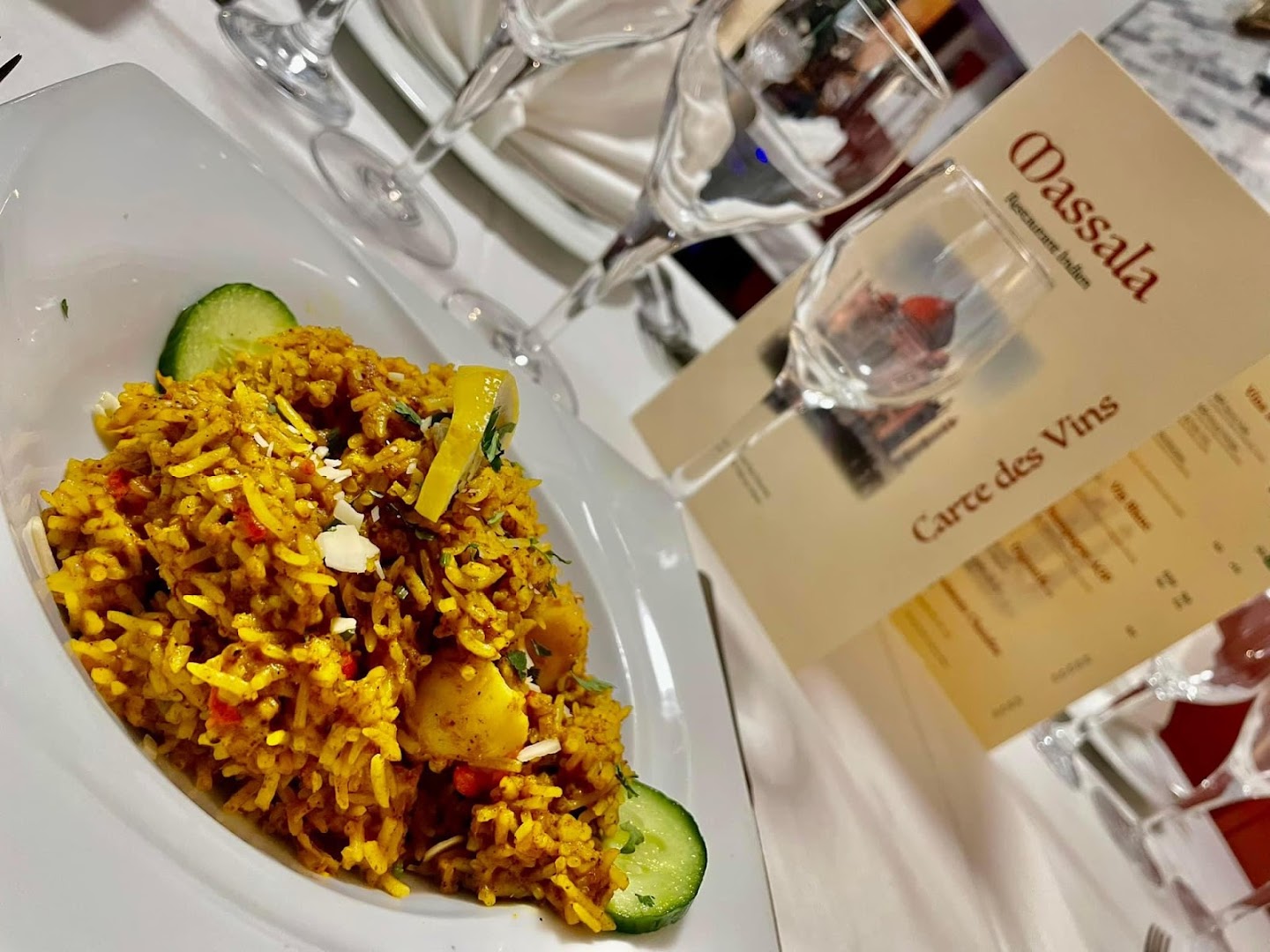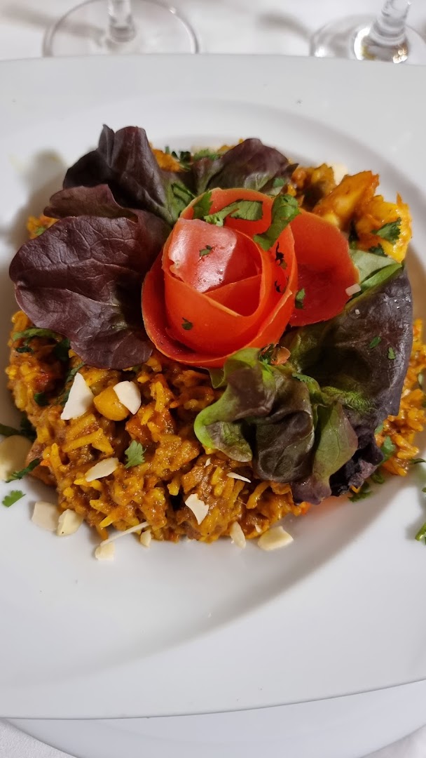 Блюдо: Biryani royal. Описание блюда: Gigot d'agneau, poulet désossé, crevettes décortiquées cuits avec du riz basmati, crème fraîche, safran du Cachemire, noix de coco, amandes, raisins secs, sauce au curry et coriandre.
