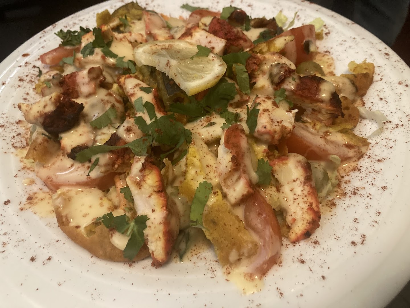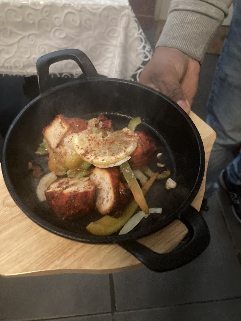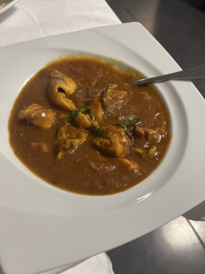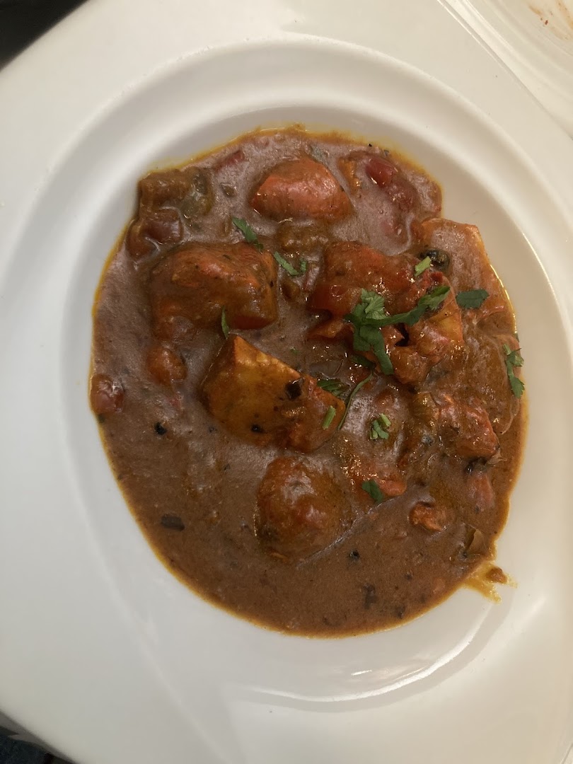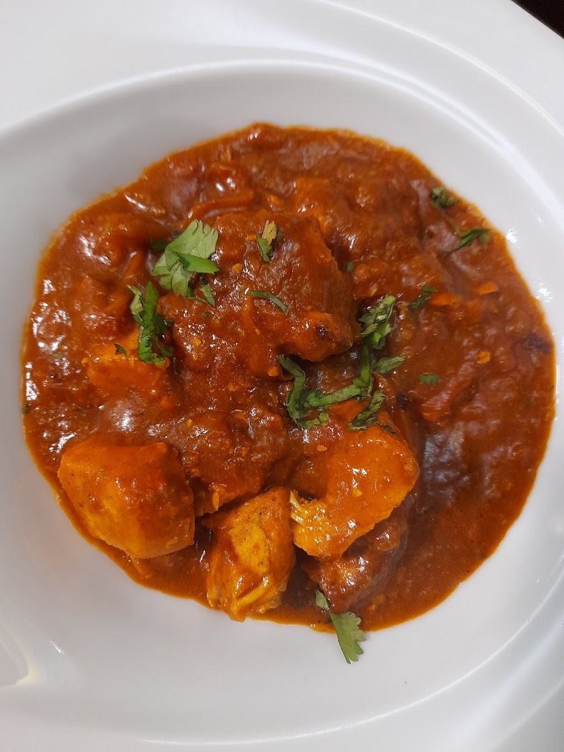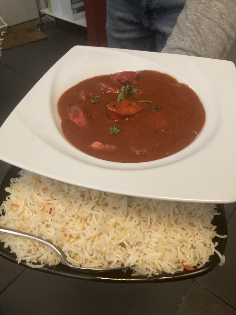 Блюдо: Poulet makhani "butter chicken. Описание блюда: Blancs de poulet marinés avec 19 épices pendant 24h, grillés au tandouri puis cuits avec sauce au beurre.