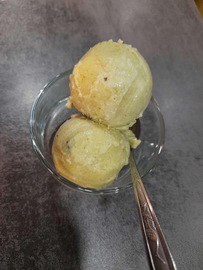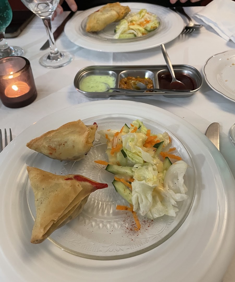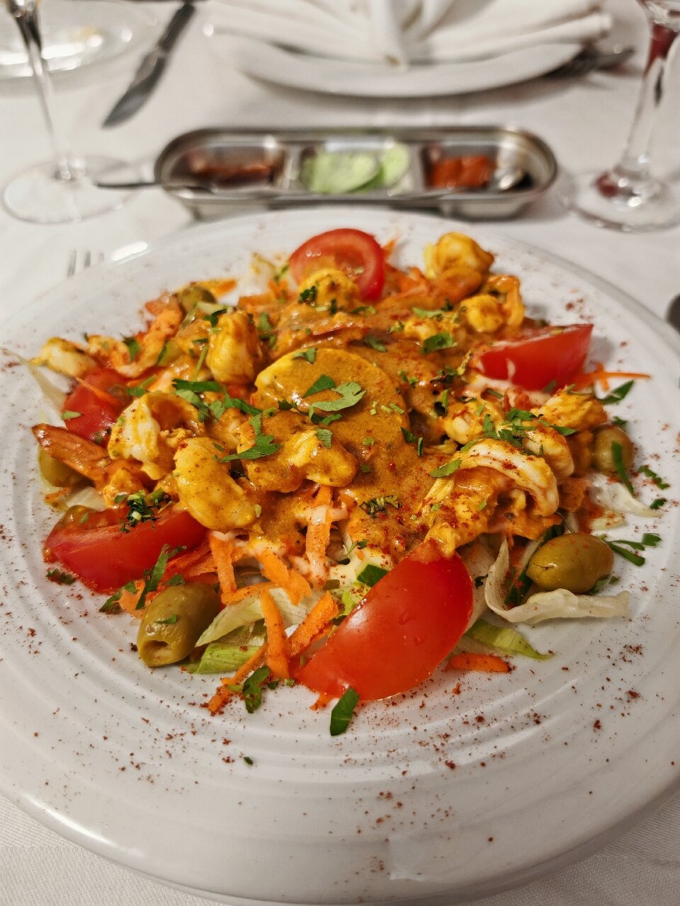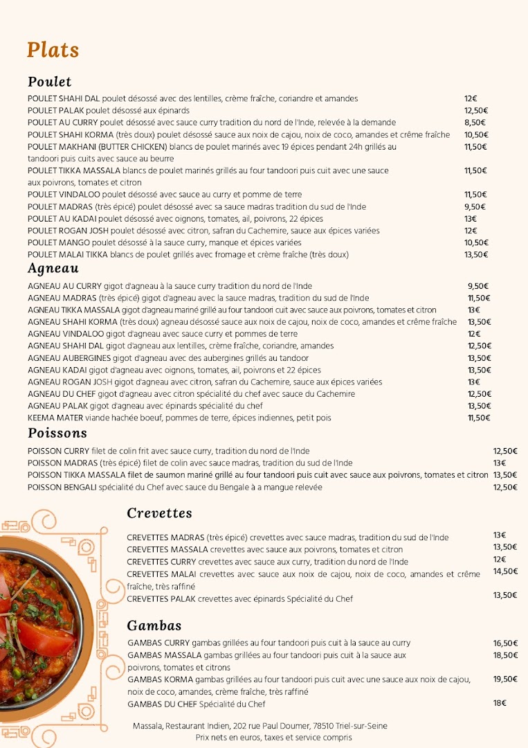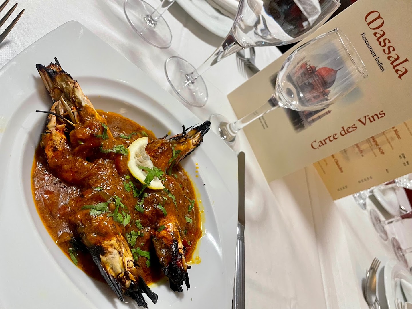 Блюдо: Gambas korma. Описание блюда: Gambas grillées au four tandoori puis cuit avec une sauce aux noix de cajou noix de coco, amandes, crème fraîche. Très raffiné.