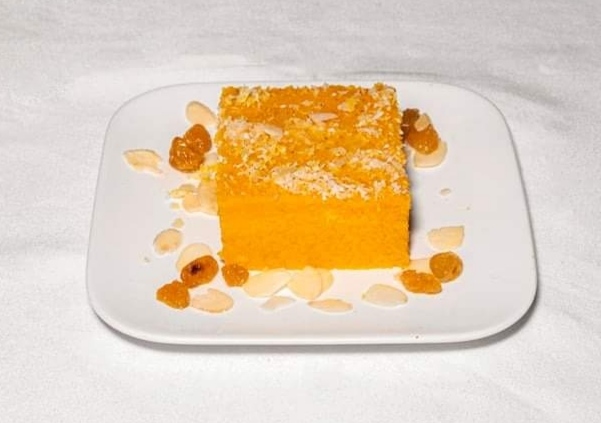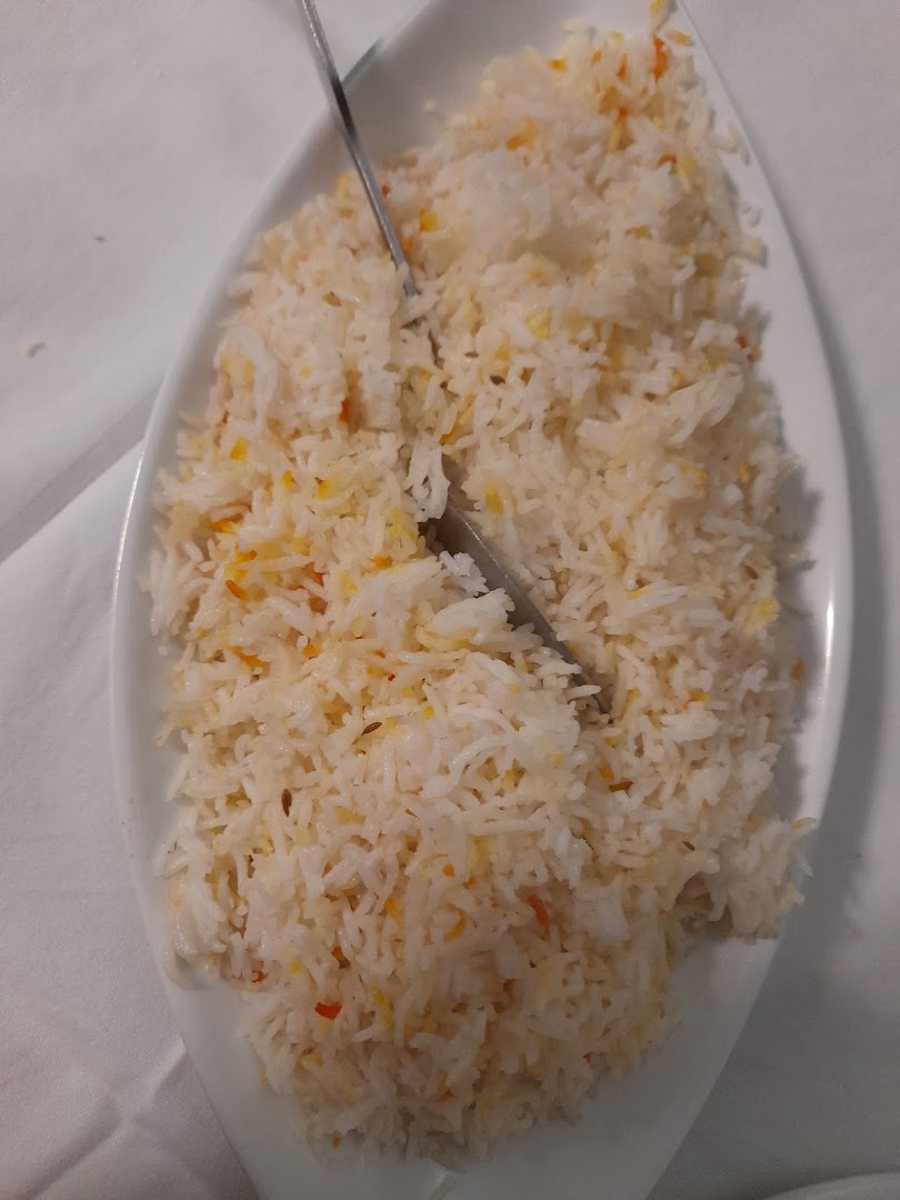 Блюдо: Biryani légumes. Описание блюда: Très parfumé, riz basmati, petits pois, choux-fleurs, tomates, carottes, coriandre fraîche, noix de coco, amandes et raisins secs.
