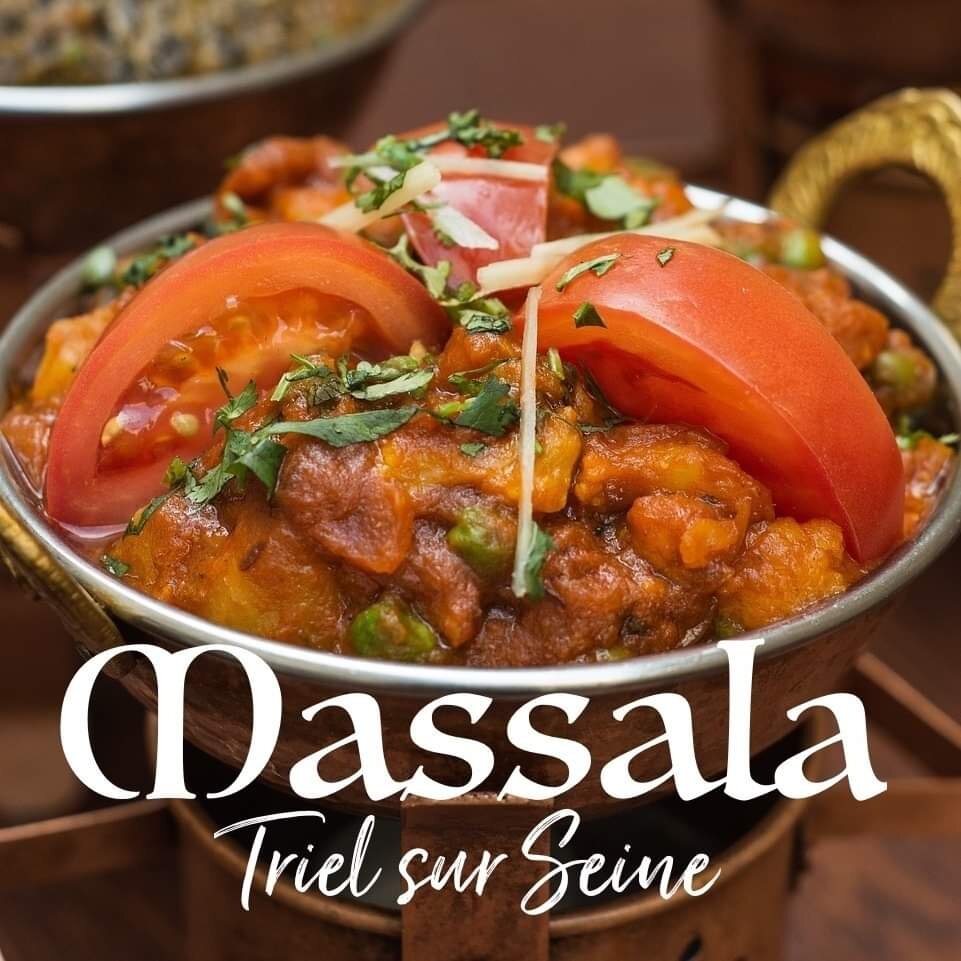 Блюдо: Poulet tikka massala. Описание блюда: Blancs de poulet marinés grillés au four tandoori puis cuit avec une sauce aux poivrons, tomates et citron.