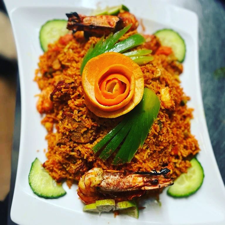 Блюдо: Biryani shahi. Описание блюда: Poulet, agneau, gambas grillés au tandoor, crevettes cuites avec du riz basmati, sauce au curry, légumes, coriandre, crème fraîche, safran du Cachemire, noix de coco, amandes et raisins secs. Pour 2 personnes.