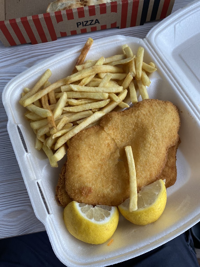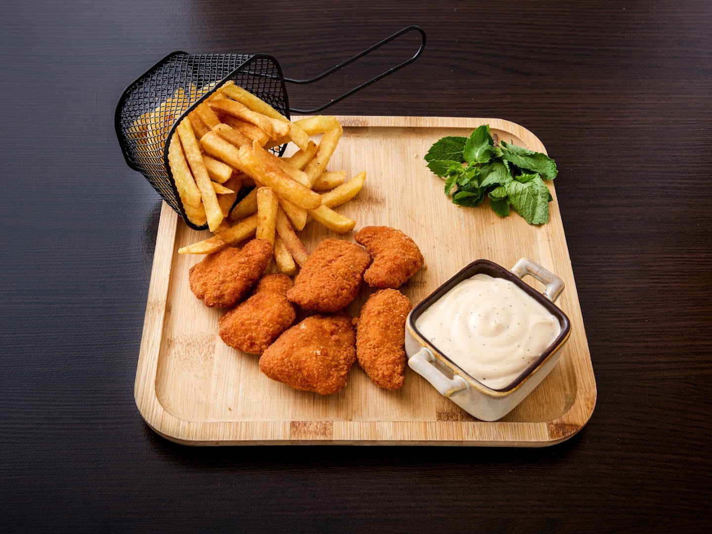 Serviert mit Pommes frites und einer Seite Curryketchup.