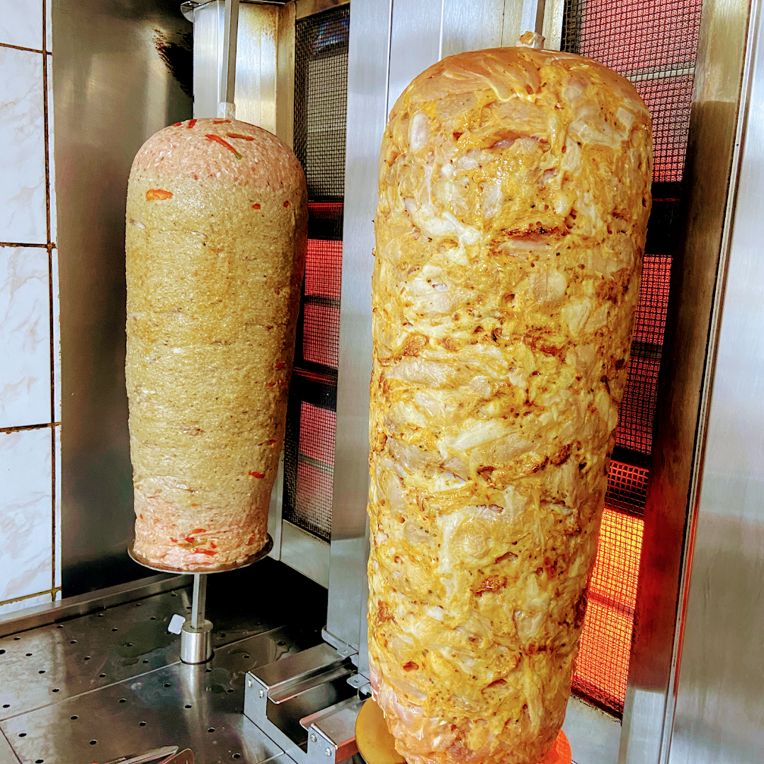 Mit Drehspießfleisch nach Wahl, ergänzt durch Paprika, Zwiebeln und Champignons.