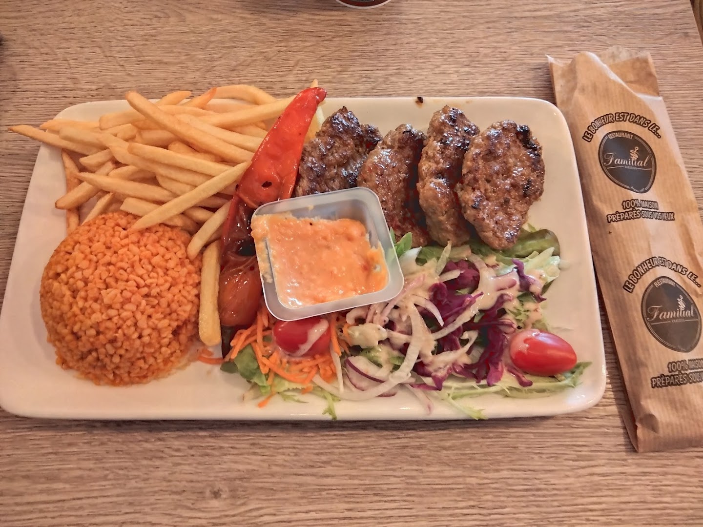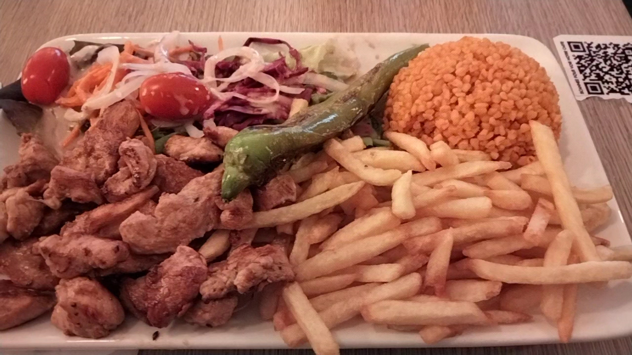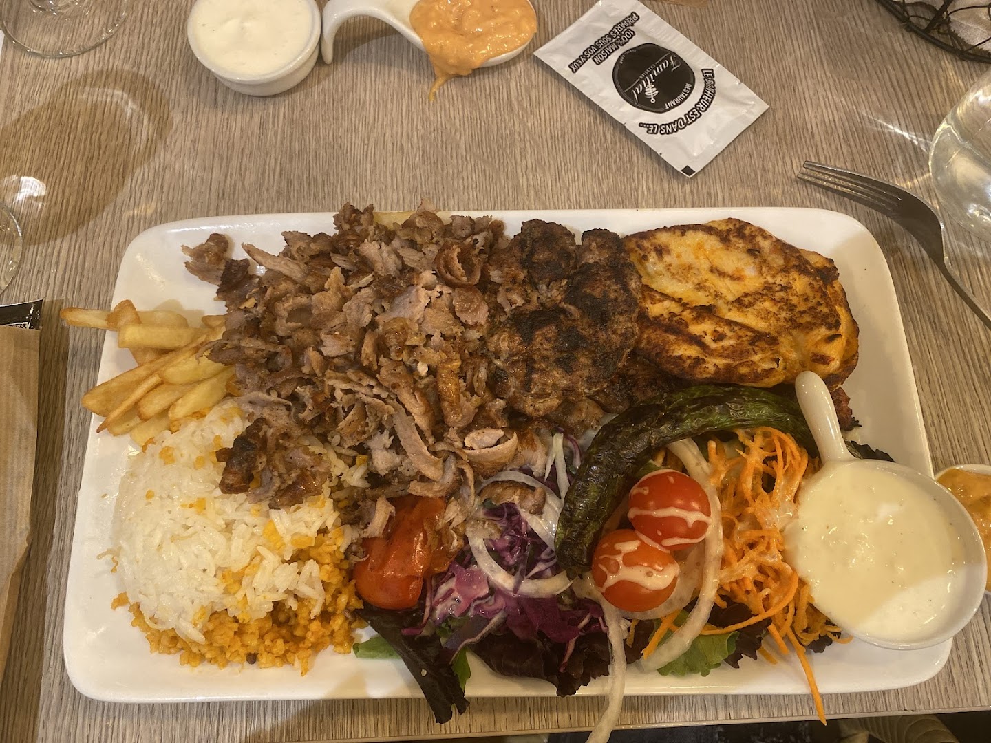 Блюдо: Assiette Mixte - Kebab, Köfte, Escalope, Bavette. Описание блюда: Accompagné de crudités, blé, riz et frites.
