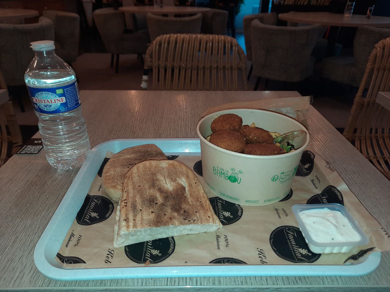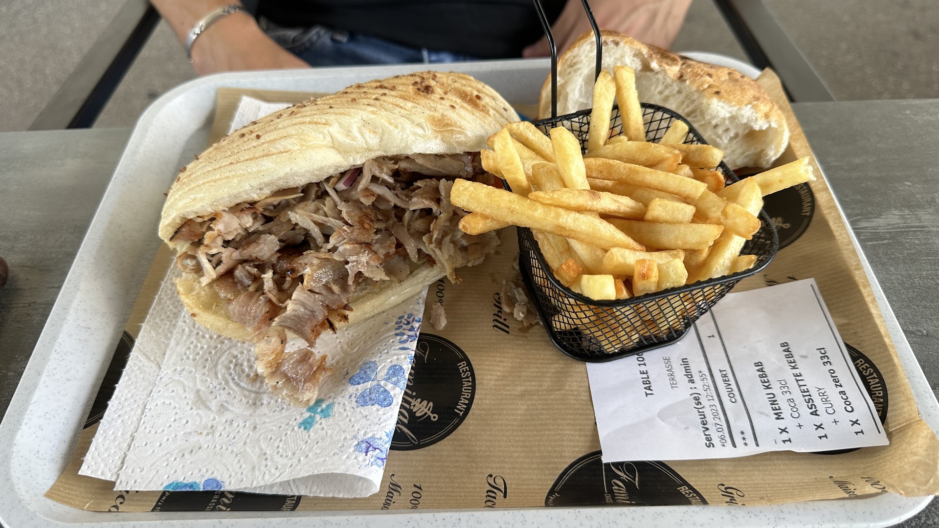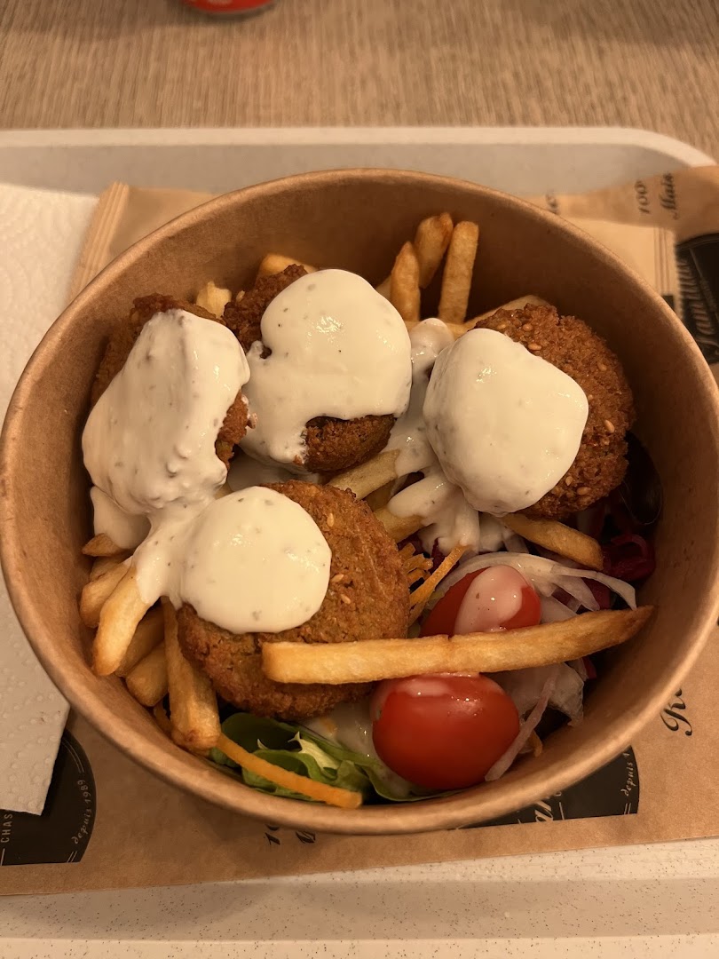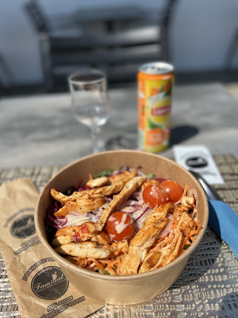 Блюдо: Assiette Mixte - Kebab, Köfte, Escalope, Bavette. Описание блюда: Accompagné de crudités, blé, riz et frites.