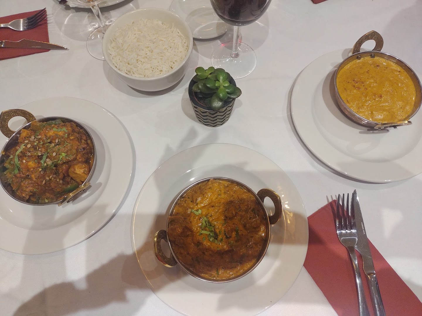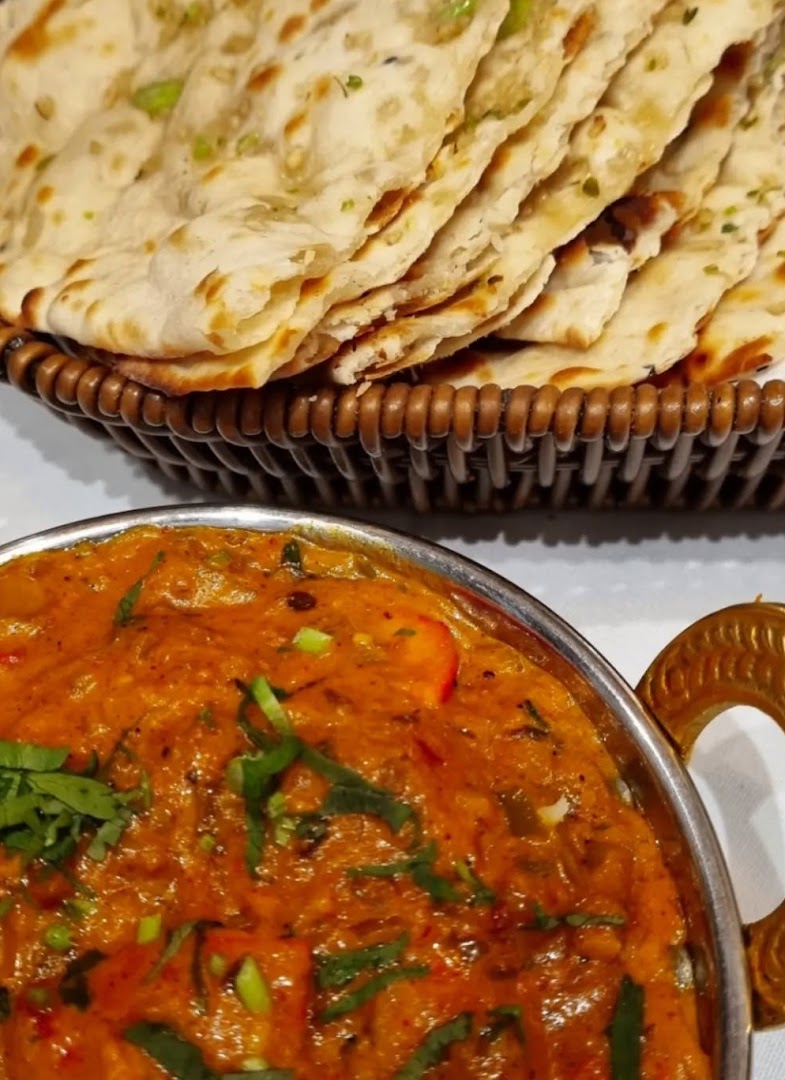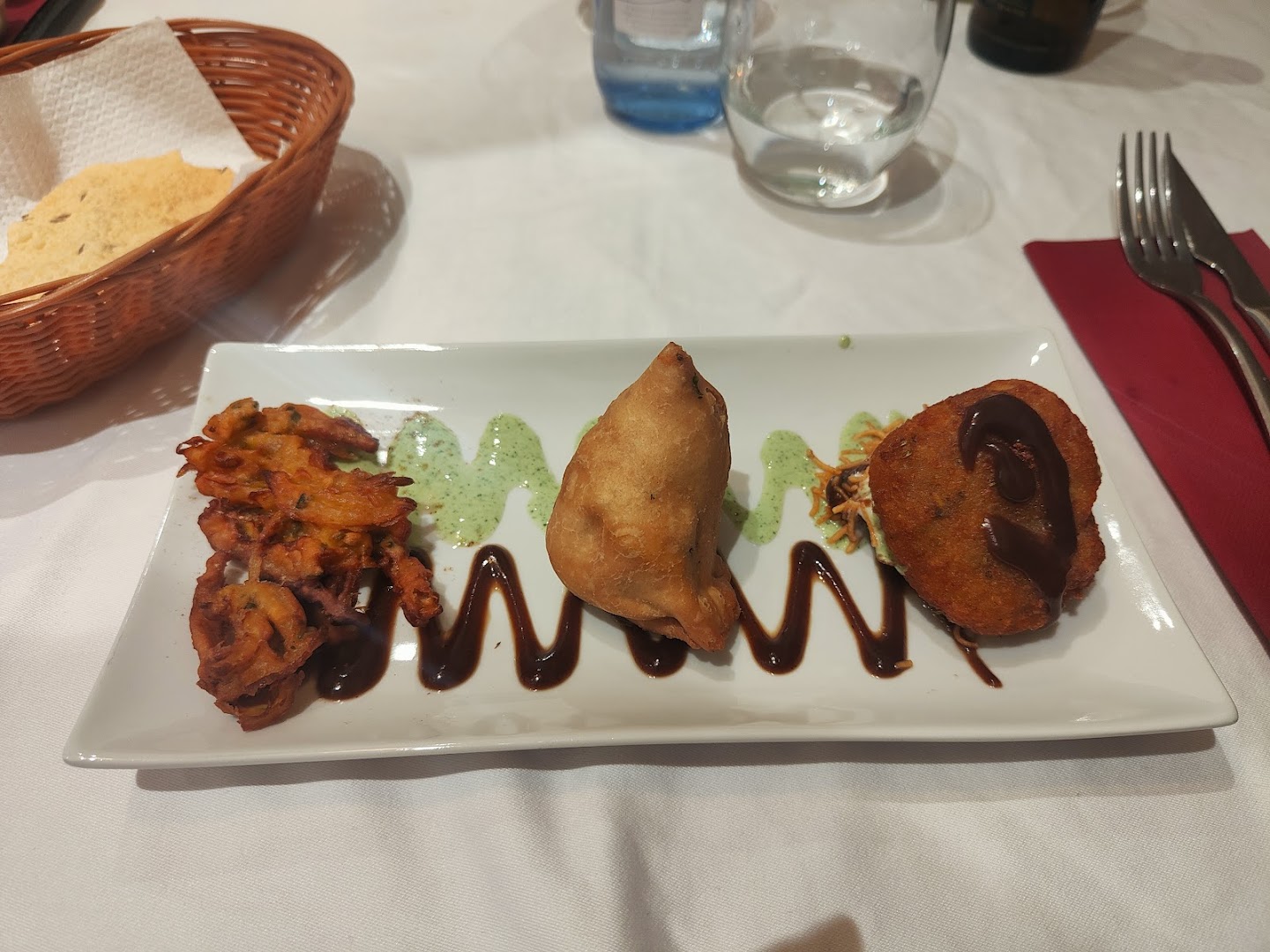 Блюдо: Menú Degustación Vegetariano / Vegetarian Tasting Menu. Описание блюда: Entrantes; Samosas de Verduras: empanadas rellenas de patata, guisantes y especias aromaticas de la India. Aloo Tikka: medallones de patatas, rellenos de lentejas condimentadas, servidos con yogurt natural y salsa de tamarindo y menta. Onion Bhaji: cebolla fileteada rebozada con harina de garbanzo y especias indias. Platos Principales; Palak Paneer: dados de queso fresco cocidos a fuego lento con salsa de espinacas. Bombay Aloo: patatas cocidas con semilla de comino tostado en salsa de tomate y cebolla. Dal Makhani: combinacion famosa y tradicional de lentejas, cocinadas a fuego lento sobre tandoor durante toda la noche aromatizada y enriquecida con crema y mantequilla. Acompañamientos: arroz pilau y pan. Starters; Samosas de Verduras: golden triangles of mildly spiced stuffed potatoes and peas. Aloo Tikka: deep fried mash potatoes filled with spiced lentils served with a yogurt, mint and tamarind sauce. Onion Bahji: crispy deep-fried onion battered with gram flour and indian spices. Main Course; Palak Paneer: fresh paneer dice cooked on slow fire with spinach sauce. Bombay Aloo: cubes of potato cooked with toasted cumin seed flavour in tomato onion gravy. Dal Makhani: Famous and traditional combinations of lentils, cooked on a slow fire on a tandoor during the whole night aromatized and enriched with cream and butter. Side Dishes: arroz pilau y pan.