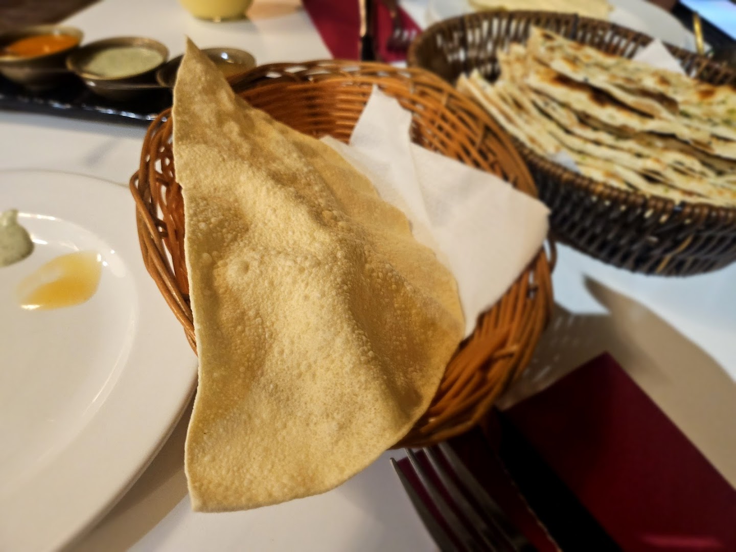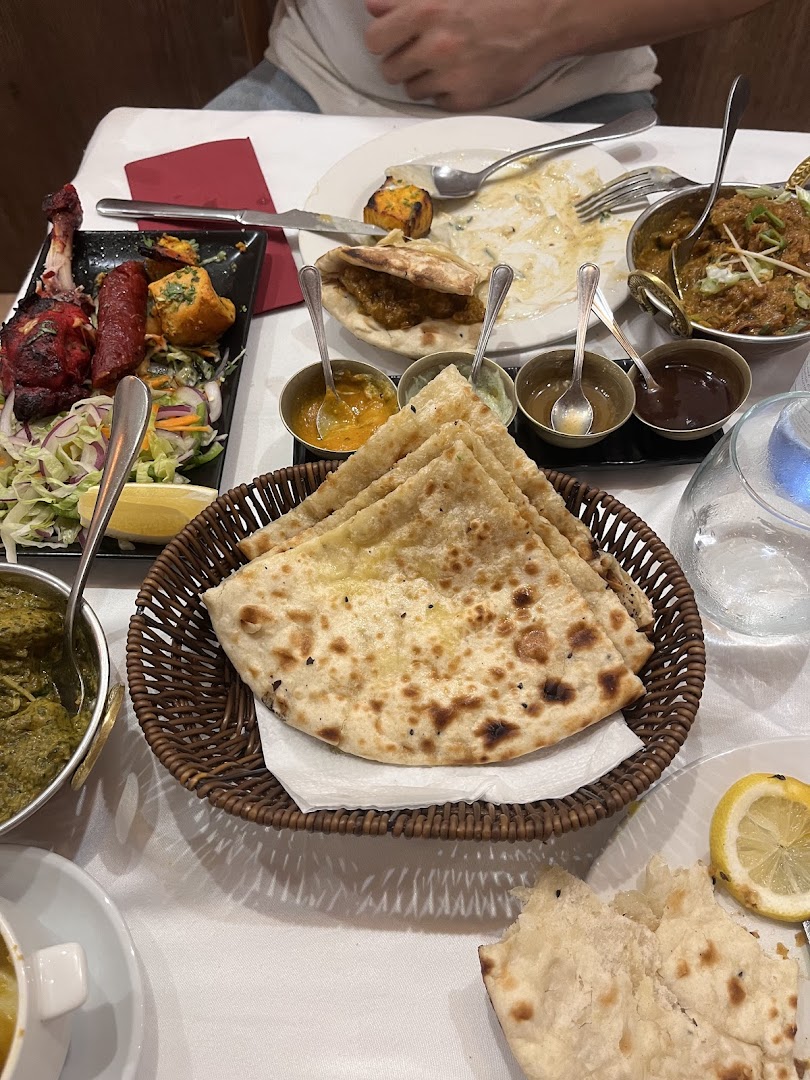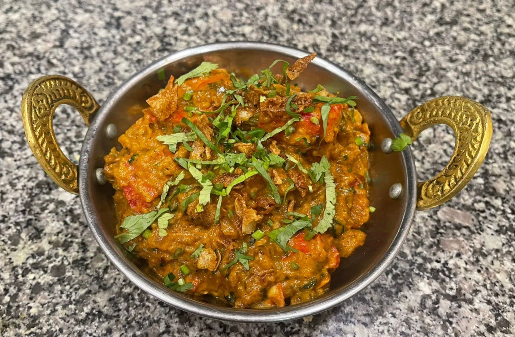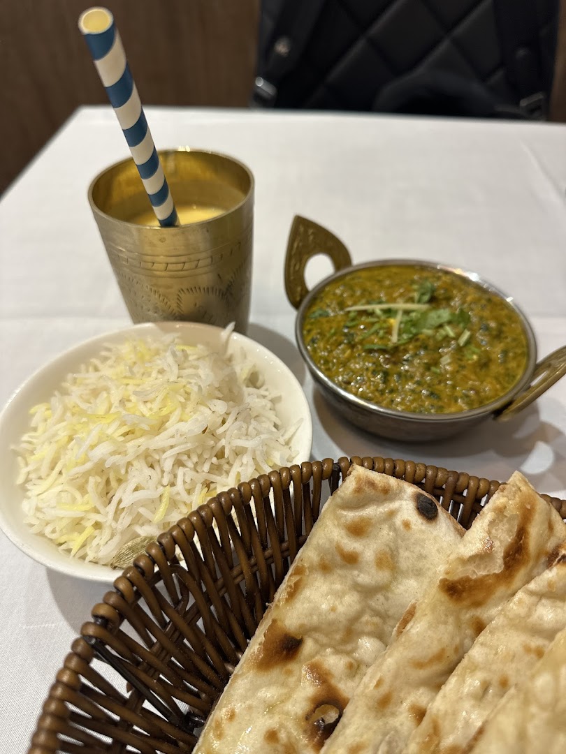 Блюдо: Menú Degustación Vegetariano / Vegetarian Tasting Menu. Описание блюда: Entrantes; Samosas de Verduras: empanadas rellenas de patata, guisantes y especias aromaticas de la India. Aloo Tikka: medallones de patatas, rellenos de lentejas condimentadas, servidos con yogurt natural y salsa de tamarindo y menta. Onion Bhaji: cebolla fileteada rebozada con harina de garbanzo y especias indias. Platos Principales; Palak Paneer: dados de queso fresco cocidos a fuego lento con salsa de espinacas. Bombay Aloo: patatas cocidas con semilla de comino tostado en salsa de tomate y cebolla. Dal Makhani: combinacion famosa y tradicional de lentejas, cocinadas a fuego lento sobre tandoor durante toda la noche aromatizada y enriquecida con crema y mantequilla. Acompañamientos: arroz pilau y pan. Starters; Samosas de Verduras: golden triangles of mildly spiced stuffed potatoes and peas. Aloo Tikka: deep fried mash potatoes filled with spiced lentils served with a yogurt, mint and tamarind sauce. Onion Bahji: crispy deep-fried onion battered with gram flour and indian spices. Main Course; Palak Paneer: fresh paneer dice cooked on slow fire with spinach sauce. Bombay Aloo: cubes of potato cooked with toasted cumin seed flavour in tomato onion gravy. Dal Makhani: Famous and traditional combinations of lentils, cooked on a slow fire on a tandoor during the whole night aromatized and enriched with cream and butter. Side Dishes: arroz pilau y pan.