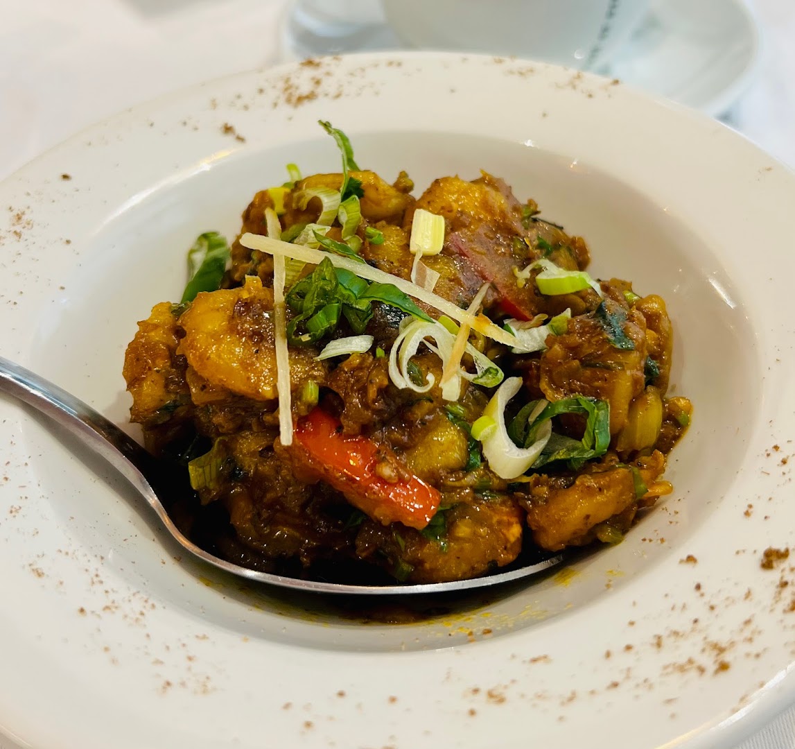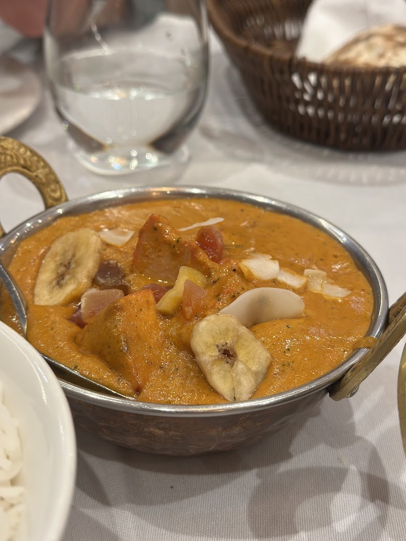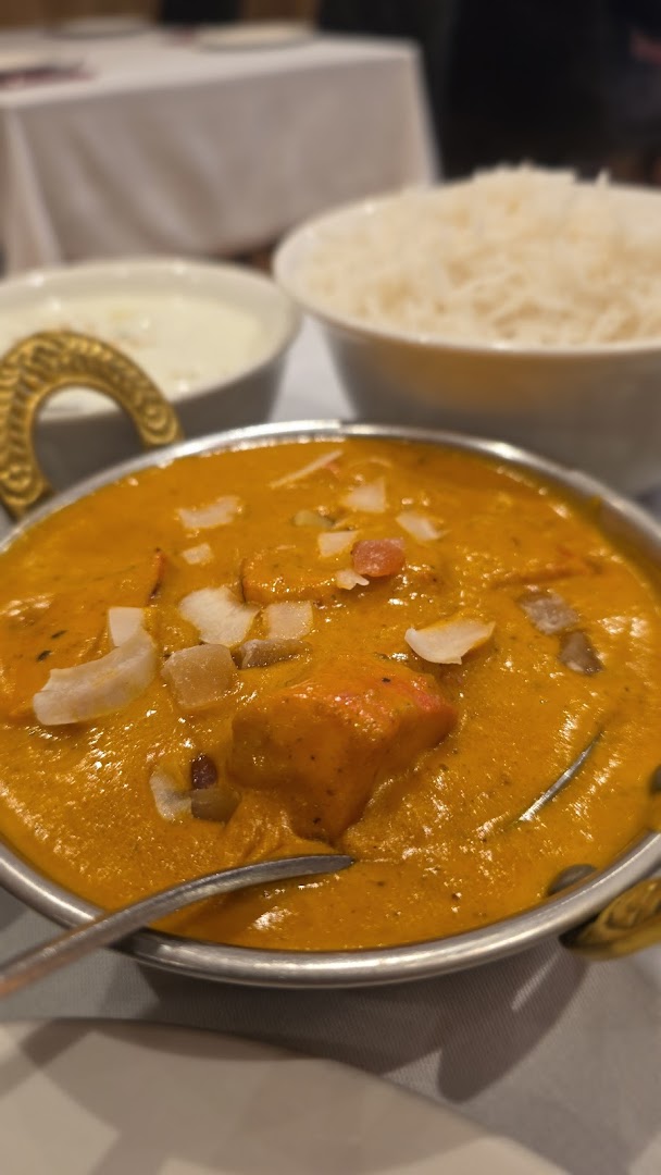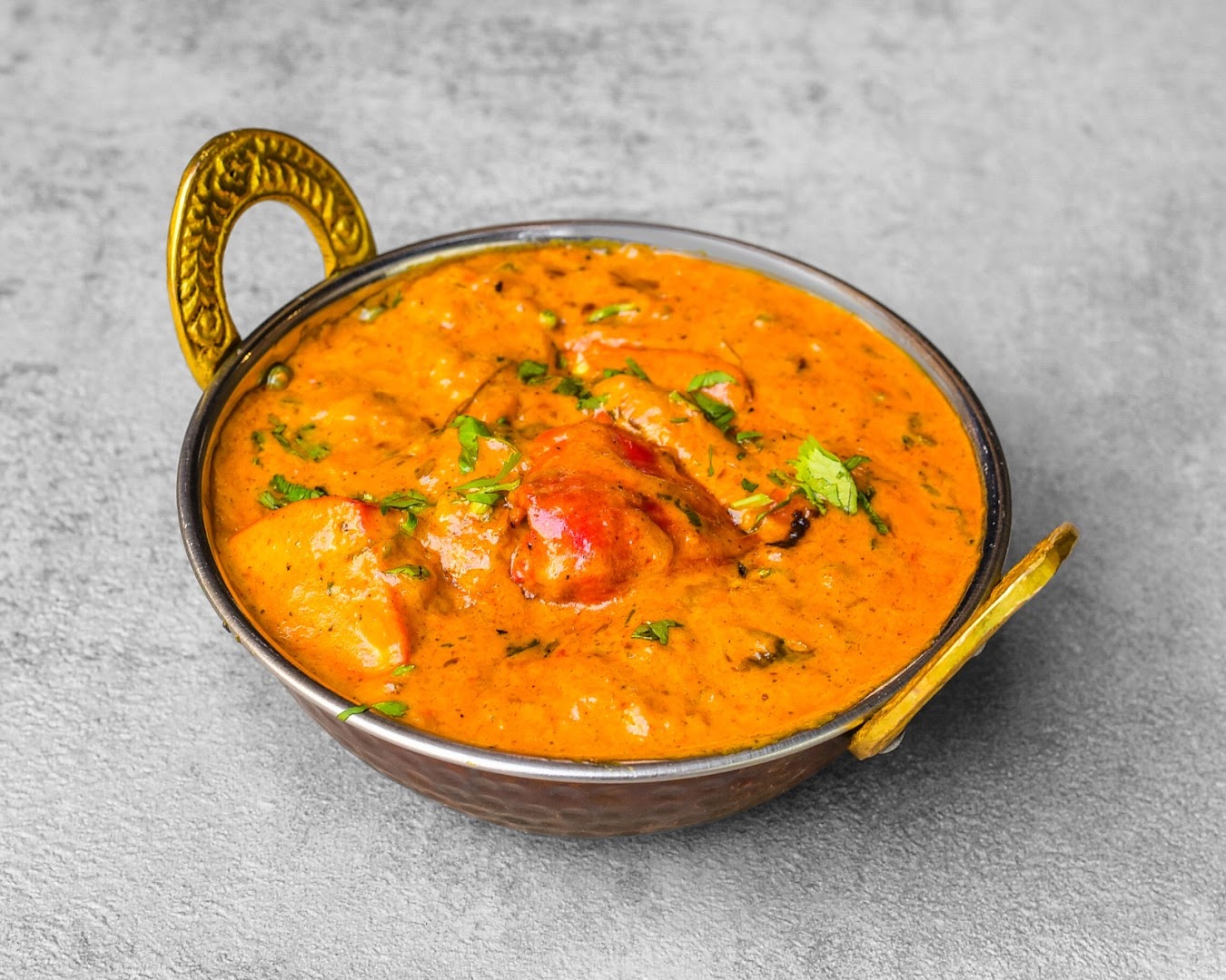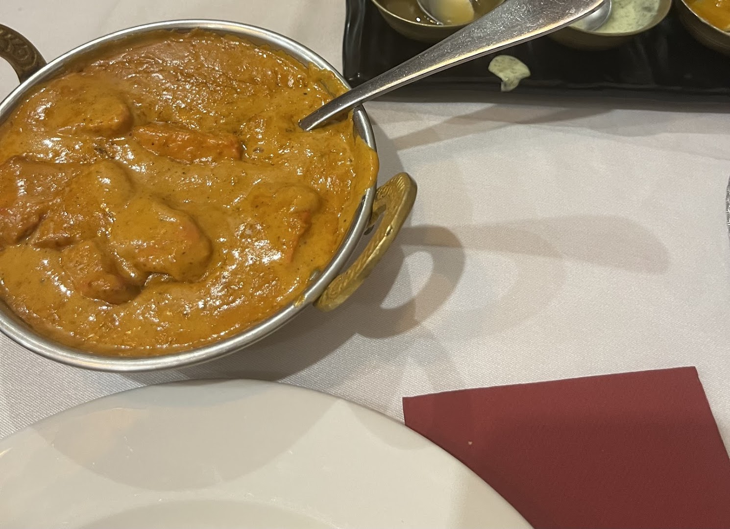 Блюдо: Butter Chicken. Описание блюда: Pollo con un toque tradicional de especias, cocinado en salsa de tomate, mantequilla y crema con sabor de cardamomo. Chicken with a traditional touch of spices, cooked in tomato sauce, butter and cream with cardamom flavour.