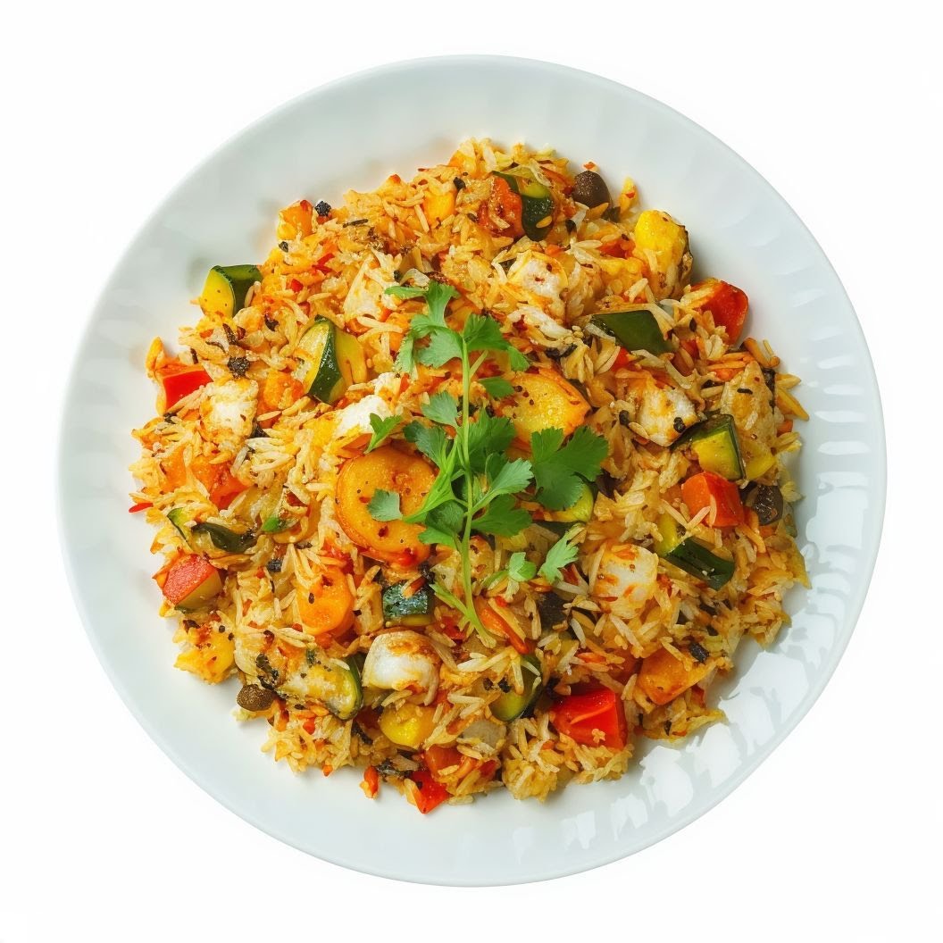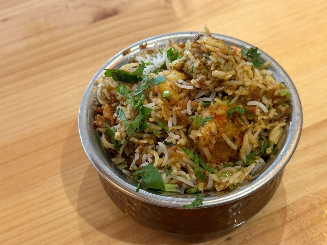 Блюдо: Biryani. Описание блюда: Plato mas popular del festival indio. El arroz basmati se cocina con azafran, especies aromaticas y hierbas junto con carne o verduras o gambas y servidos con salsa de yogurt. Most popular dish of the Indian festival. Basmati rice is cooked with saffron, aromatic spices and herbs along with meat or vegetables or prawn served with yogurt sauce.