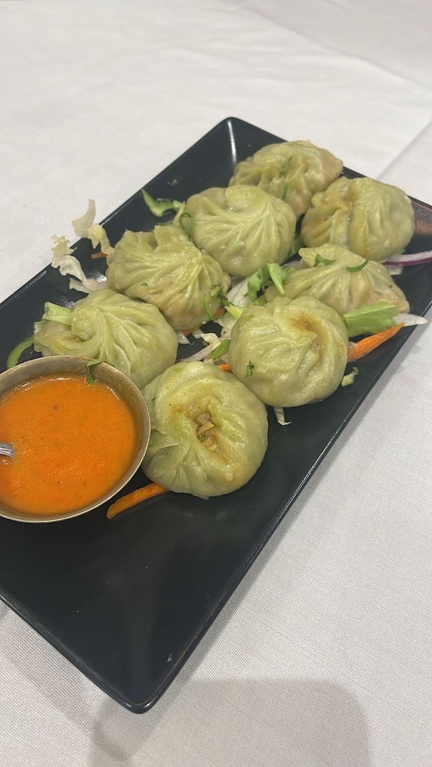 Блюдо: Vegetable Nepalí Momo (8 PCs). Описание блюда: Empanadillas de harina de trigo rellenas de verduras de temporada, especiadas con hierbas del himalaya, cocinadas al vapor. Wheat flour dumpies filled with seasonal vegetables, spiced with Himalayan herbs, steamed.