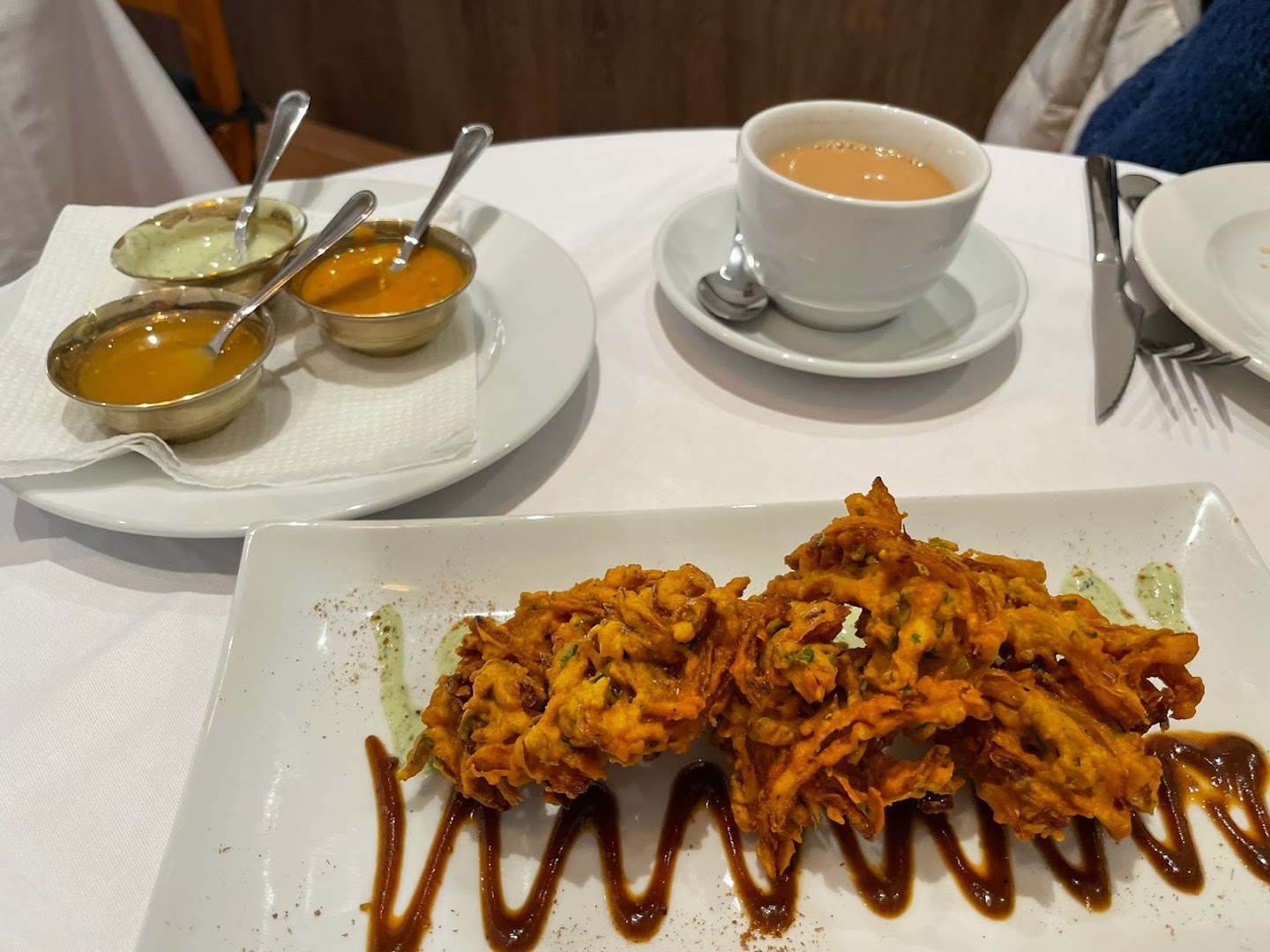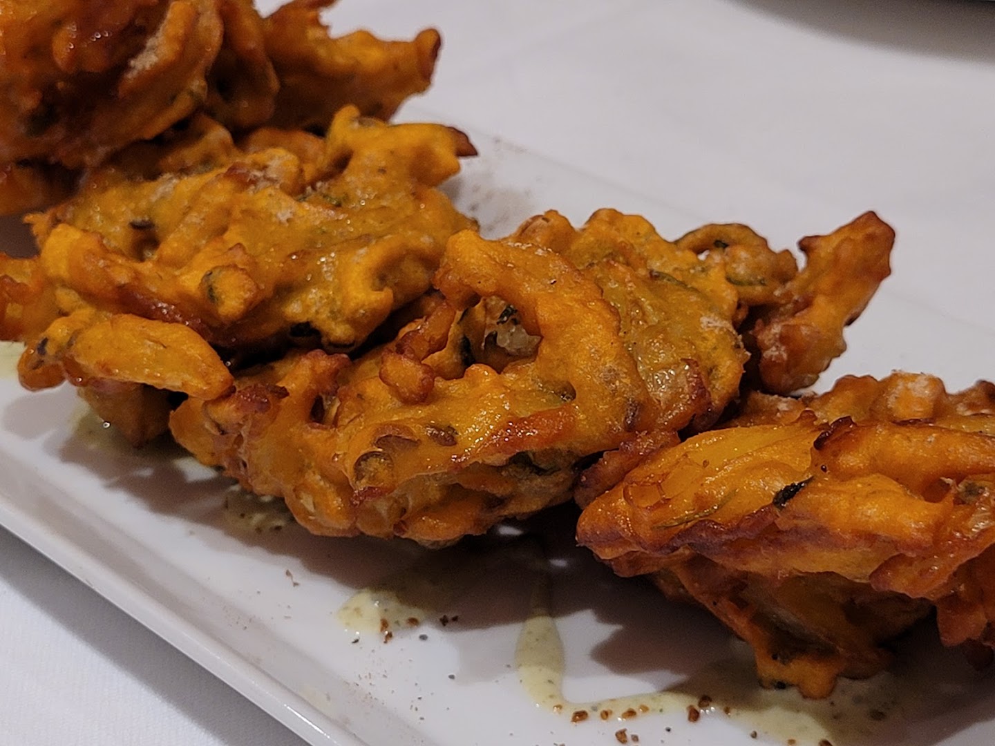 Блюдо: Onion Bhaji. Описание блюда: Cebolla fileteada rebozada con harina de garbanzo y especias indias. Crispy deep-fried onion battered with Gram flour and indian spices.