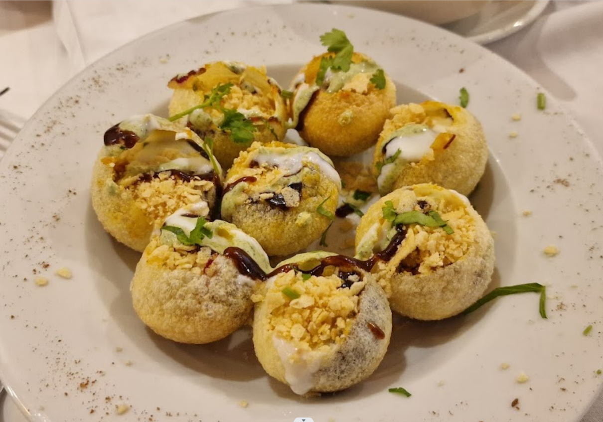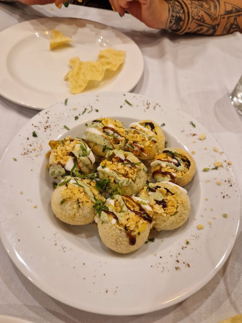 Блюдо: Puri Chat. Описание блюда: Burbujas de trigo rellenas de garbanzos y patatas, recubiertos con yogurt, tamarindo y salsa de menta. Whole wheat crisps with a mashed chickpeas, drizzled with spices yogurt, tamarind, and mint sauce.