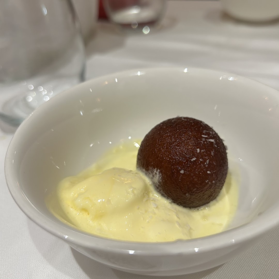 Блюдо: Gulab Jamun. Описание блюда: Bolita frita de queso fresco mojado en sirope de cardamomo verde. Deep fried milk nuggets dunked in green cardamom flavoured syrup.