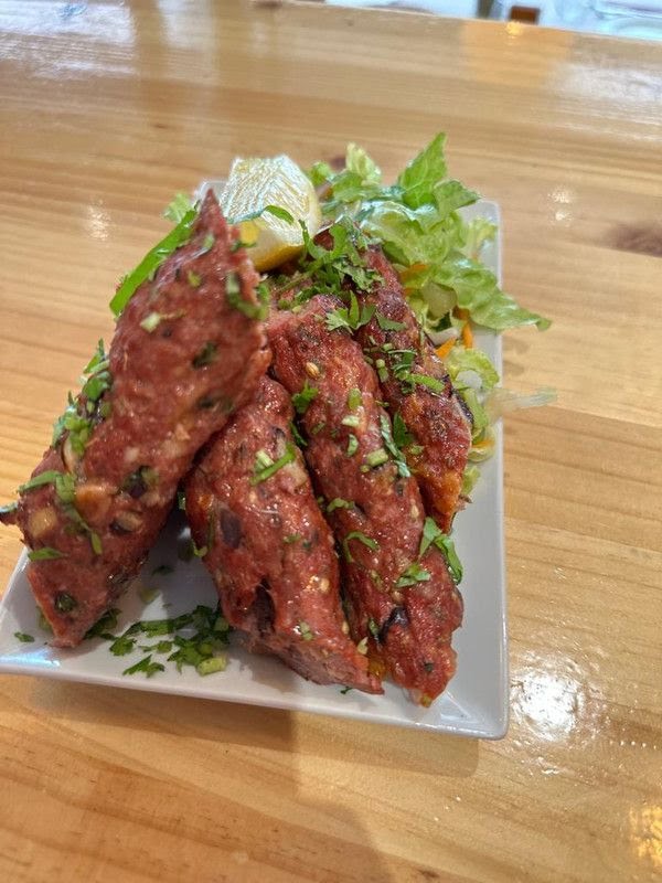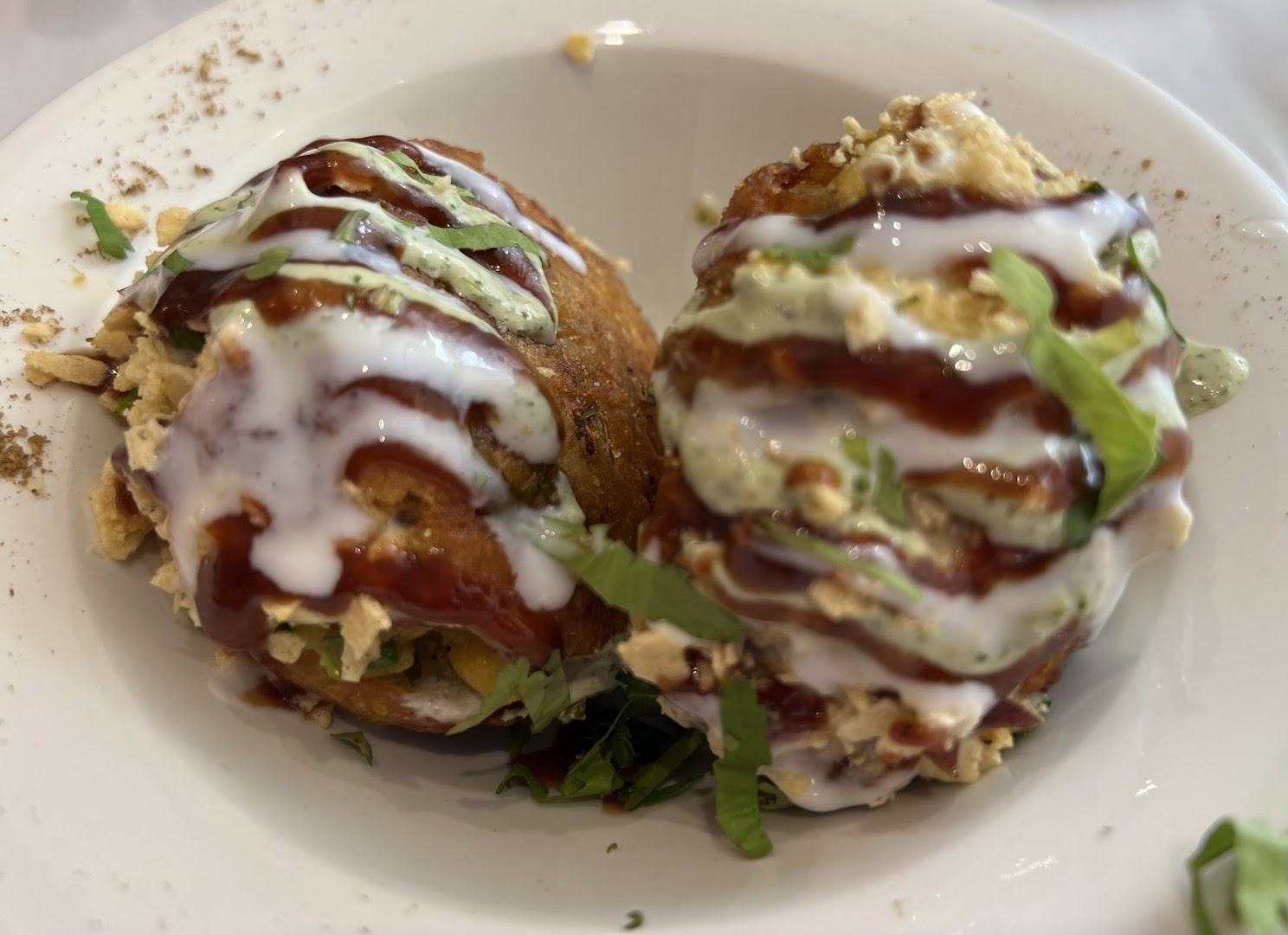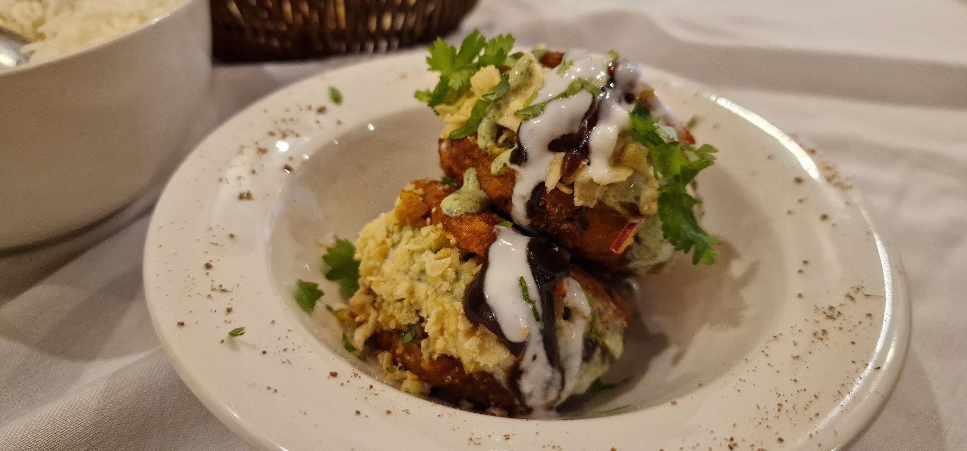 Блюдо: Aloo Tikka. Описание блюда: Medallones de patatas, rellenos de lentejas condimentadas, servidos con yogurt natural y salsa de tamarindo y menta. Deep fried mash potatos filled with spiced lentils served with a yogurt, mint and tamarind sauce.