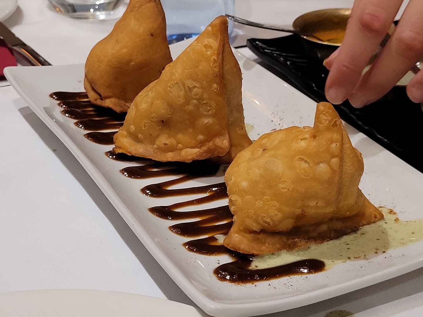 Блюдо: Vegetable Samosa. Описание блюда: Empanadas rellenas de patata, guisantes y especias aromaticas de la India. Golden triangles of mildly spiced stuffed potatoes and peas-one of the most famous starters.
