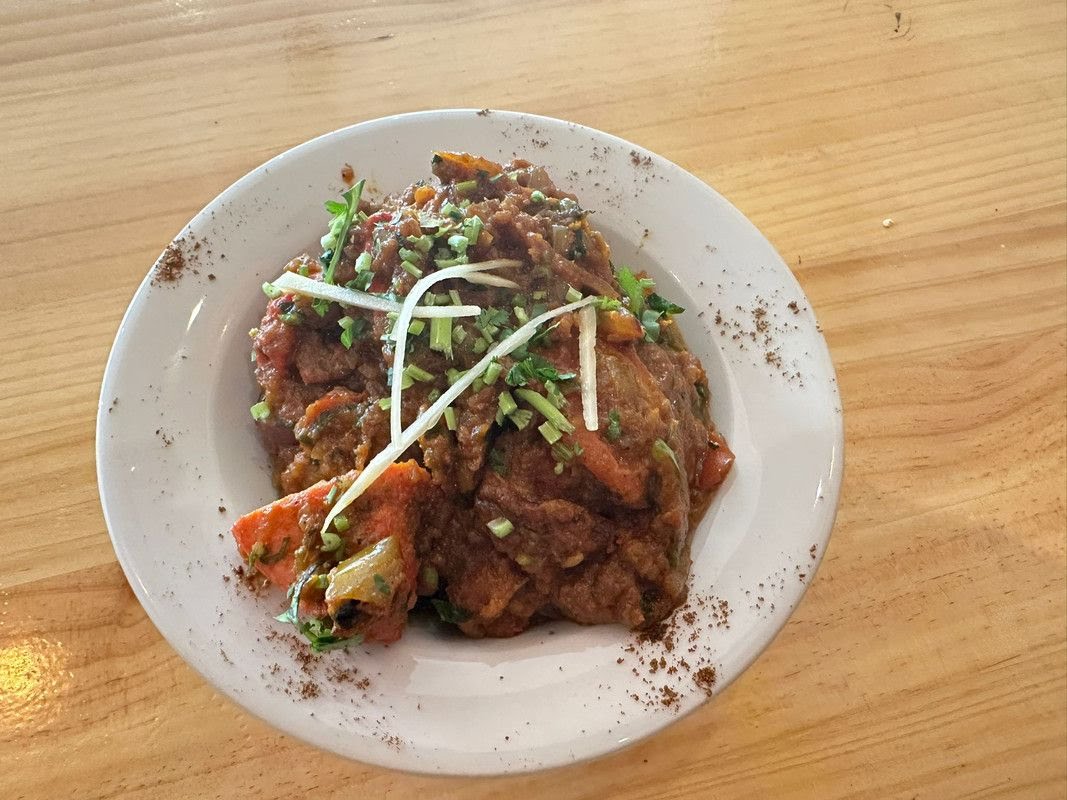 Блюдо: Lamb Rogan Josh. Описание блюда: Cordero cocinado con base de tomate y salsa de cebolla con especias. Lamb cooked with a base of tomato and onion sauce with spices.