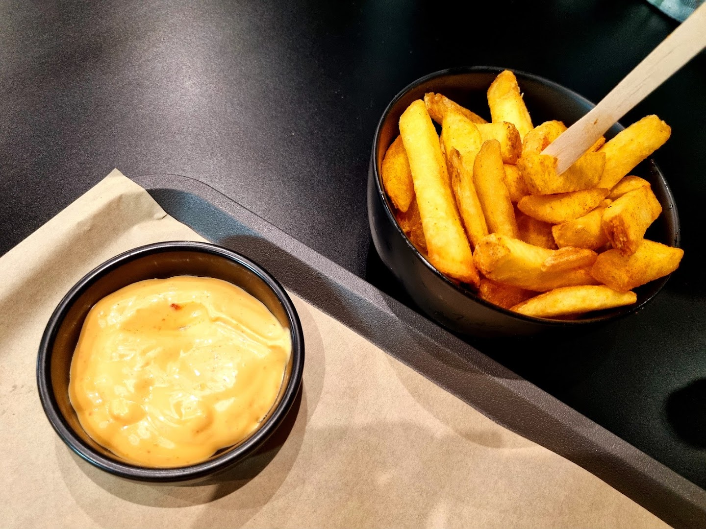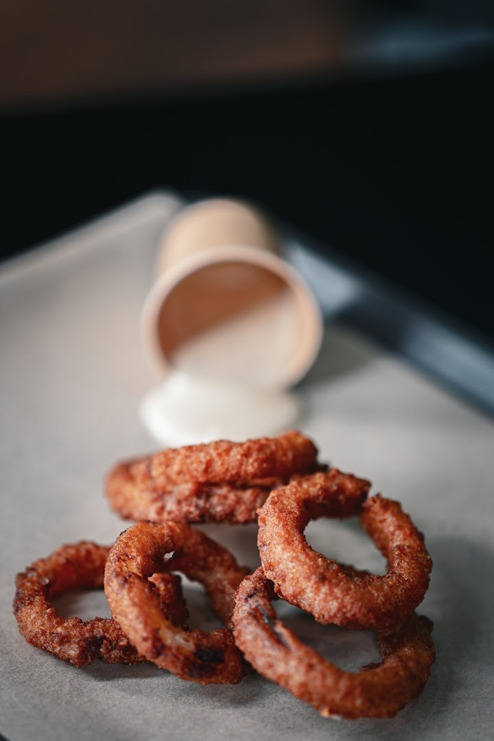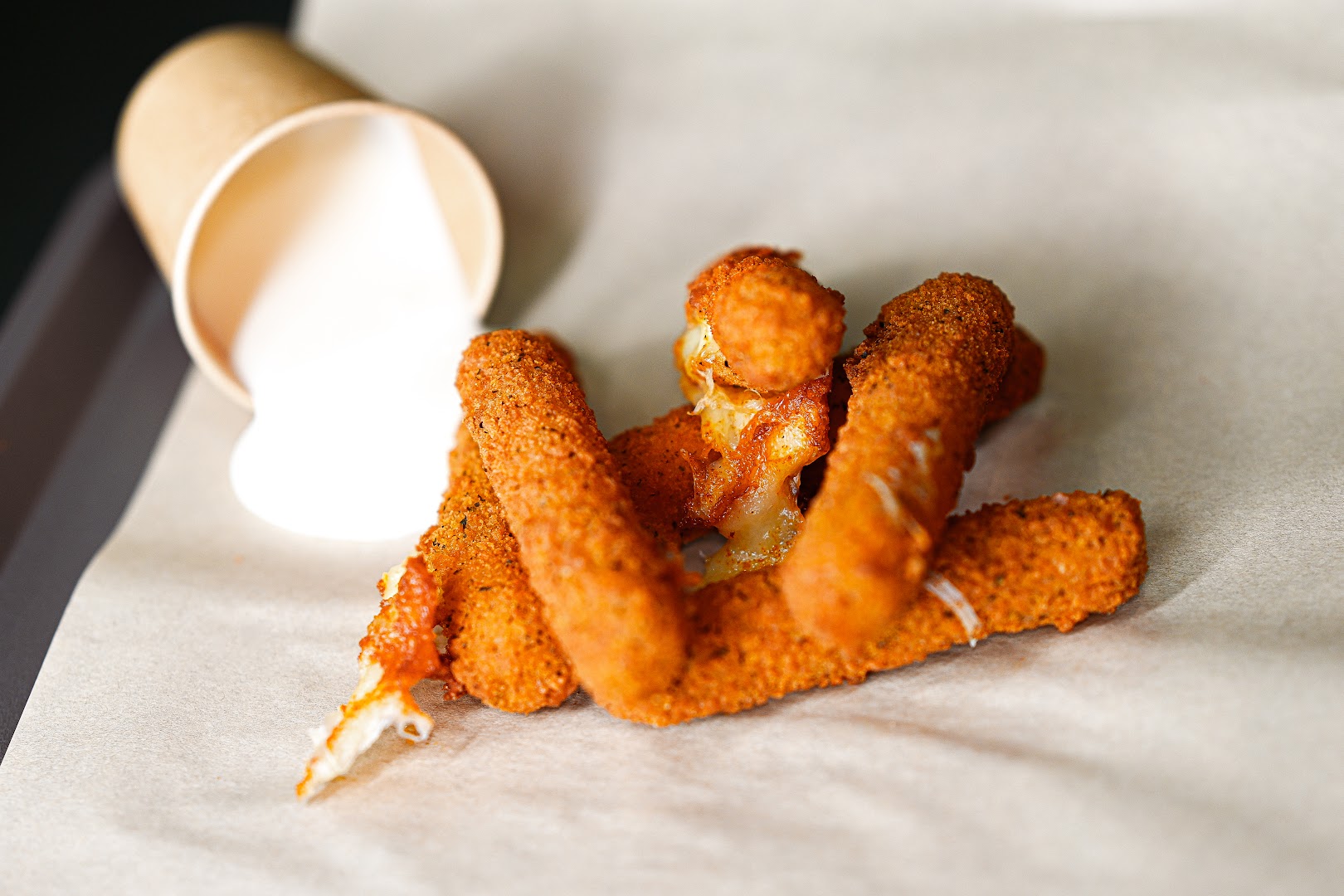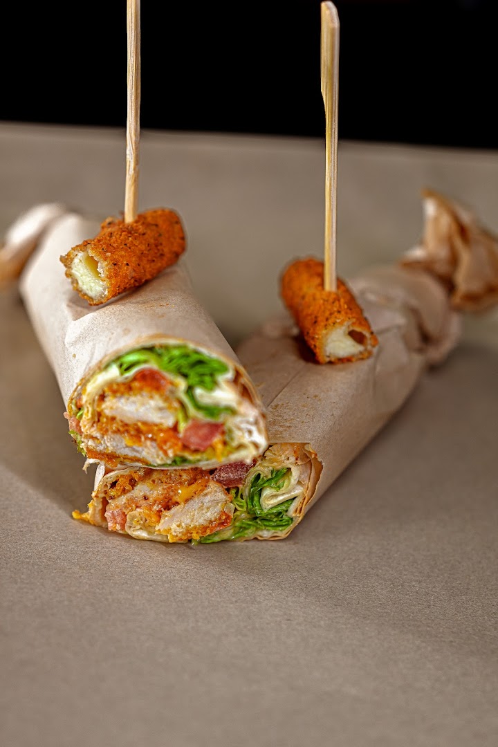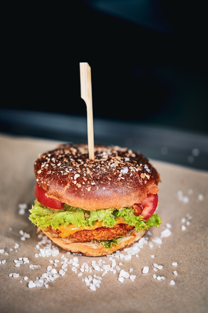 Блюдо: Crispy-B. Описание блюда: Knuspriges Hähnchen in Panade, auf einem weichen Brioche-Brötchen serviert, mit knackigem Salat, frischen Tomatenscheiben und einer cremigen Sauce deiner Wahl.