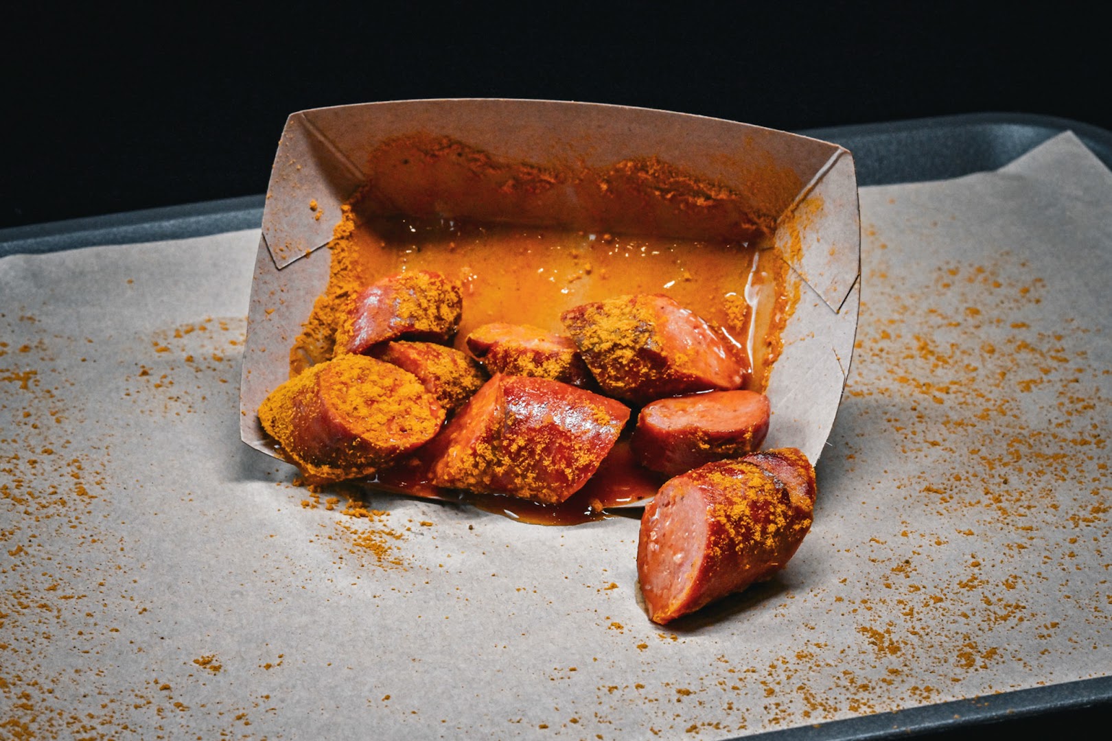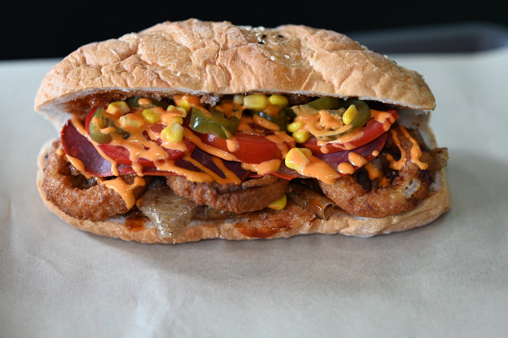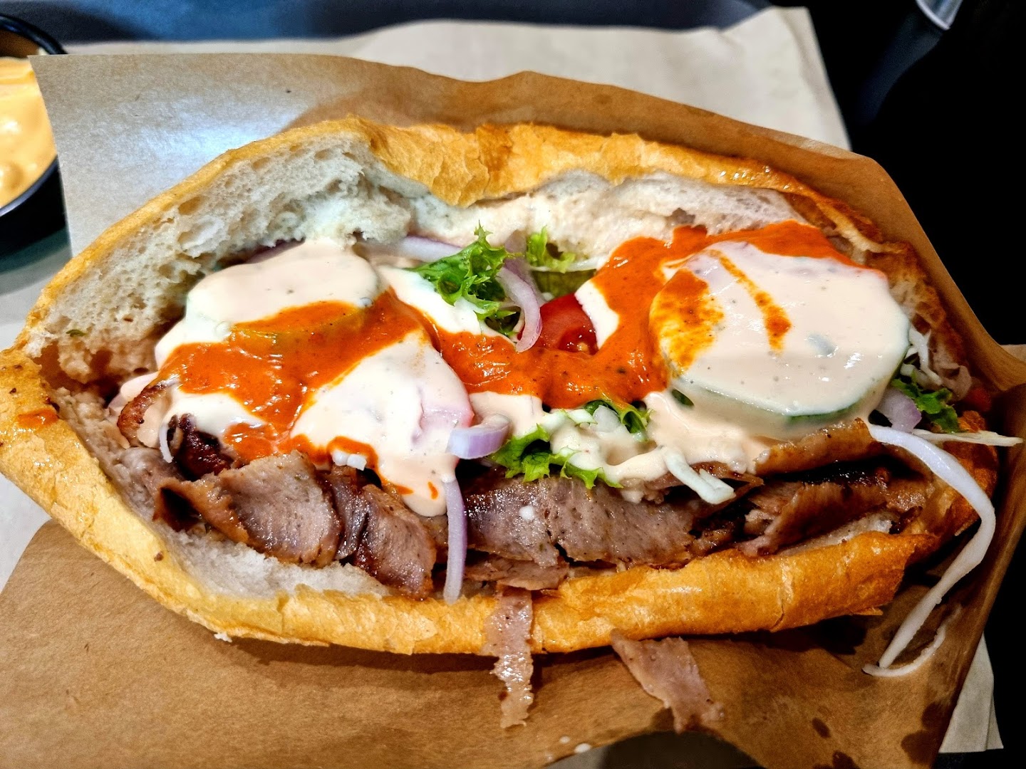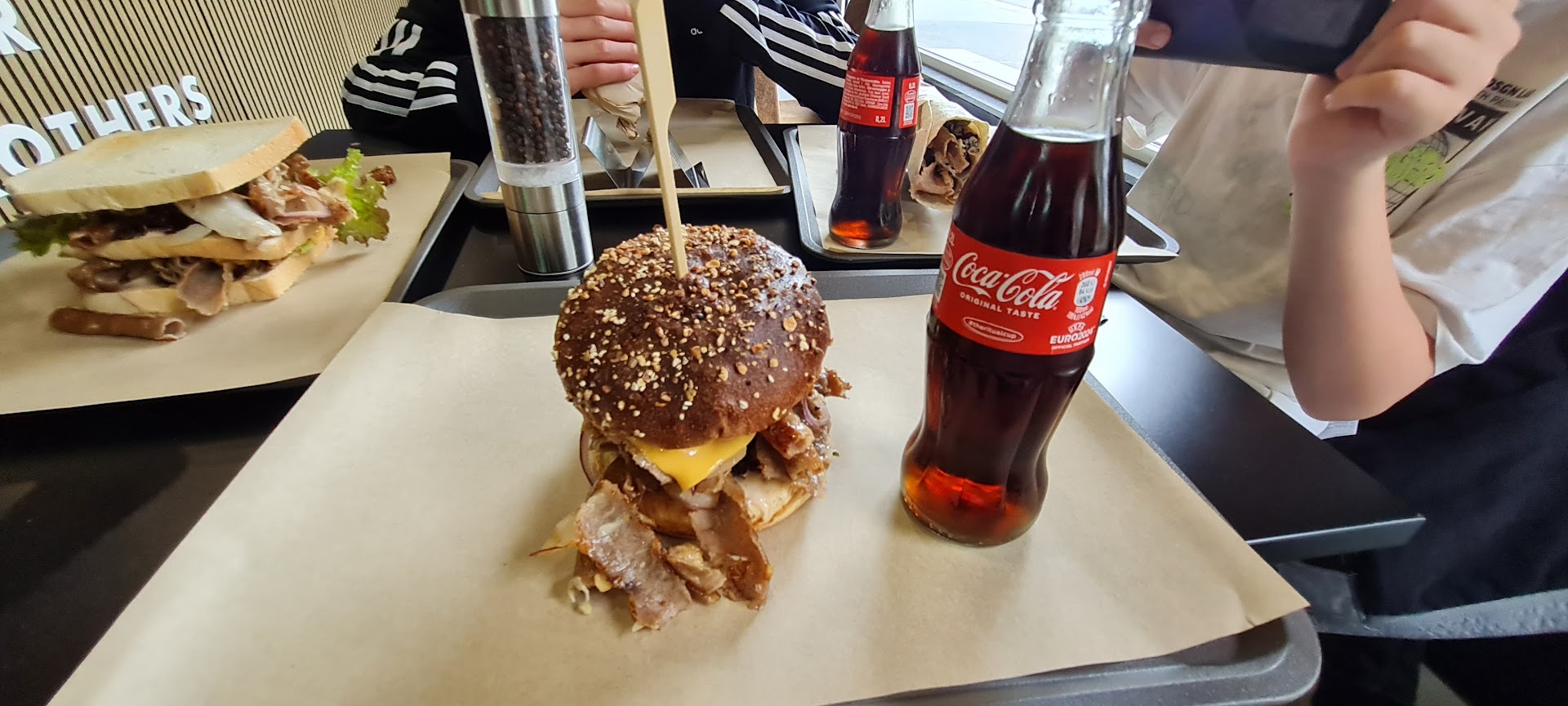 Блюдо: Brothers BBQ Döner. Описание блюда: Gegrilltes Dönerfleisch im hausgemachten Brot, ergänzt um Pastrami, Tomaten, Zwiebeln, Jalapeños, frittierte Zwiebelringe und BBQ-Sauce. Serviert mit Currywurst, knusprigen Pommes und einem Getränk nach Wahl.