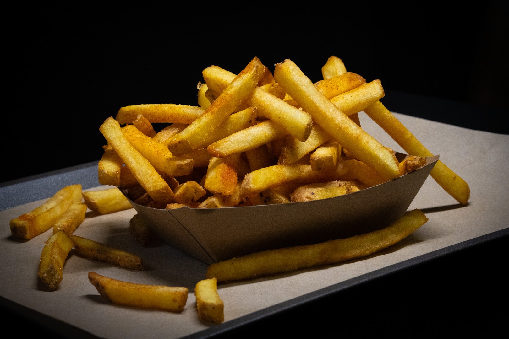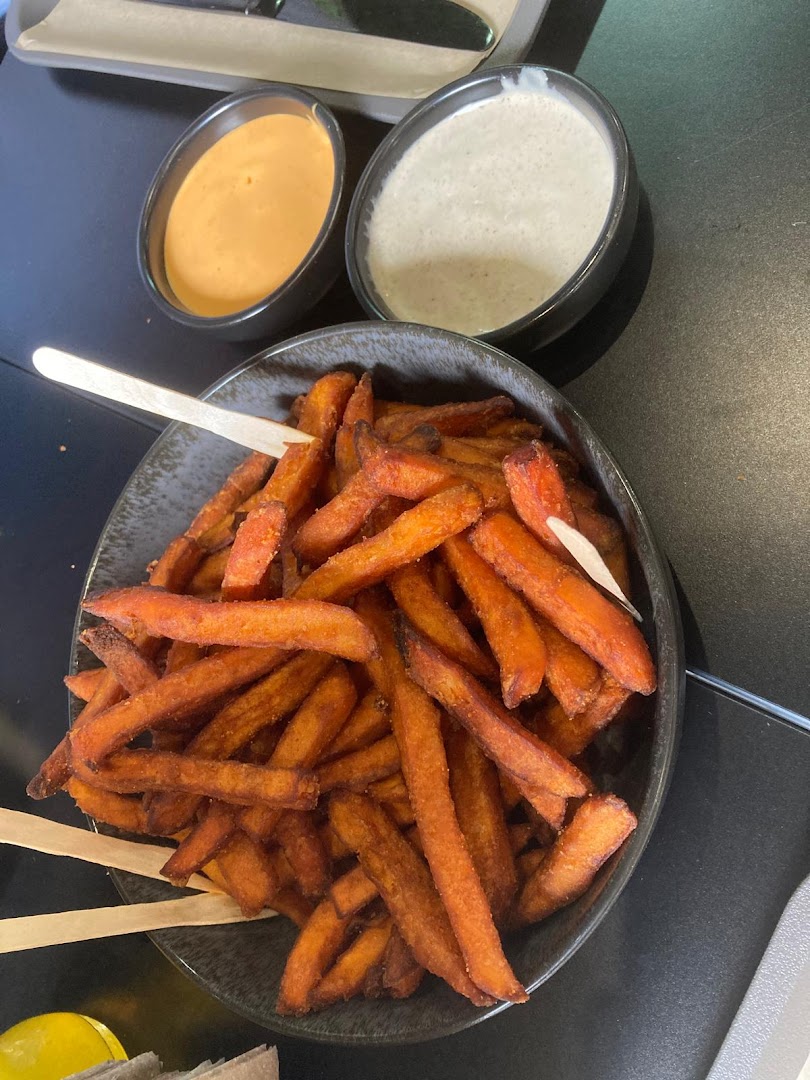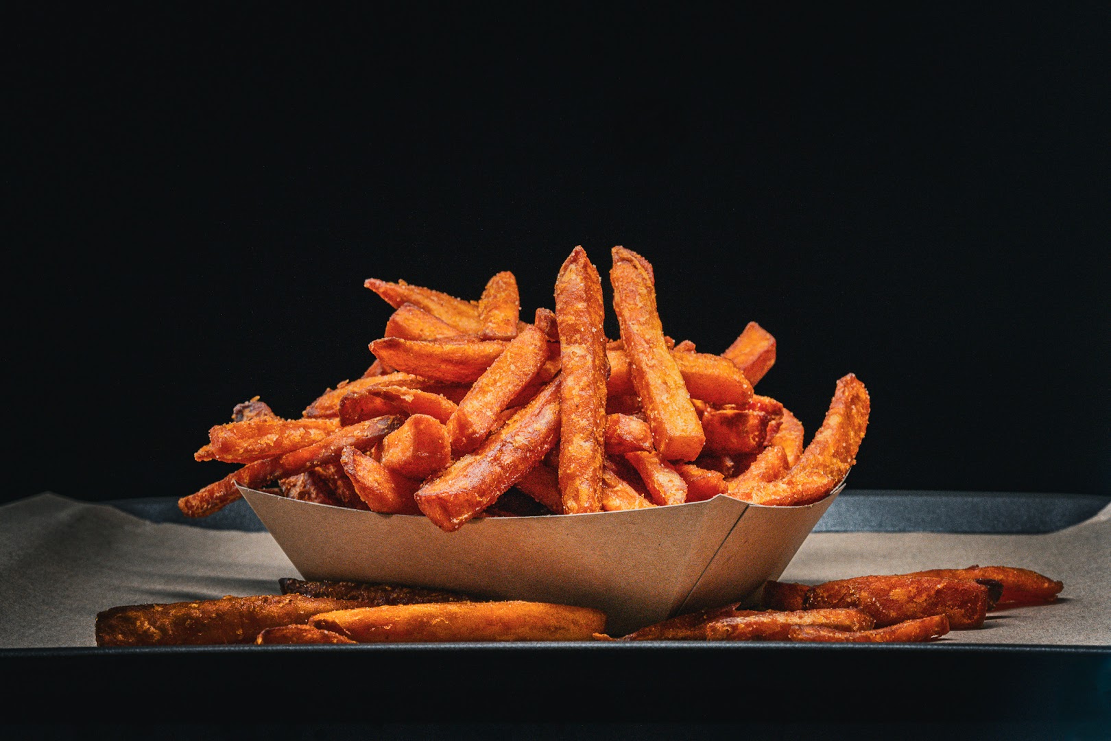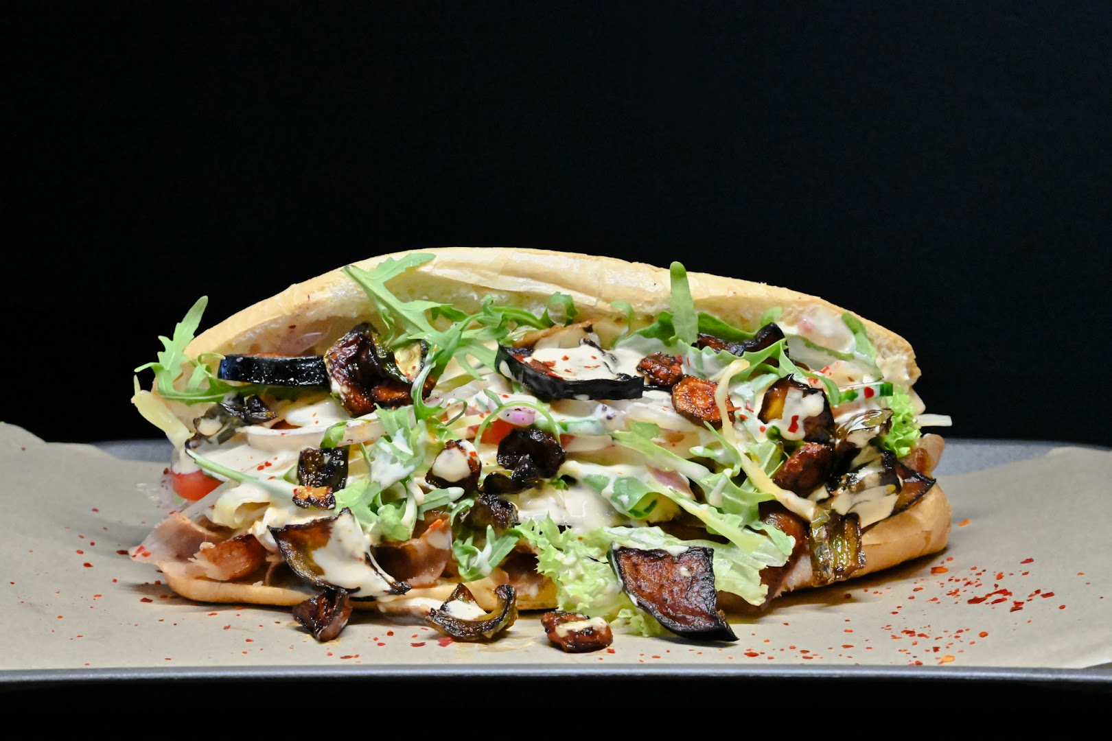 Блюдо: Brothers BBQ Döner. Описание блюда: Gegrilltes Dönerfleisch im hausgemachten Brot, ergänzt um Pastrami, Tomaten, Zwiebeln, Jalapeños, frittierte Zwiebelringe und BBQ-Sauce. Serviert mit Currywurst, knusprigen Pommes und einem Getränk nach Wahl.