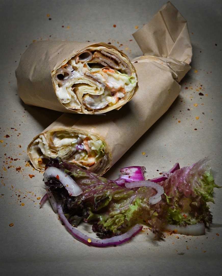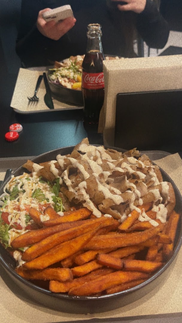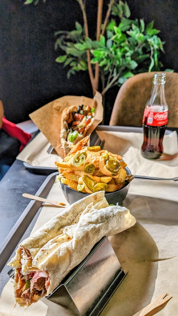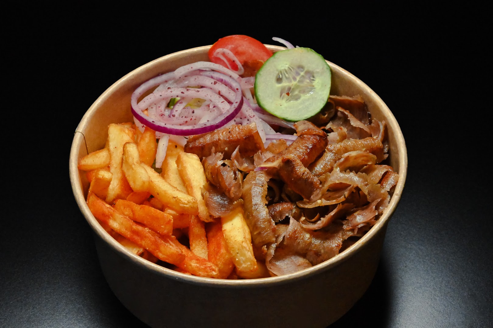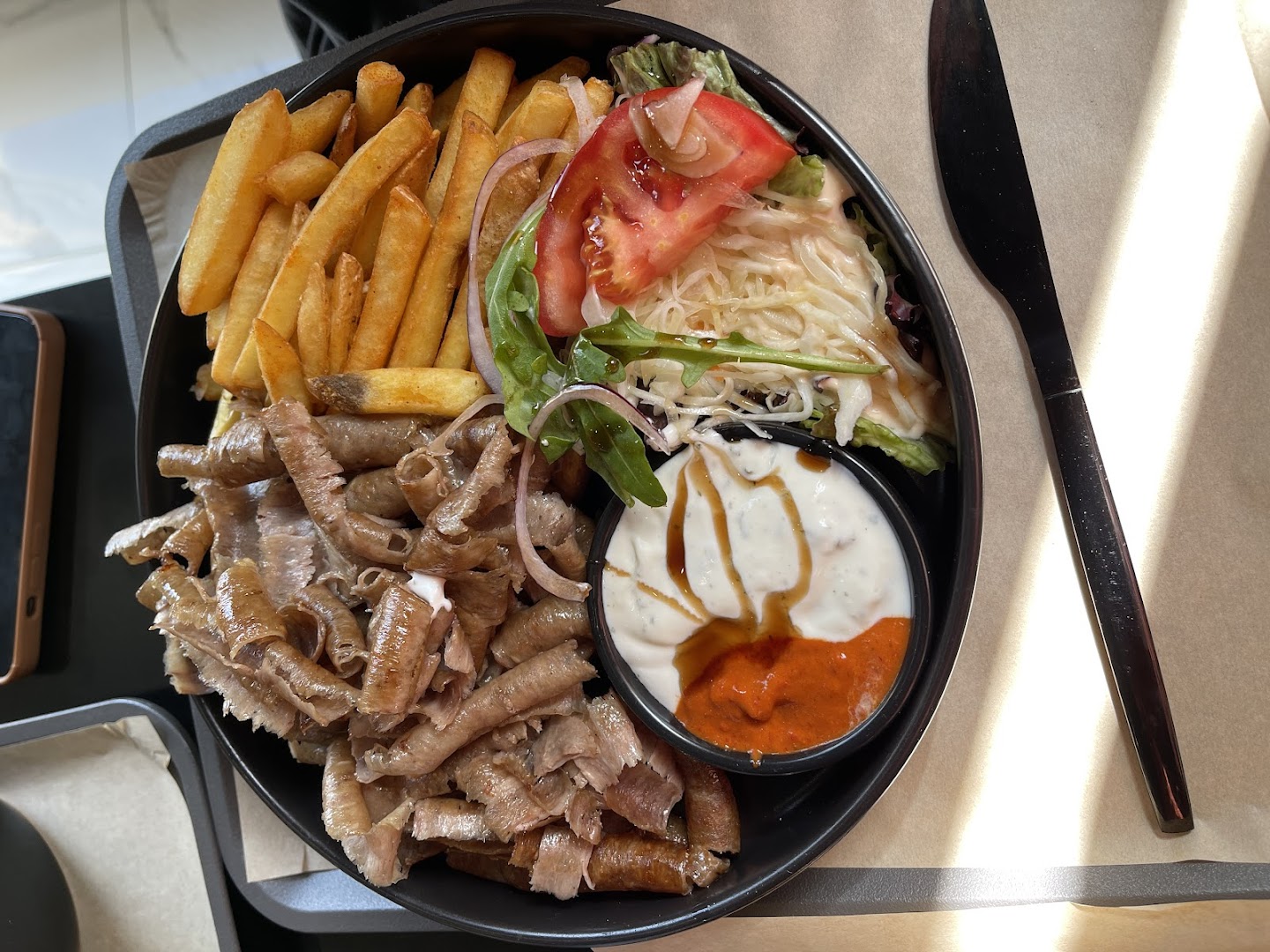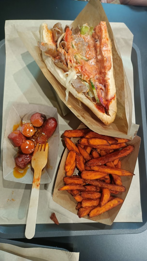 Блюдо: Brothers Döner. Описание блюда: Gegrilltes Dönerfleisch im hausgemachten Brot mit Salat, dazu Currywurst und Pommes mit Sauce nach Wahl sowie einem Drink.