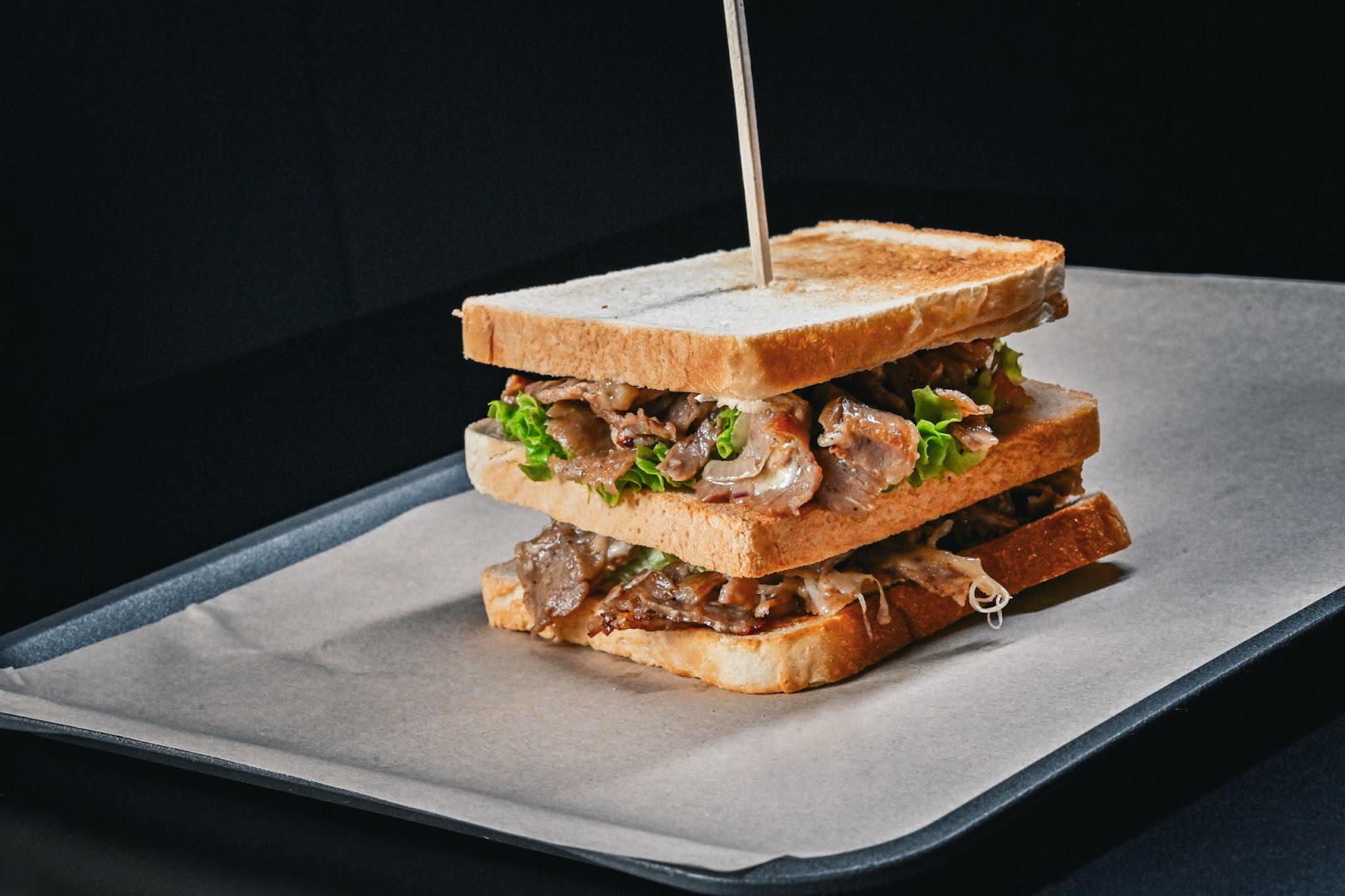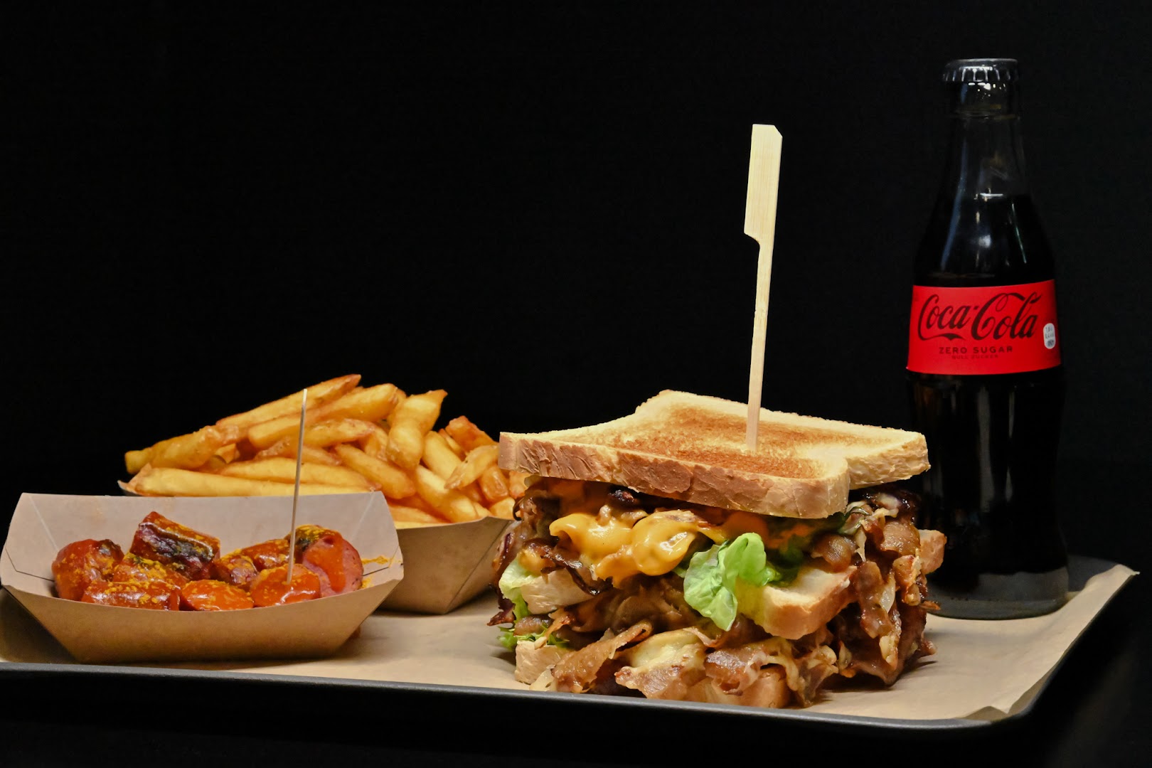 Блюдо: Brothers Toast. Описание блюда: Gegrilltes Dönerfleisch im Toast mit zwei Sorten Käse, Zwiebeln und Sauce deiner Wahl, dazu eine Currywurst, Pommes und ein Getränk.