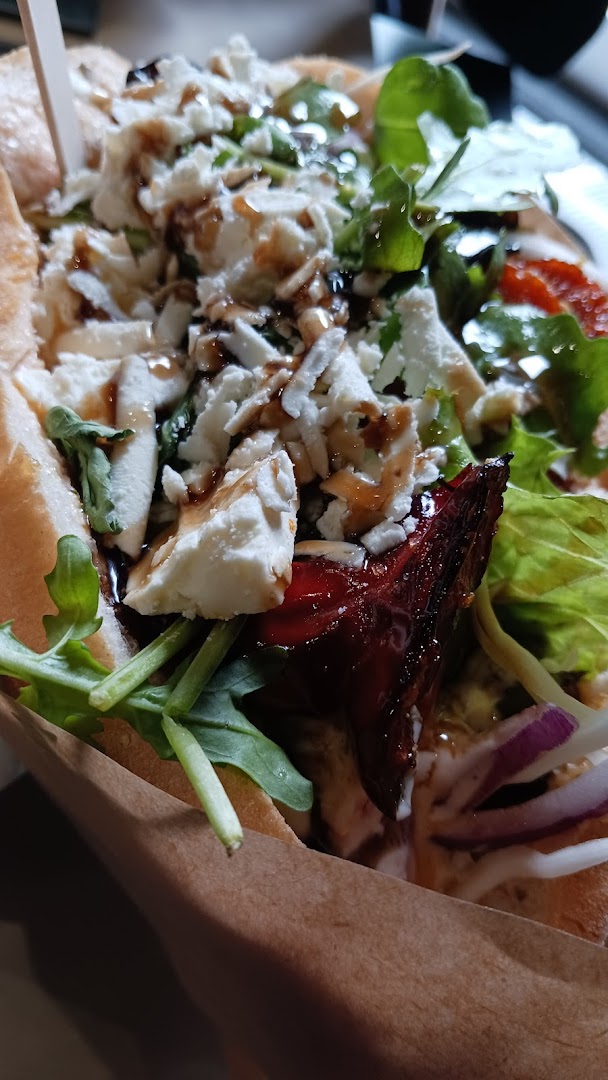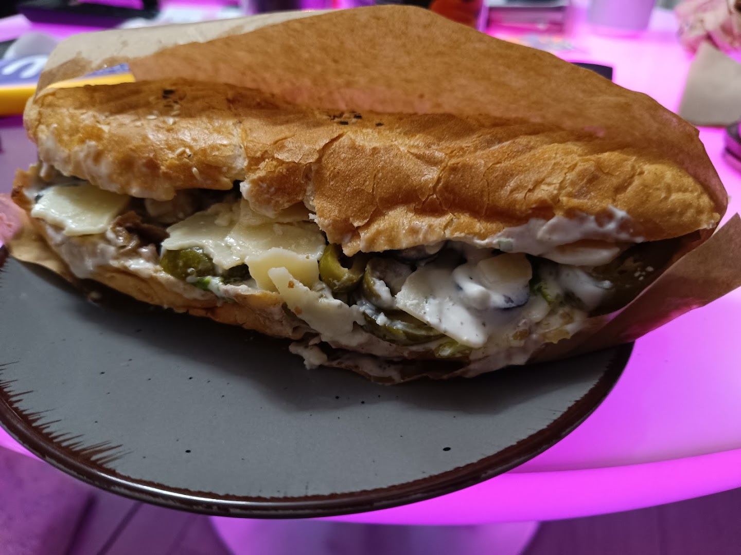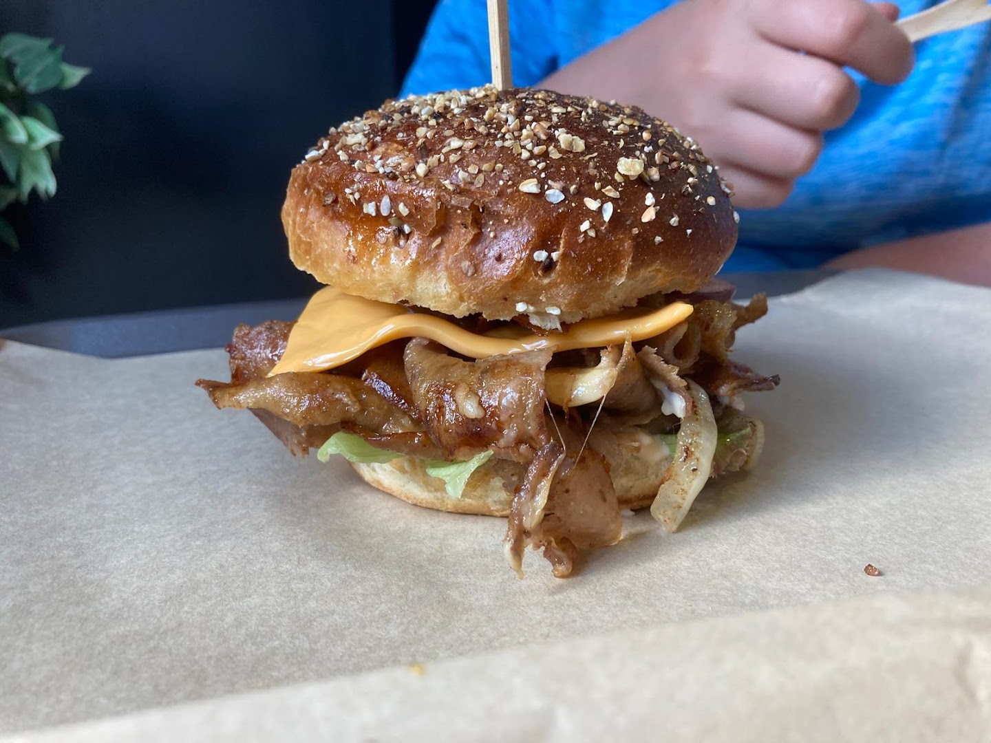 Блюдо: Say Cheese. Описание блюда: Gegrilltes Dönerfleisch in hausgemachtem Brot, kombiniert mit zwei Sorten Käse, roten Zwiebeln, Salat und einer Sauce nach Wahl.