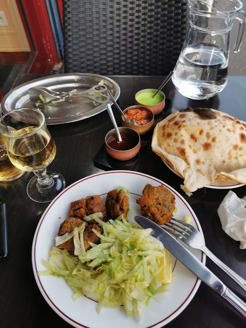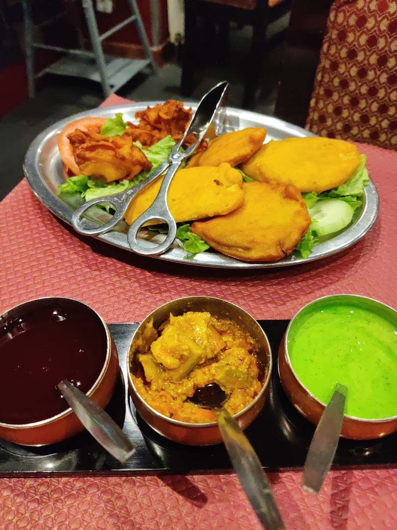 Блюдо: Mix pakora. Описание блюда: Beignets d'aubergines, pommes de terre et oignons aux différentes épices, préparés marinés avec différentes épices et puis frits.