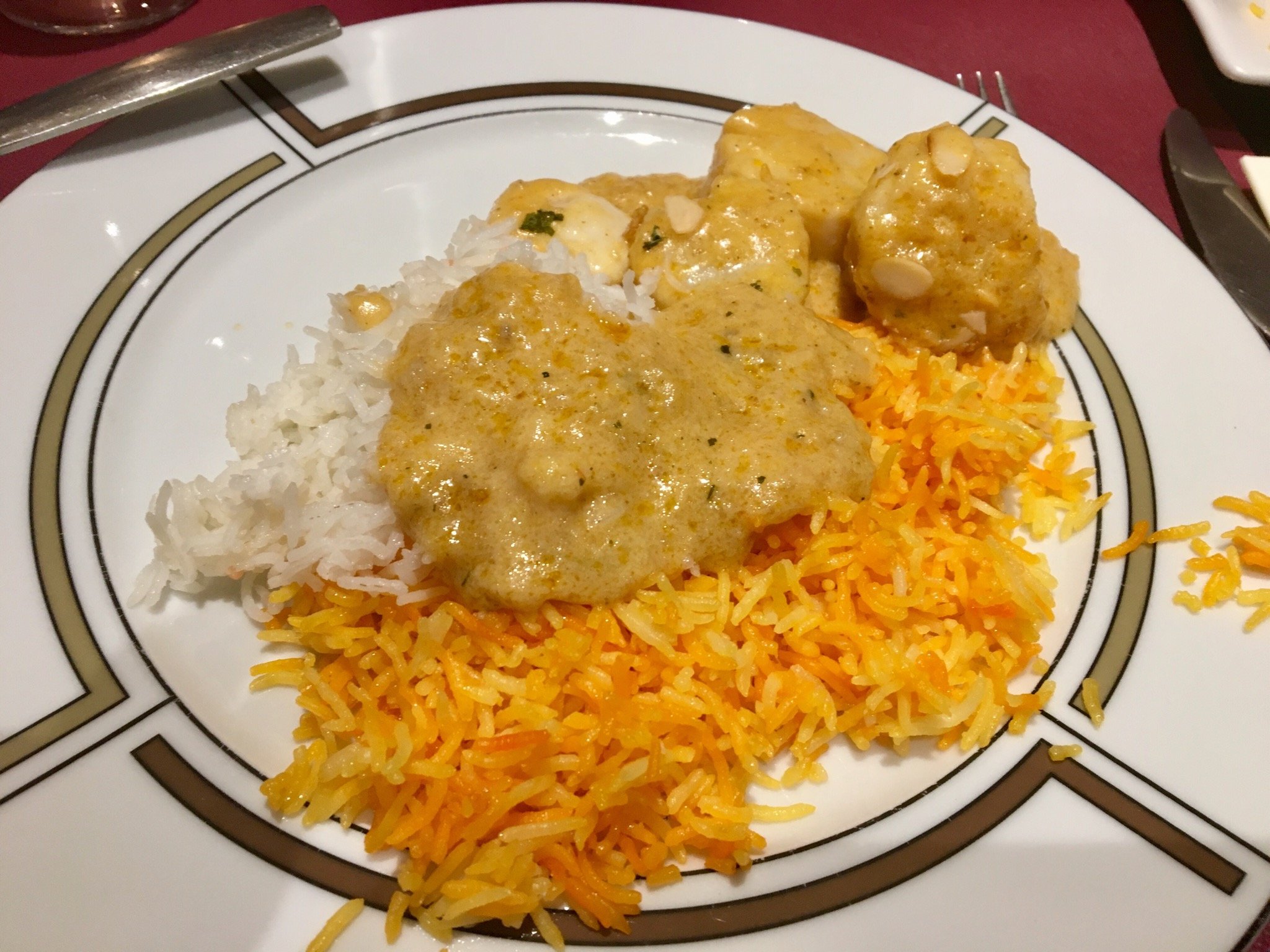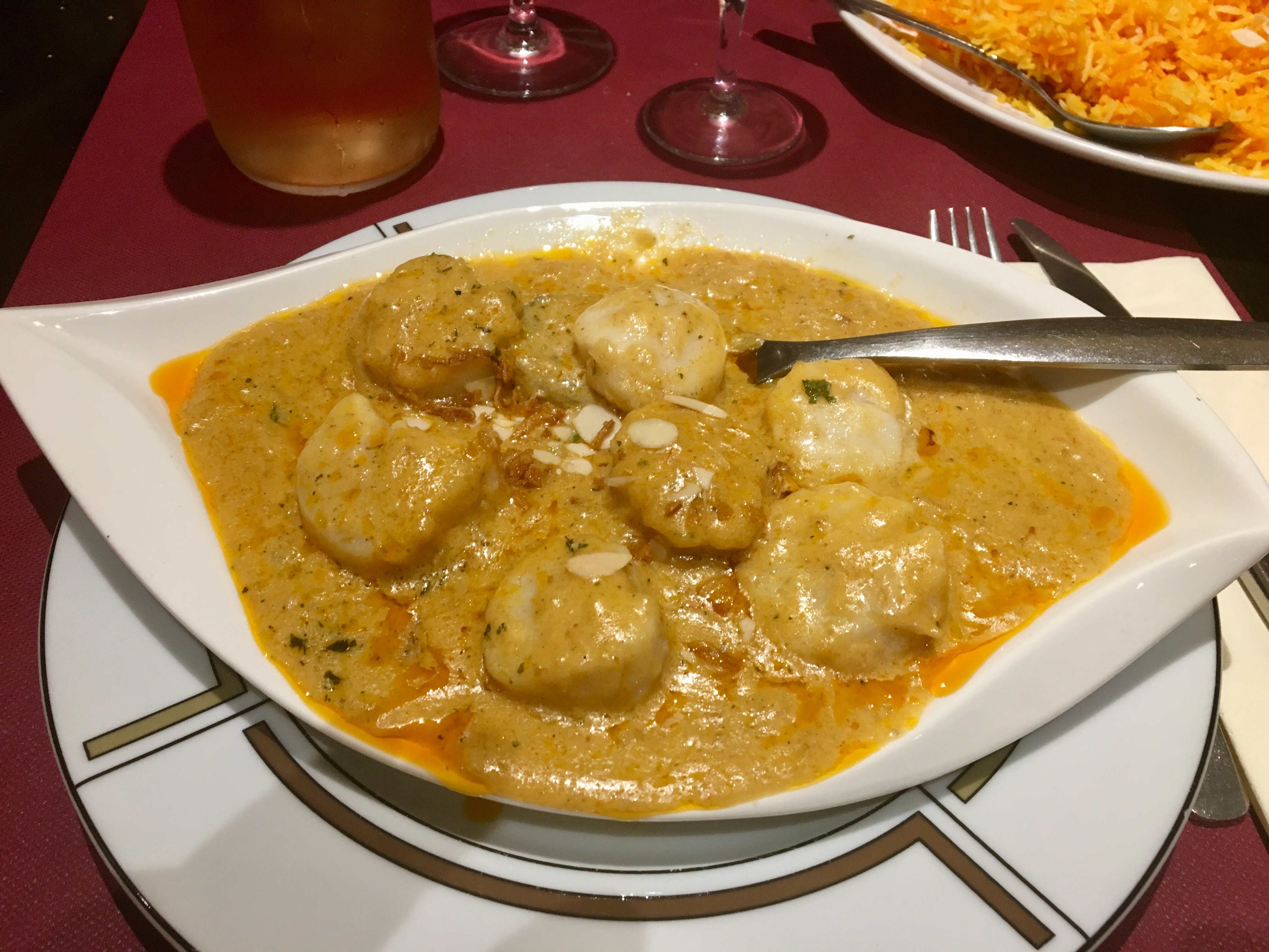 Блюдо: Biryani Le Gan'ge. Описание блюда: Plat traditionnel à base de riz basmati, agneau, poulet, crevettes, noix de cajou, raisins secs et épices spéciales.