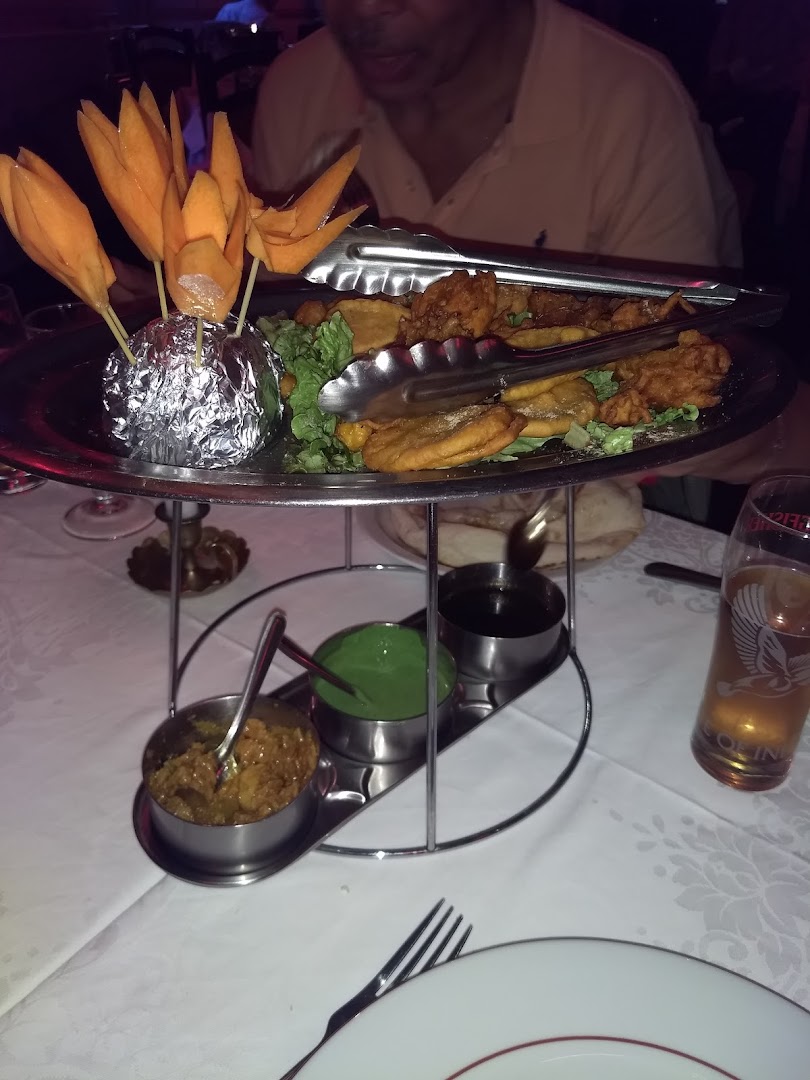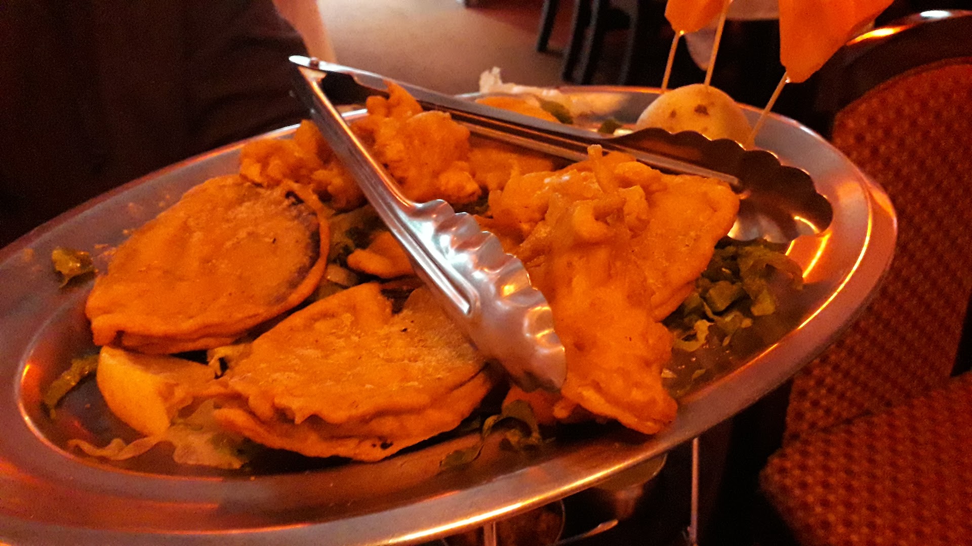 Mélange de morceaux de poisson, poulet, agneau, sheekh kabad, oignons baja et beignet d'aubergines.